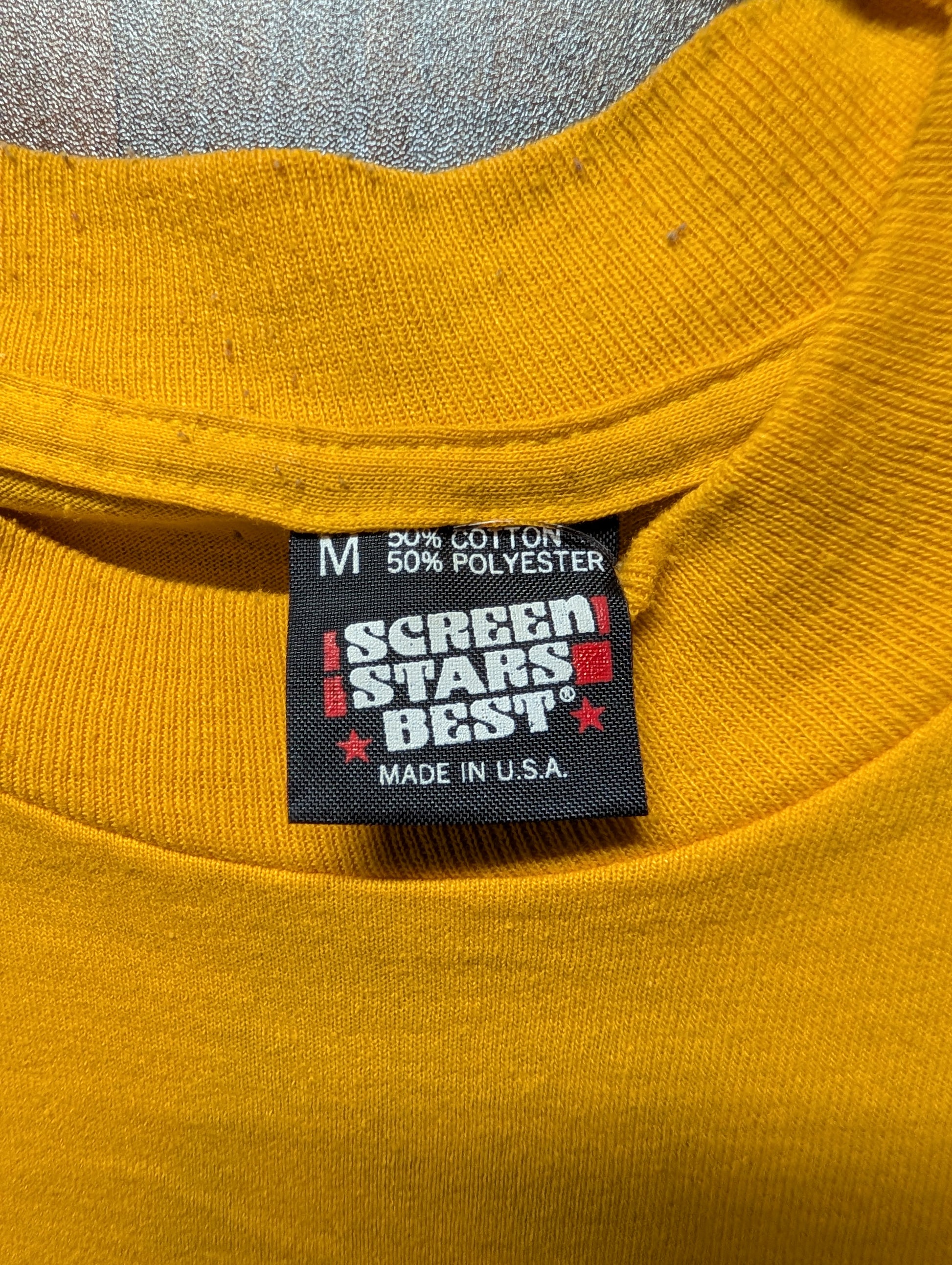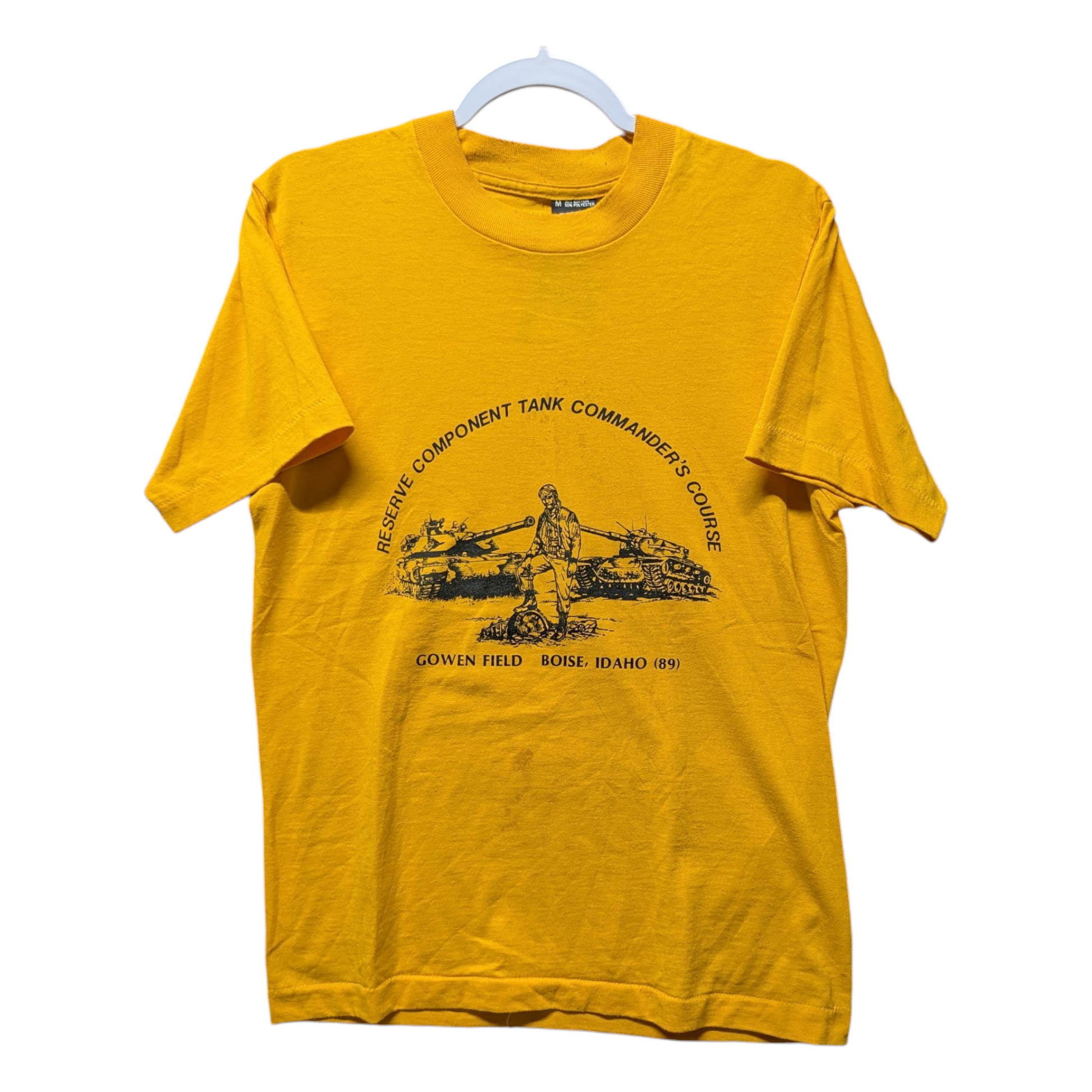 Description: Vintage 1989 Military Tank Commanders Course T Shirt, front graphic only, yellow and black, Gowen Field Boise Idaho, Marine and Army, Reserve Component