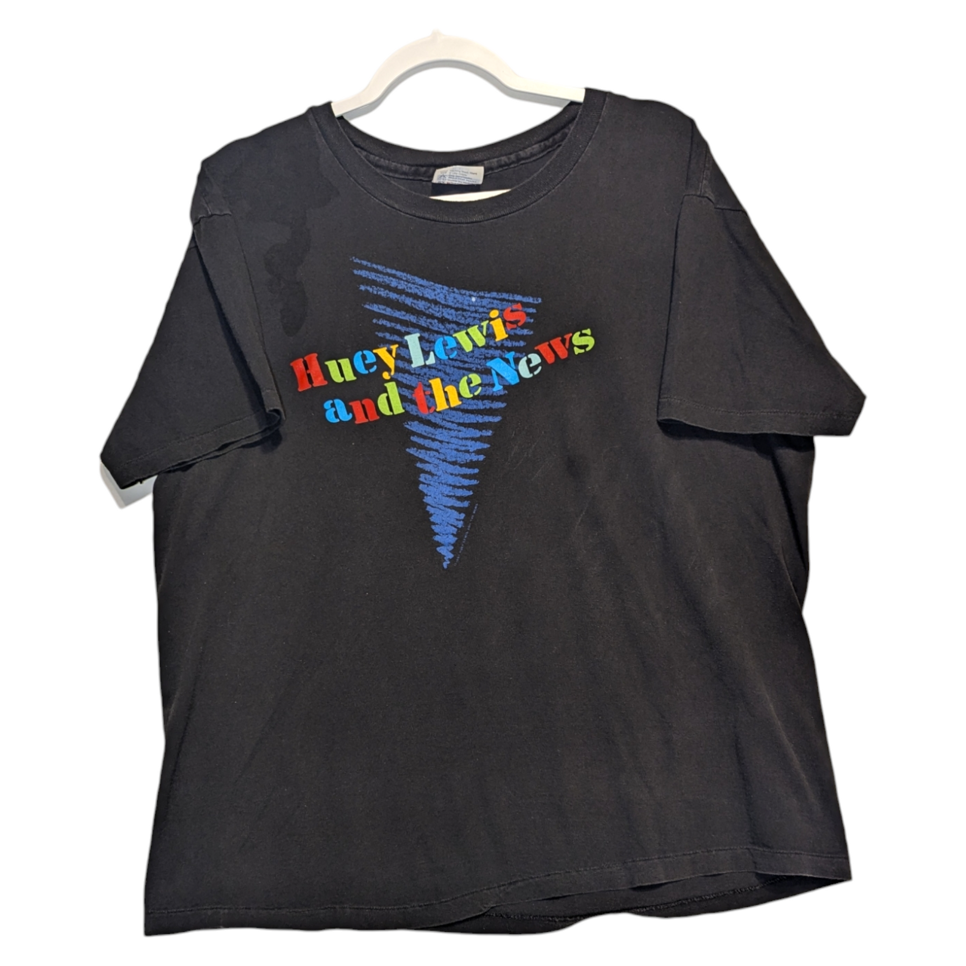 Description: Vintage 1991 Huey Lewis and the News tour t shirt, front and back graphic, rainbow spellout, Budweiser hit on the back, black red and multicolor, music band concert tee