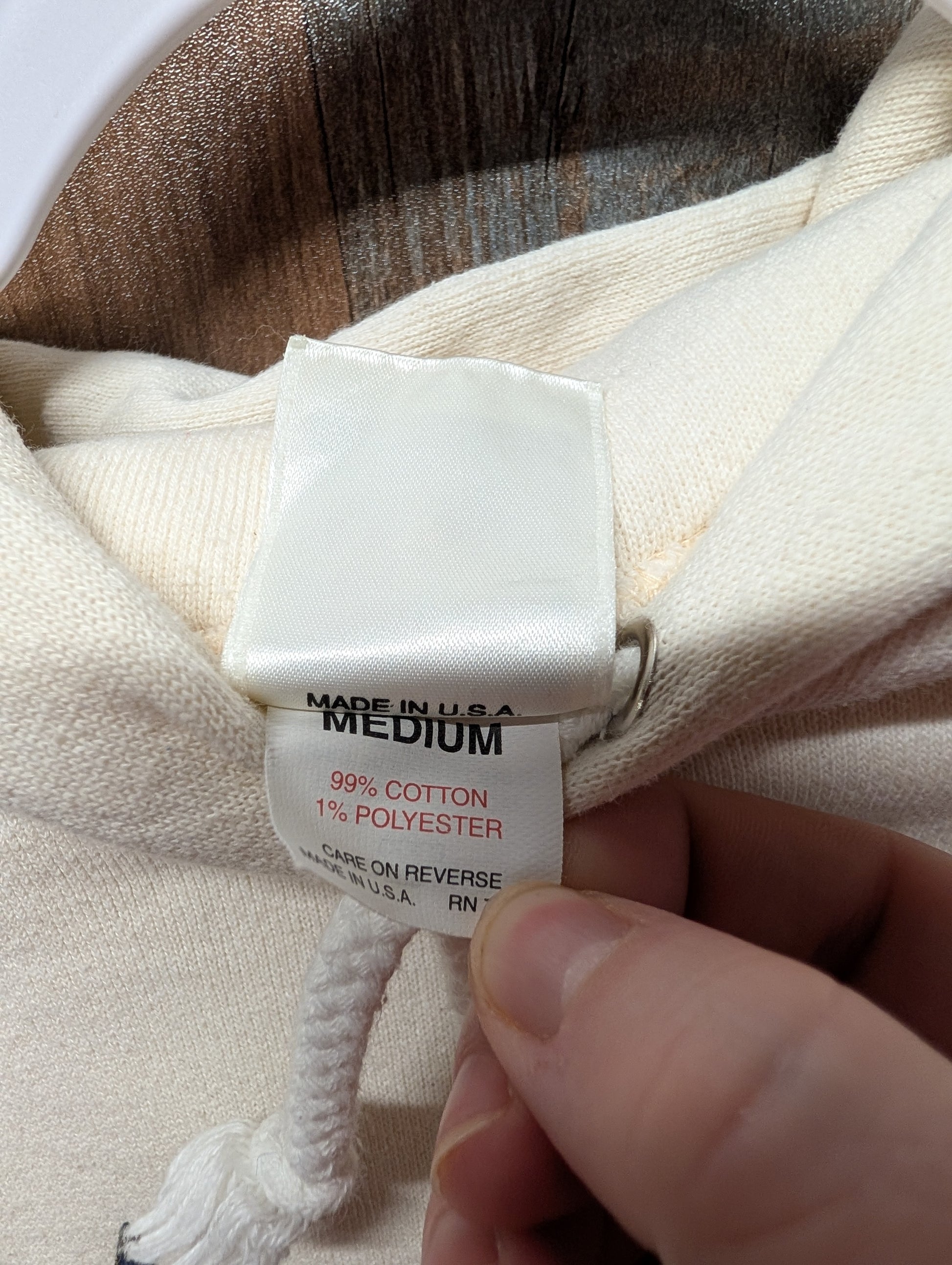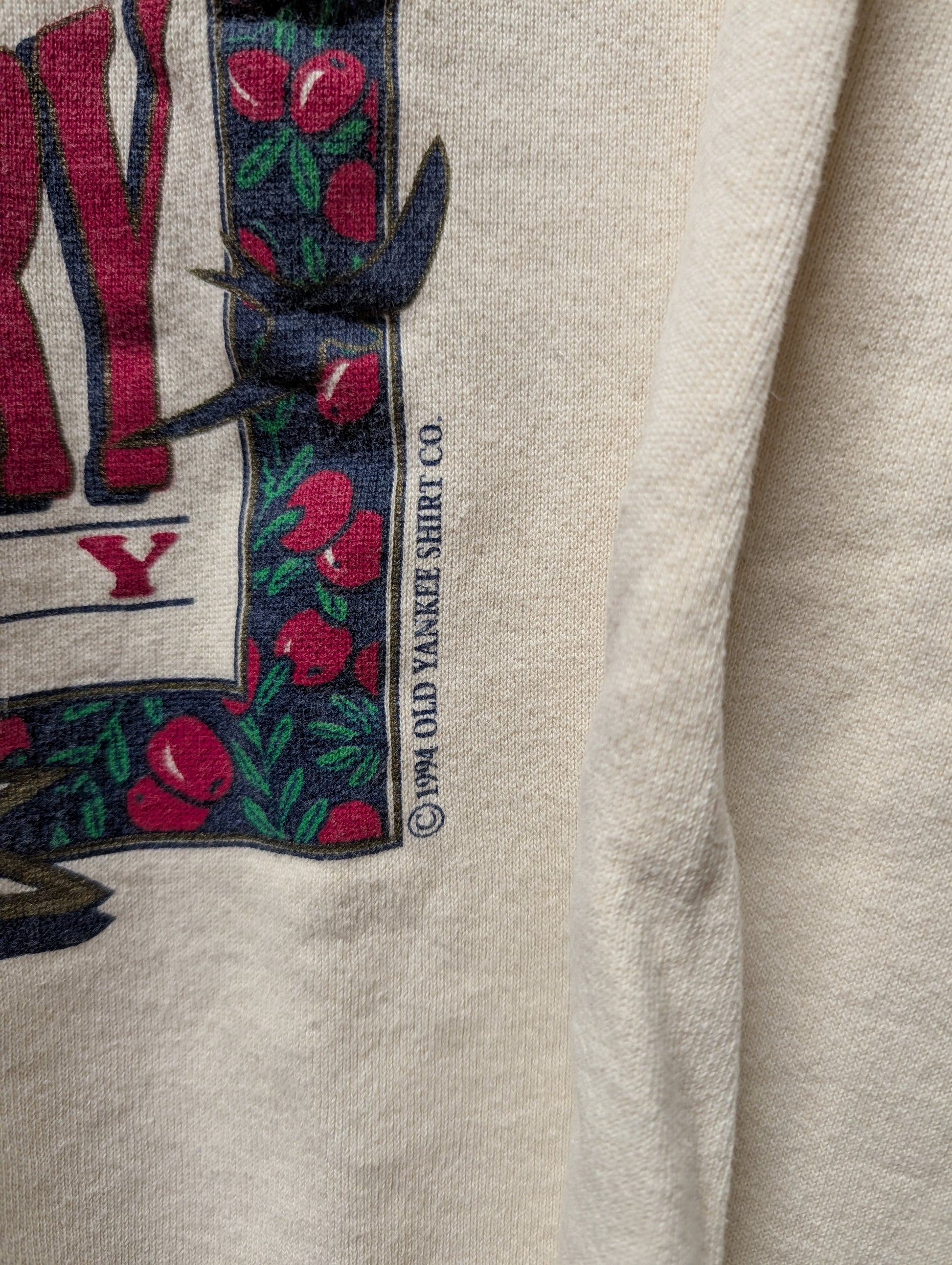 Description: Vintage 1994 New England Cranberry Company Hoodie Sweatshirt, Front graphic only, cream red and blue, Cape Cod Mass, Company Promo, food product, Old Yankee Shirt Company