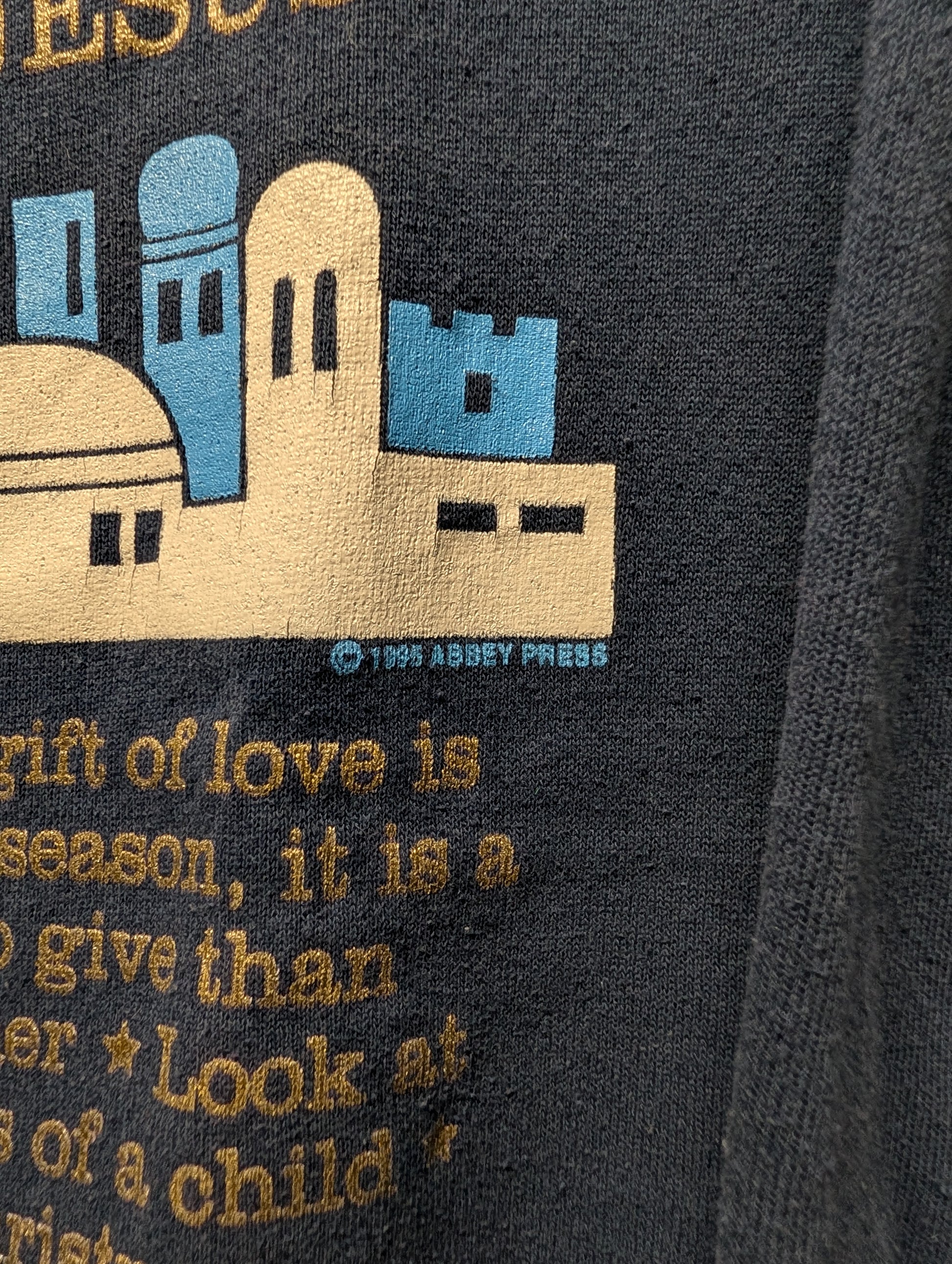 Description: Vintage 1995 Jesus Christmas Crewneck Sweatshirt, front graphic only, blue white and gold, All I know about Christmas I learned from Jesus, Abbey Press, Christian Sweater, Cute, Religious crewneck, Holiday, perfect for Winter, Christianity, God