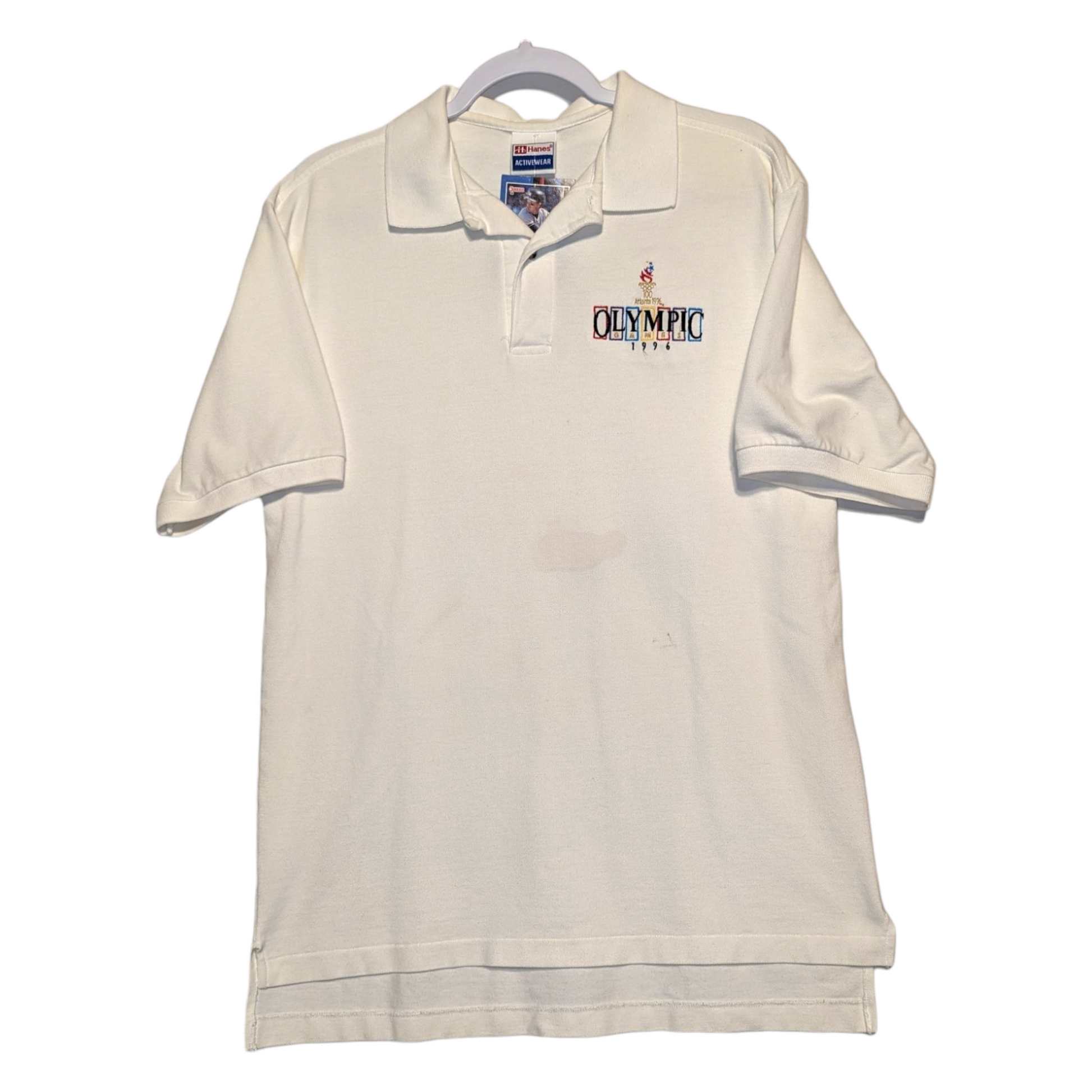 Description: 1996 Atlanta Olympic Games polo shirt, embroidered graphic, sports polo shirt