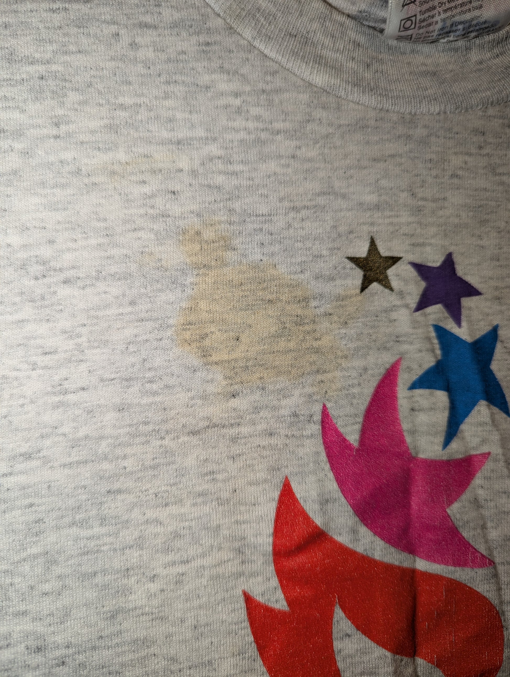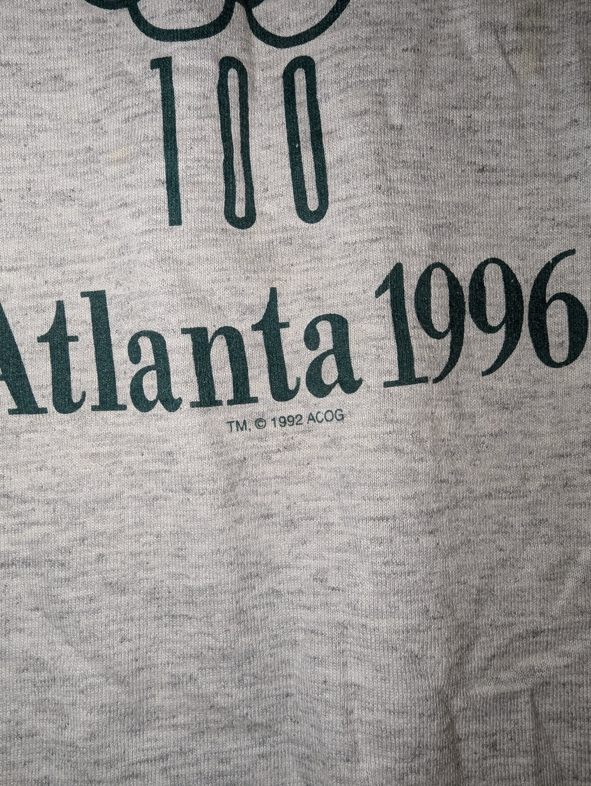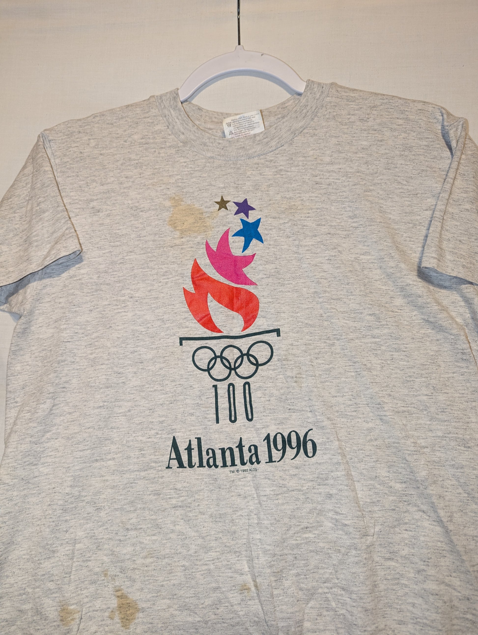 Description: Vintage 1996 Atlanta Olympic Youth t shirt, front graphic only, torch flame logo, gray red and pink, sports tee