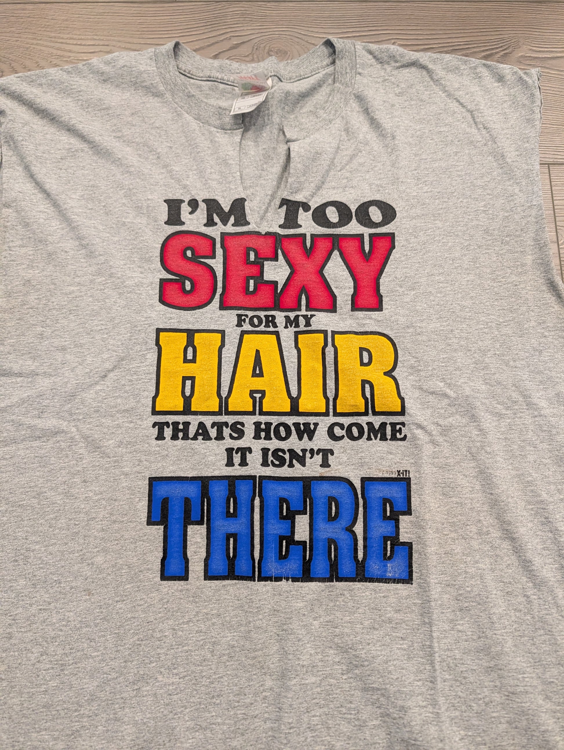 Description: 1999 I'm Too Sexy For My Hair That's How Come It Isn't There Dad Humor Graphic T shirt, Black Red yellow Blue, Large Font Letters, Dad bod, Bald Joke, Cut off, Tank Top,