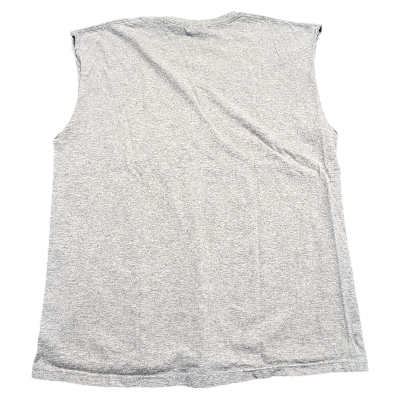 Condition: V Cut neck and cut off sleeves, some fading to the graphic, pin hole on back, staining in right pit and front, thrashed, distressed