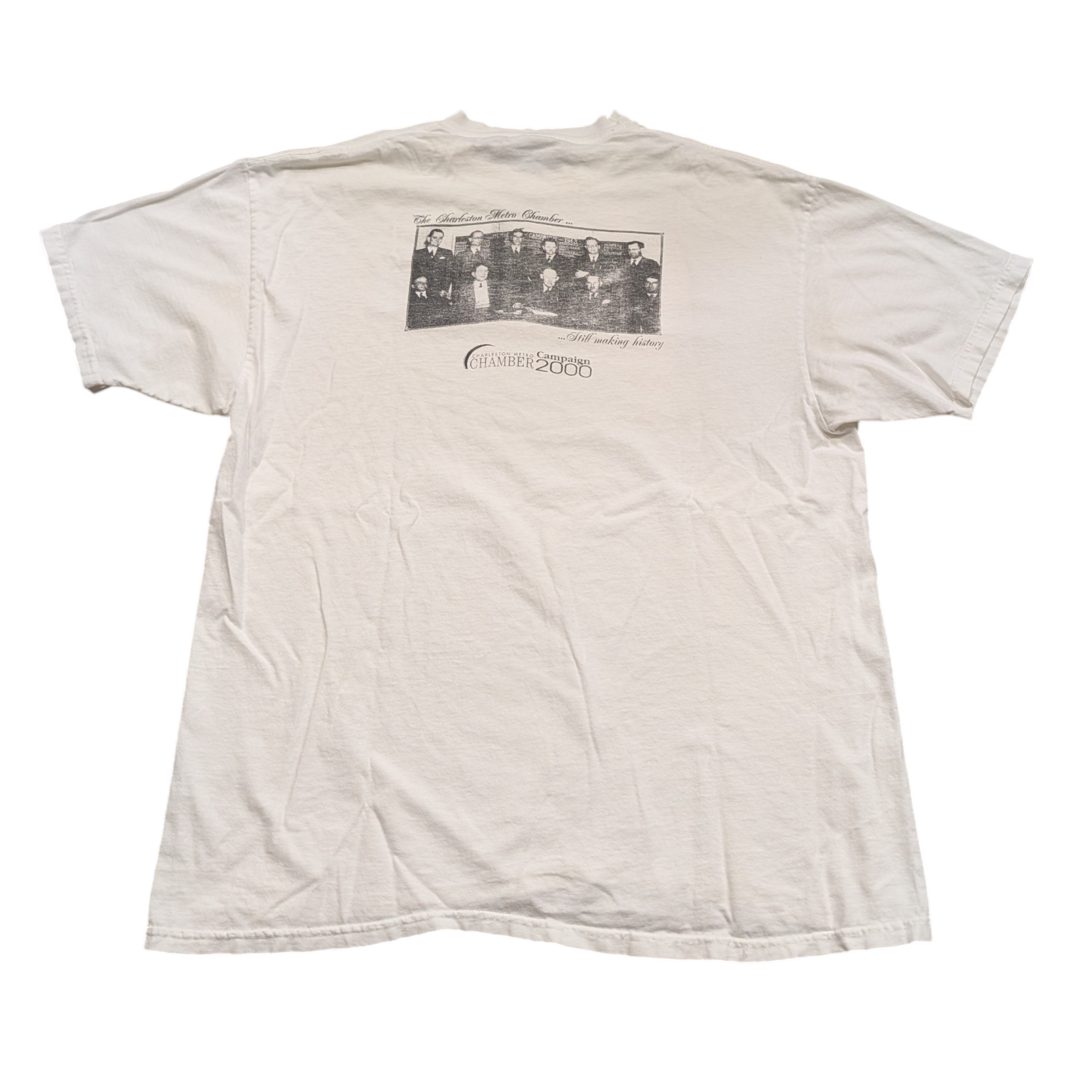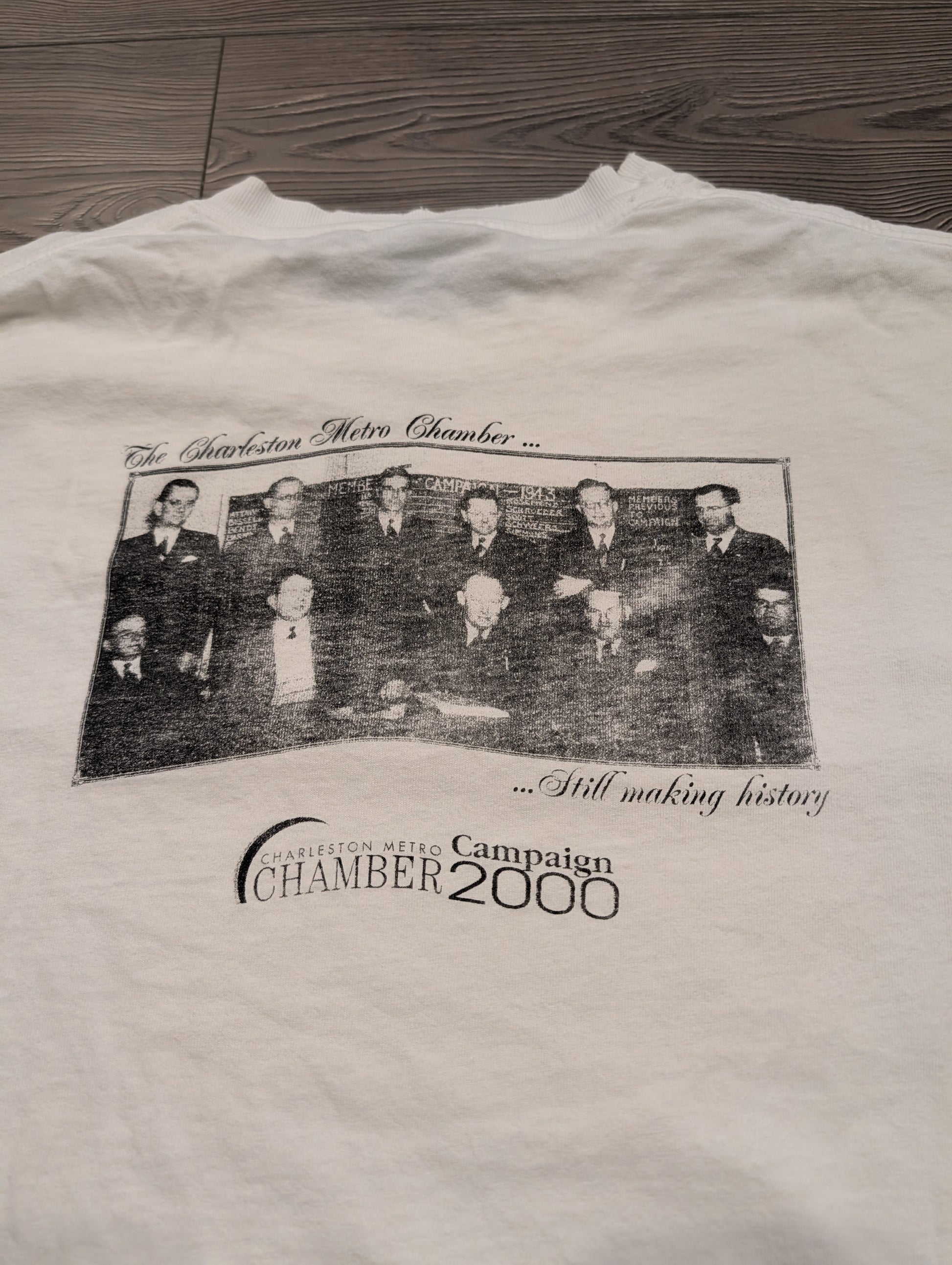 Description: Vintage 2000 The Charleston Metro Chamber T shirt, white, Campaign, "Still Making History", Board Members, Traveling through time with the chamber,