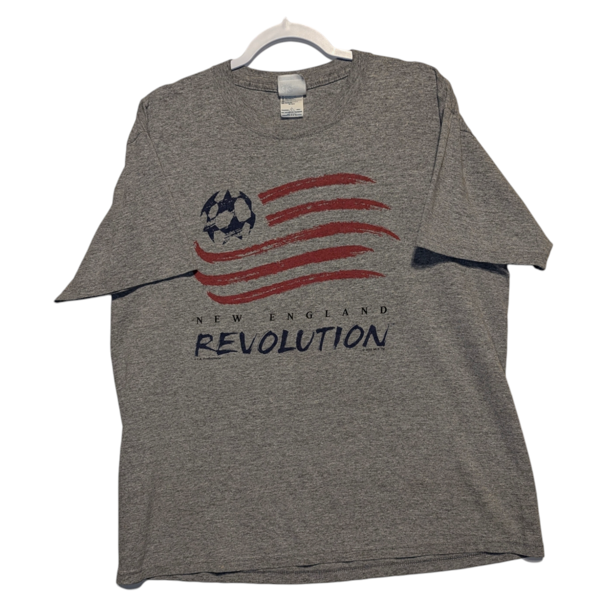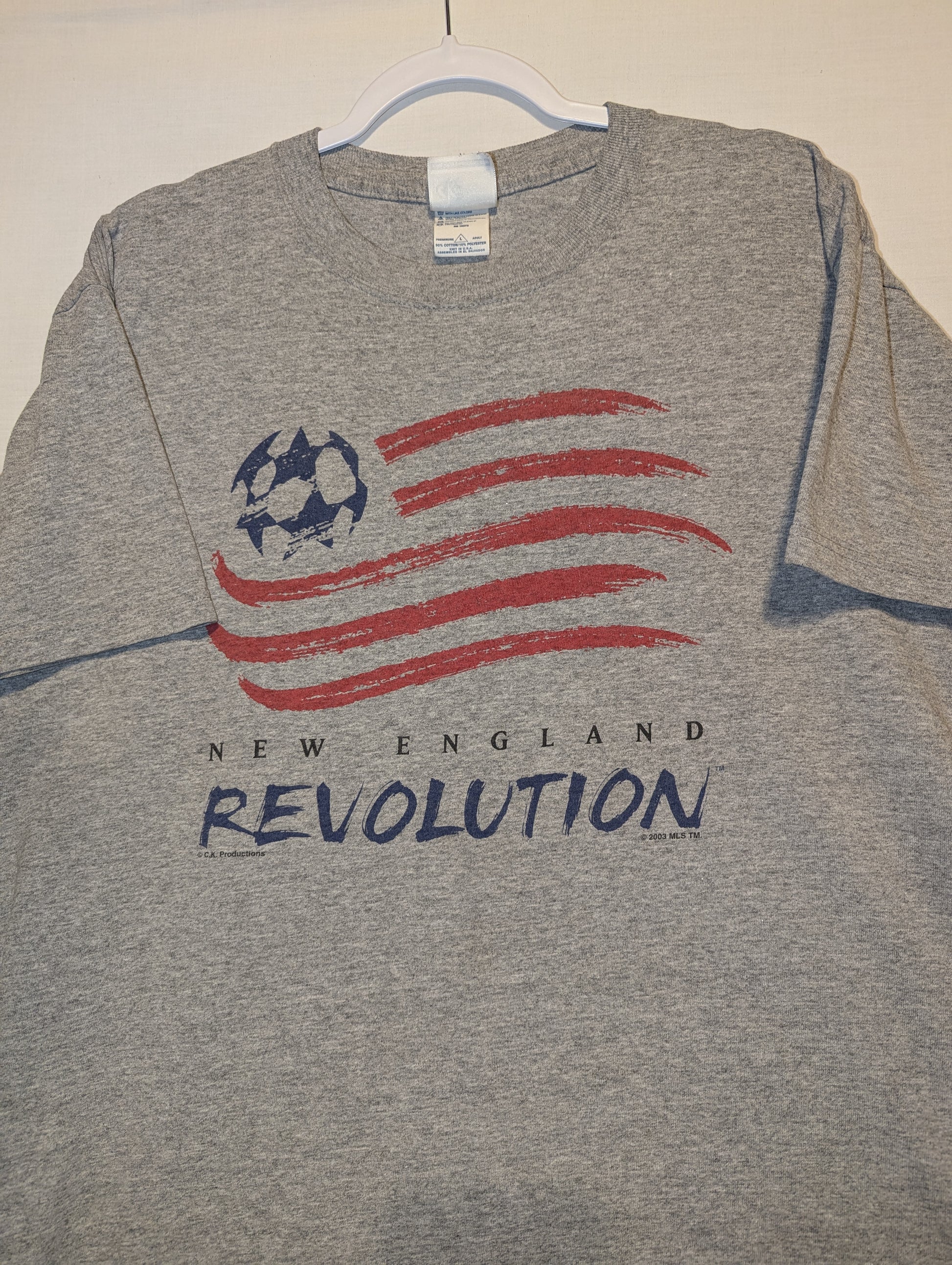 Description: Vintage 2003 New England Revolution MLS Soccer t shirt, front and back graphic, Football Sports tee, gray red and blue, flag logo