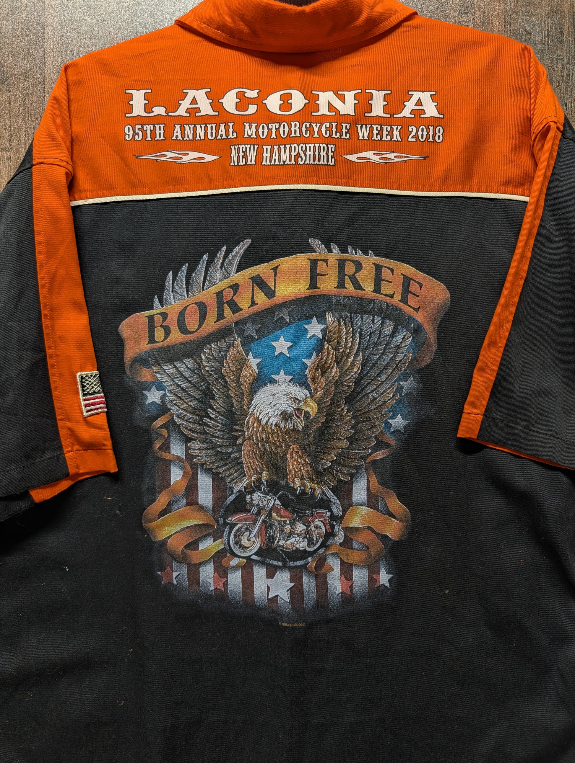 Description: 2018 Laconia Born Free Motorcycle Week Button Up Shirt, front and back graphic, orange and black, 95th annual event, New Hampshire, big Bald Eagle on the back, USA Flag patch on the sleeve, biker shirt, short sleeve, great for layering, Great for a Harley Davidson Lover