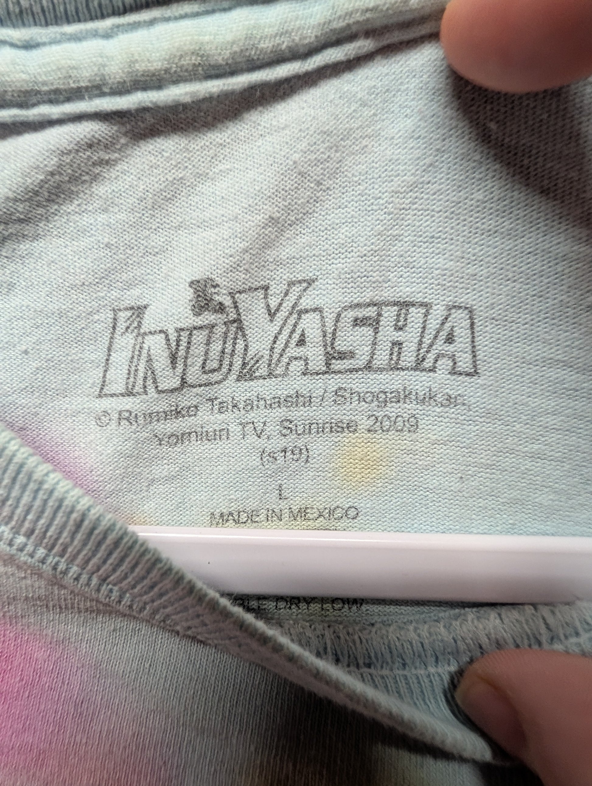 Description: Modern 2019 InuYasha Anime T shirt, front graphic only, tie dye, cartoon animation, manga, Rumiko Takahashi, Shogakukan Yomiuri TV, Sunrise,