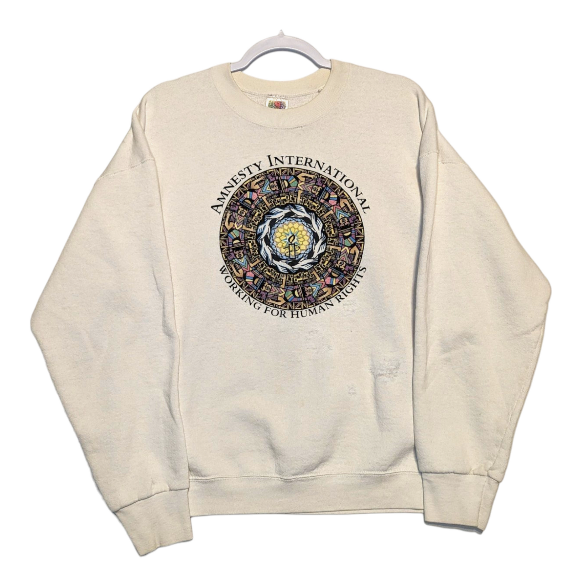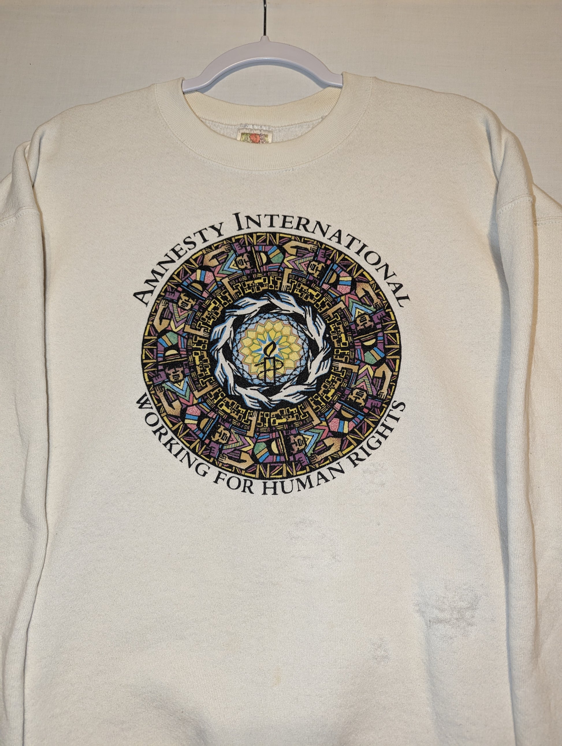 Description: 80s / 90s Amnesty International crewneck sweatshirt, Working for Human Rights, art style sweater, front graphic only