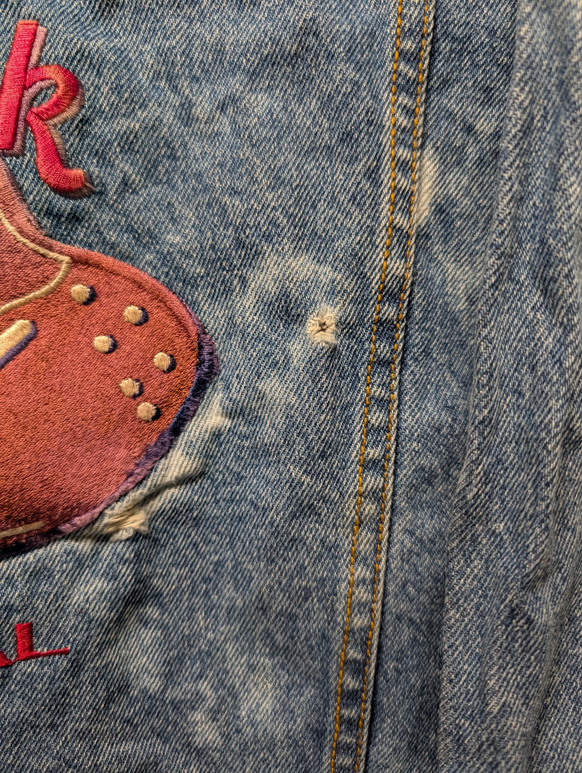 Condition: Has some distressing on the back, bleach marks and a few small holes, good wear
