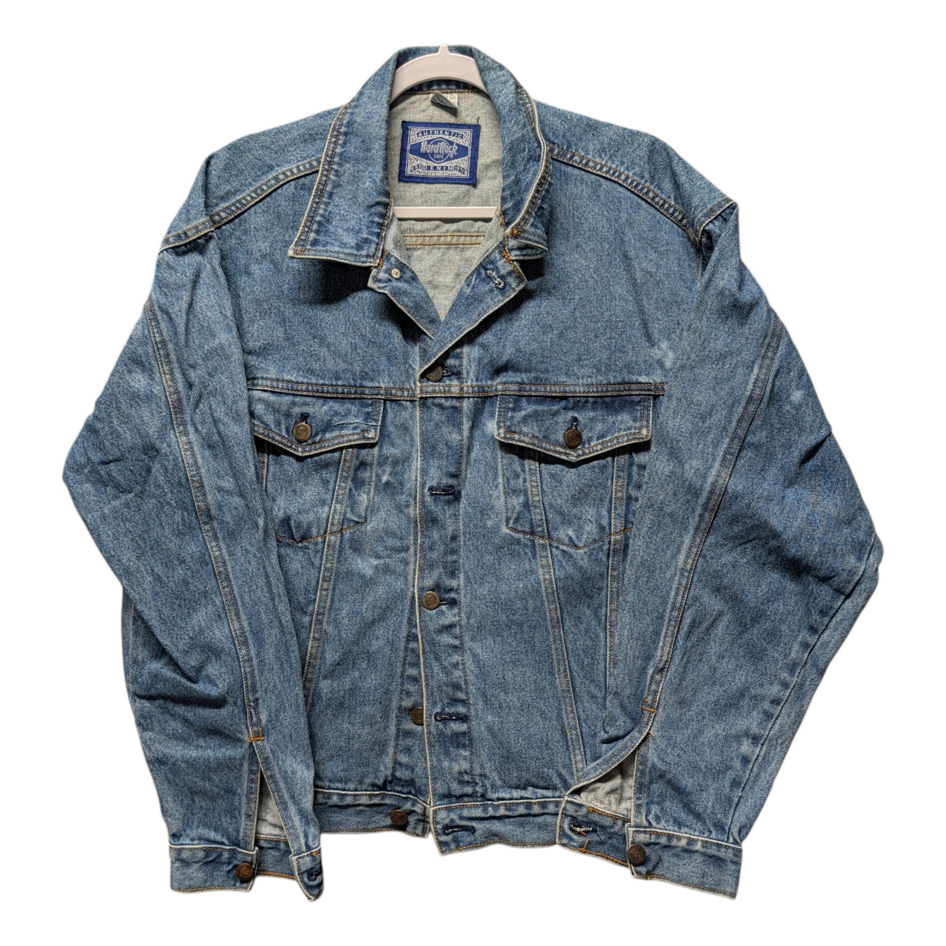 Description: Vintage 80s / 90s Hard Rock Cafe Denim Jacket, classic jean jacket, big embroidered Hard Rock Patch on the Back, Rock and Roll, awesome for layering, restaurant, location, blue and red, Montreal Canada