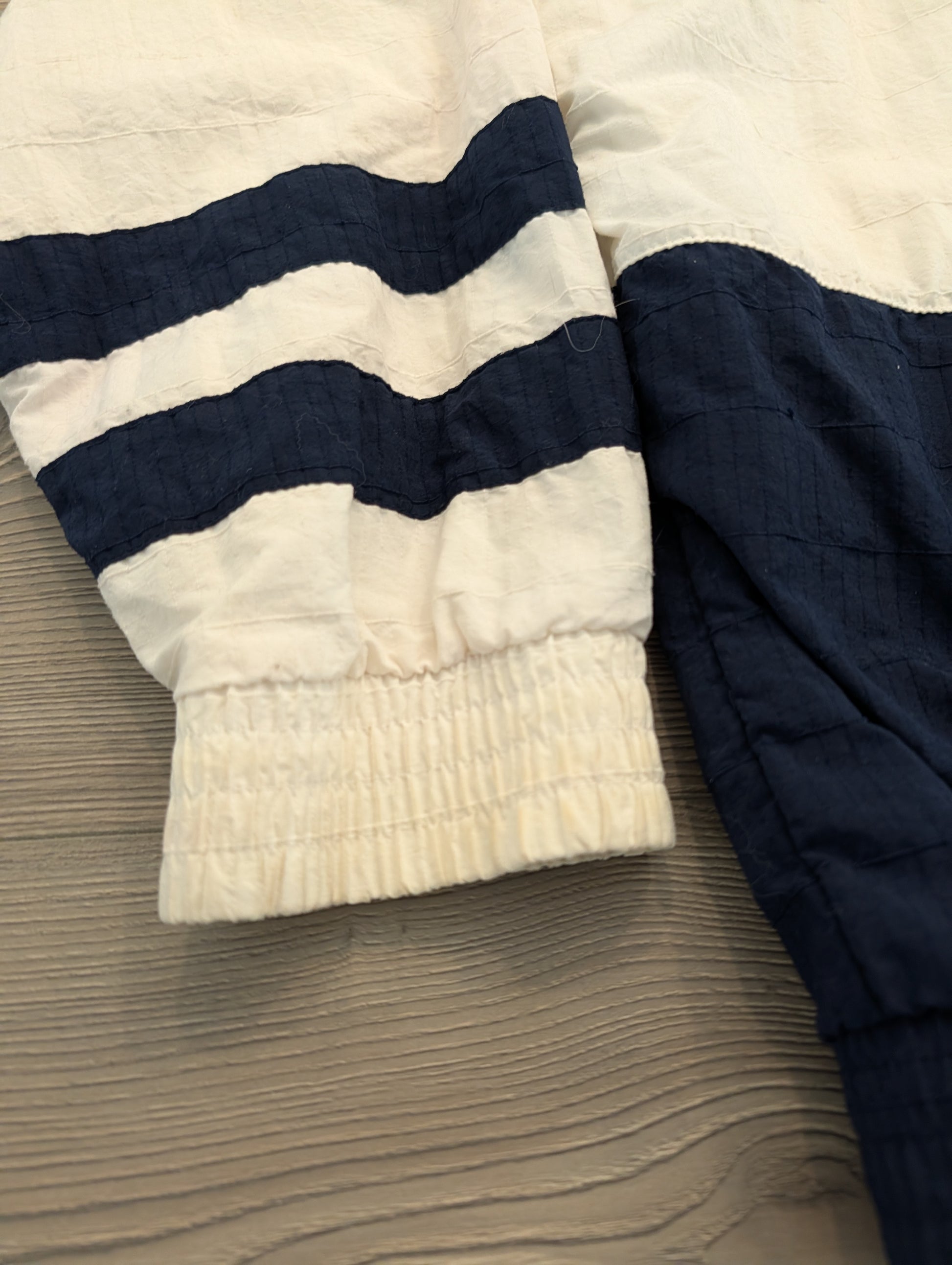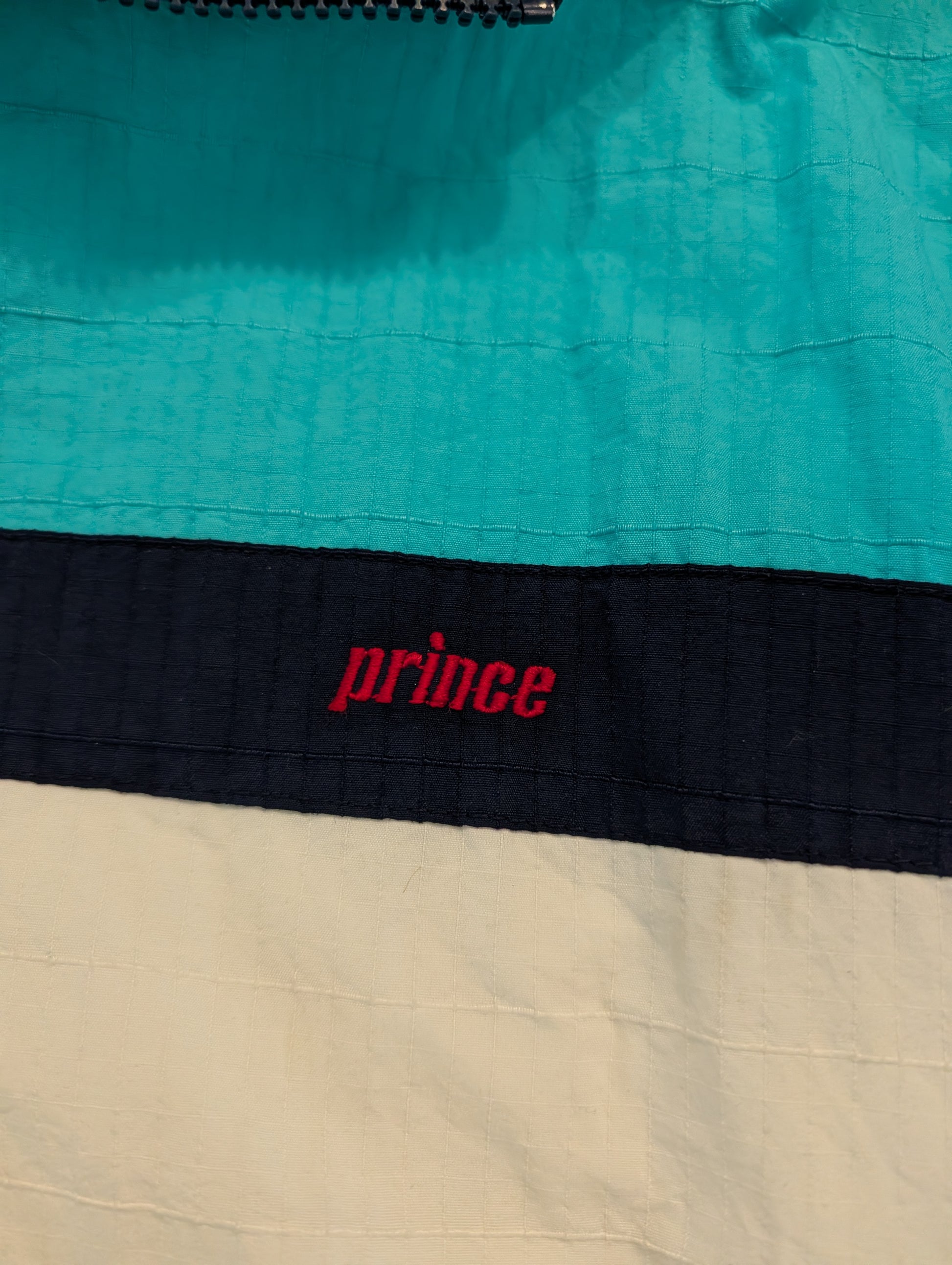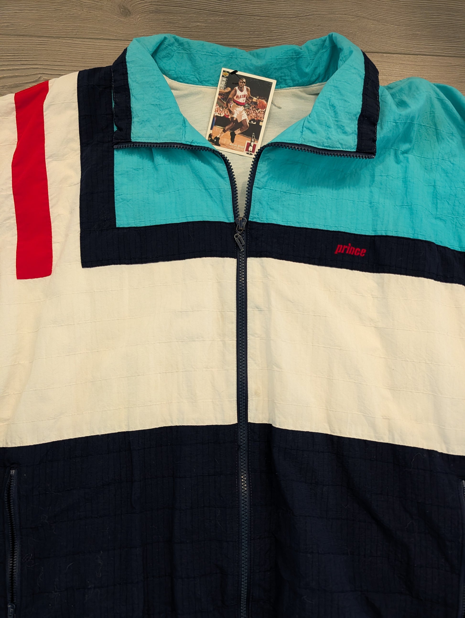 Description: Vintage 80's/90's Prince Full zip windbreaker jacket, Color block, Navy Teal Red and White, 2 zipper pocket, Elastic cuff and waist band, Athletic wear