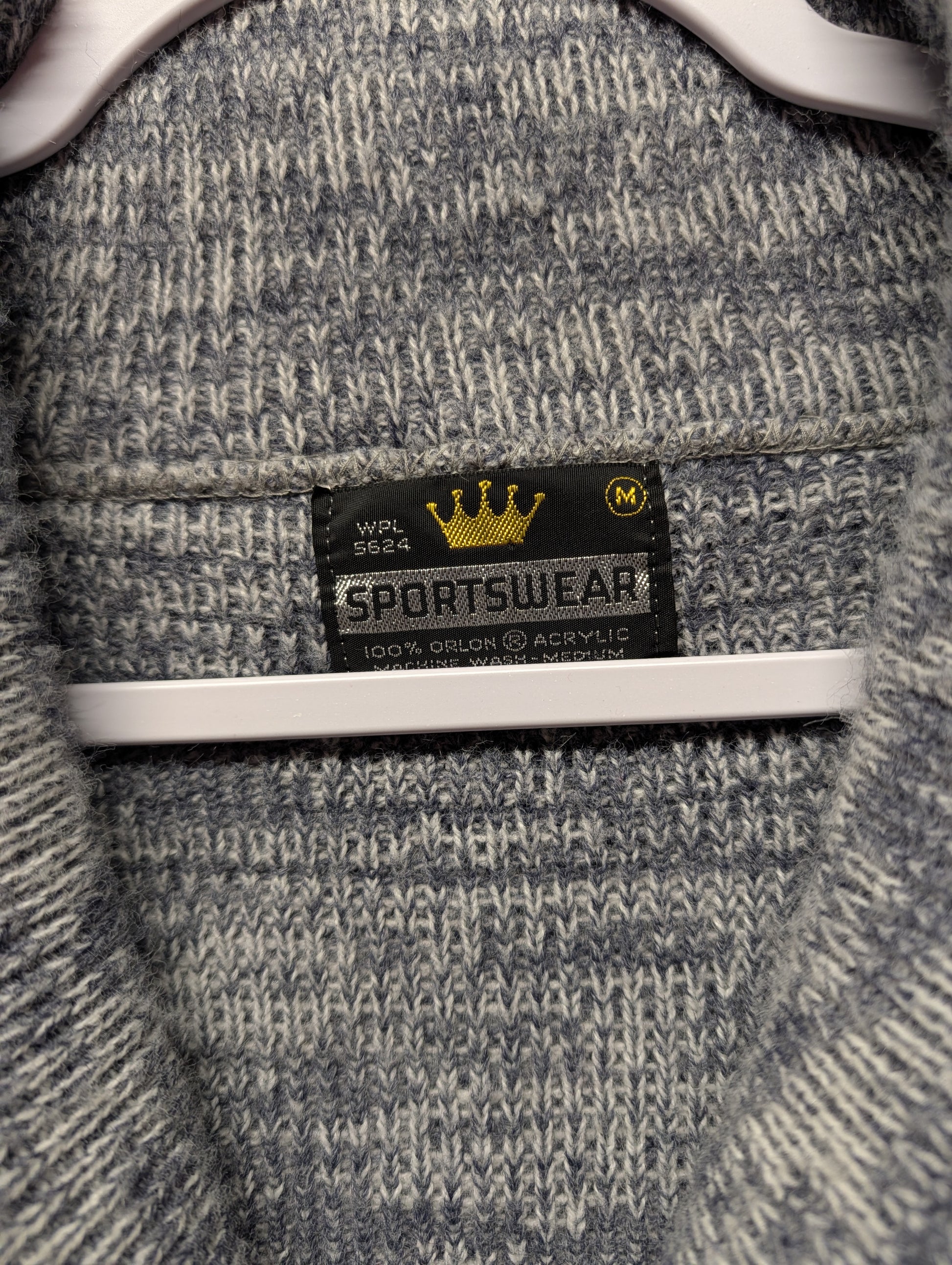 Description: Vintage 80s / 90s Sportswear Horse Knit Cardigan Sweater, big thick collar, Horse design, blue and white, Cute, preppy, grandpa, grandma, grannycore, equestrian sweater great for Fall and Winter