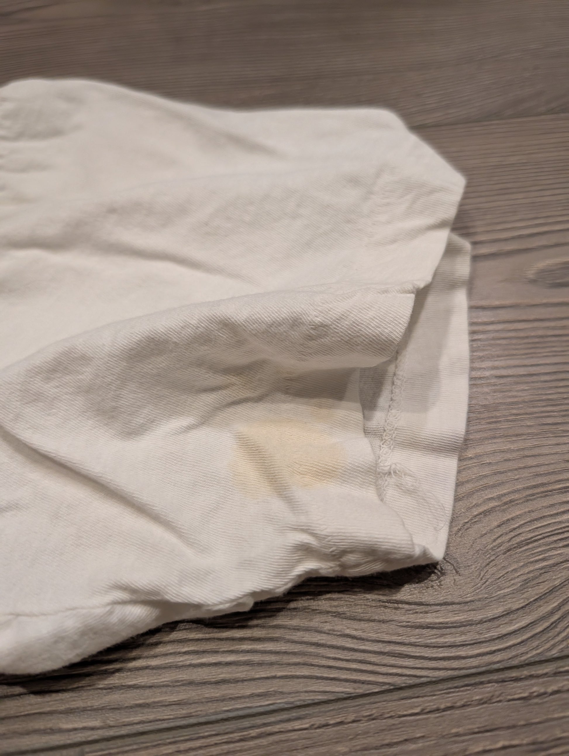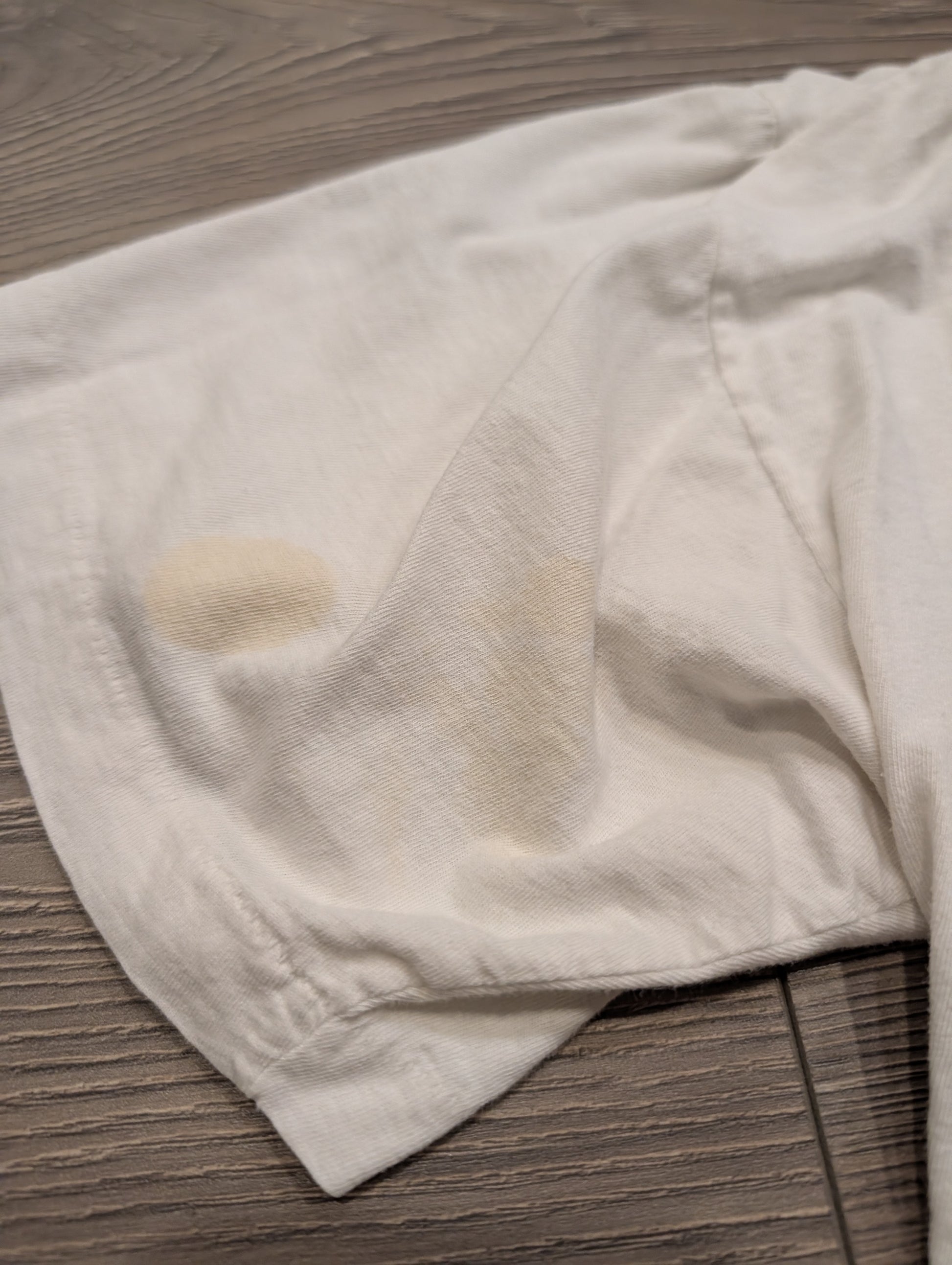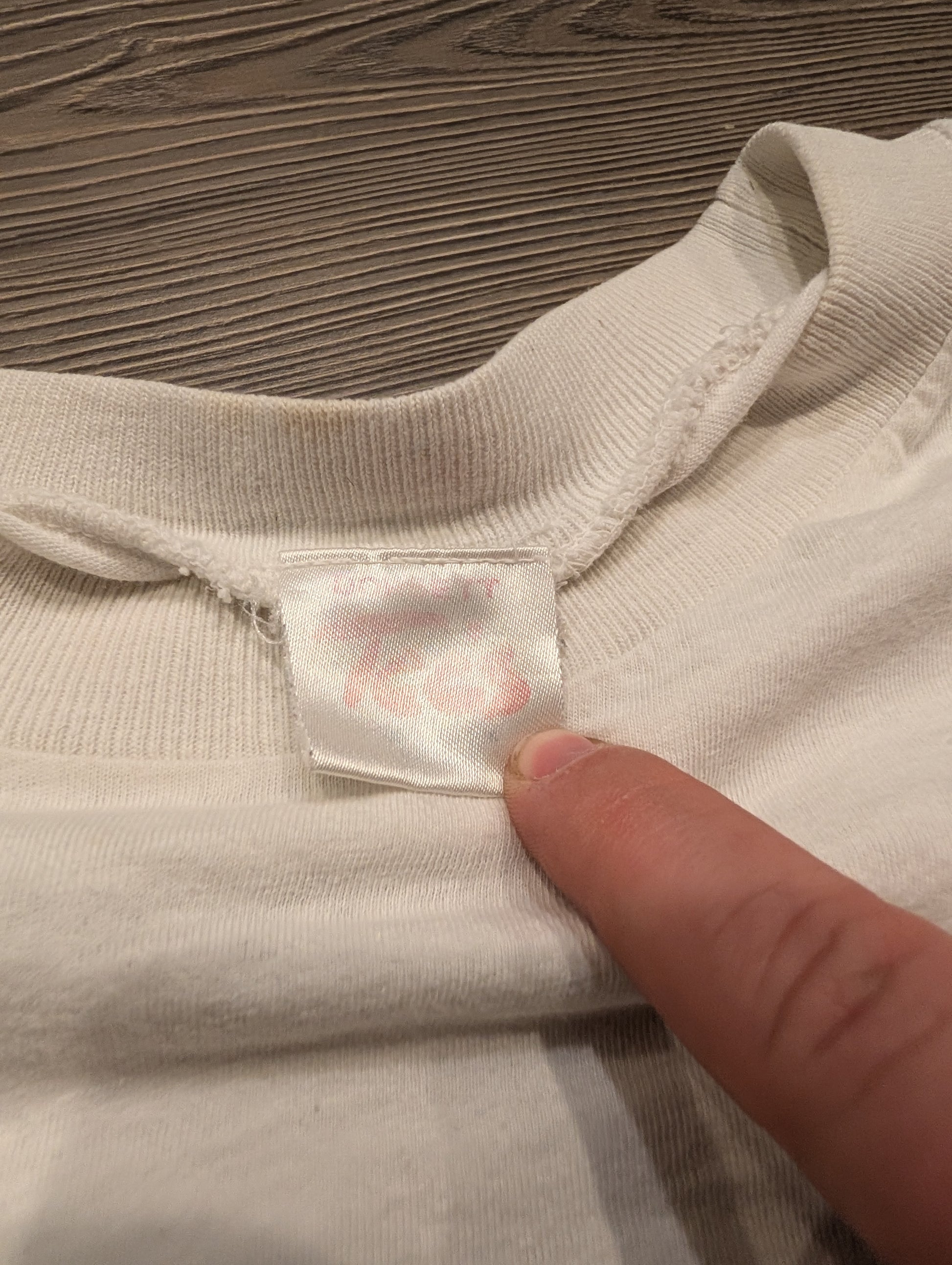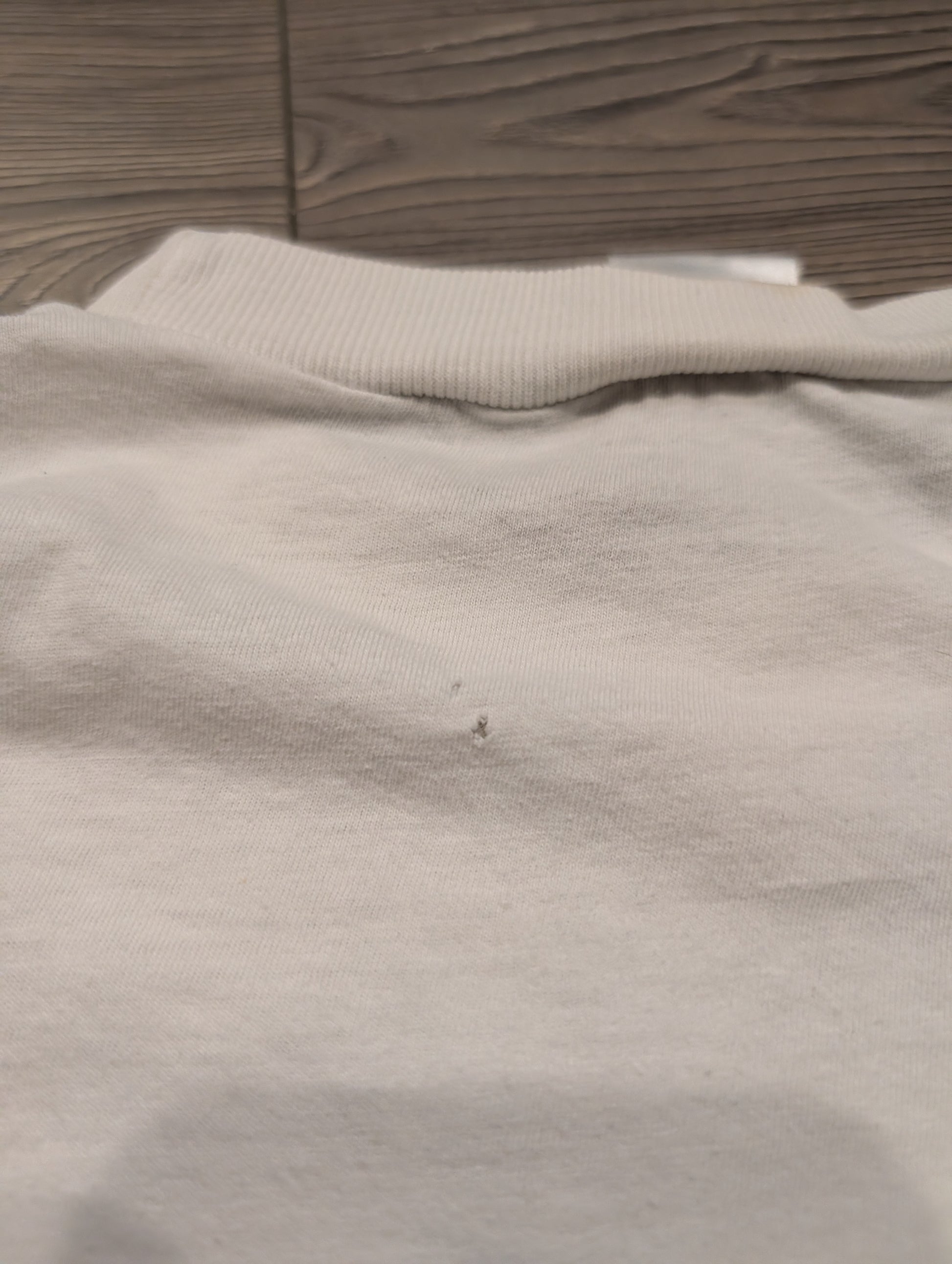 Condition: worn, stains, super thin, soft, faded graphic, very off-center image, shirt seam is twisted,