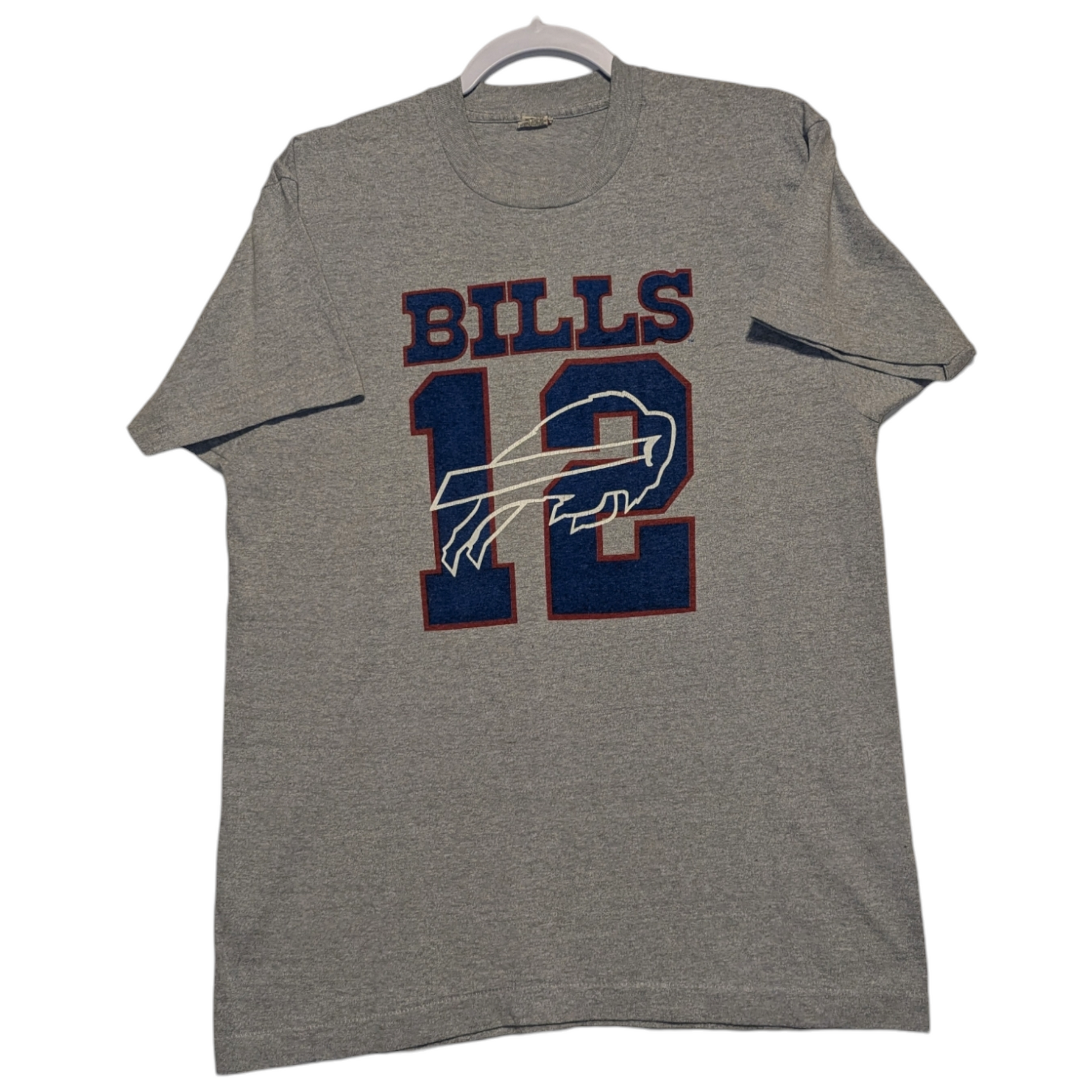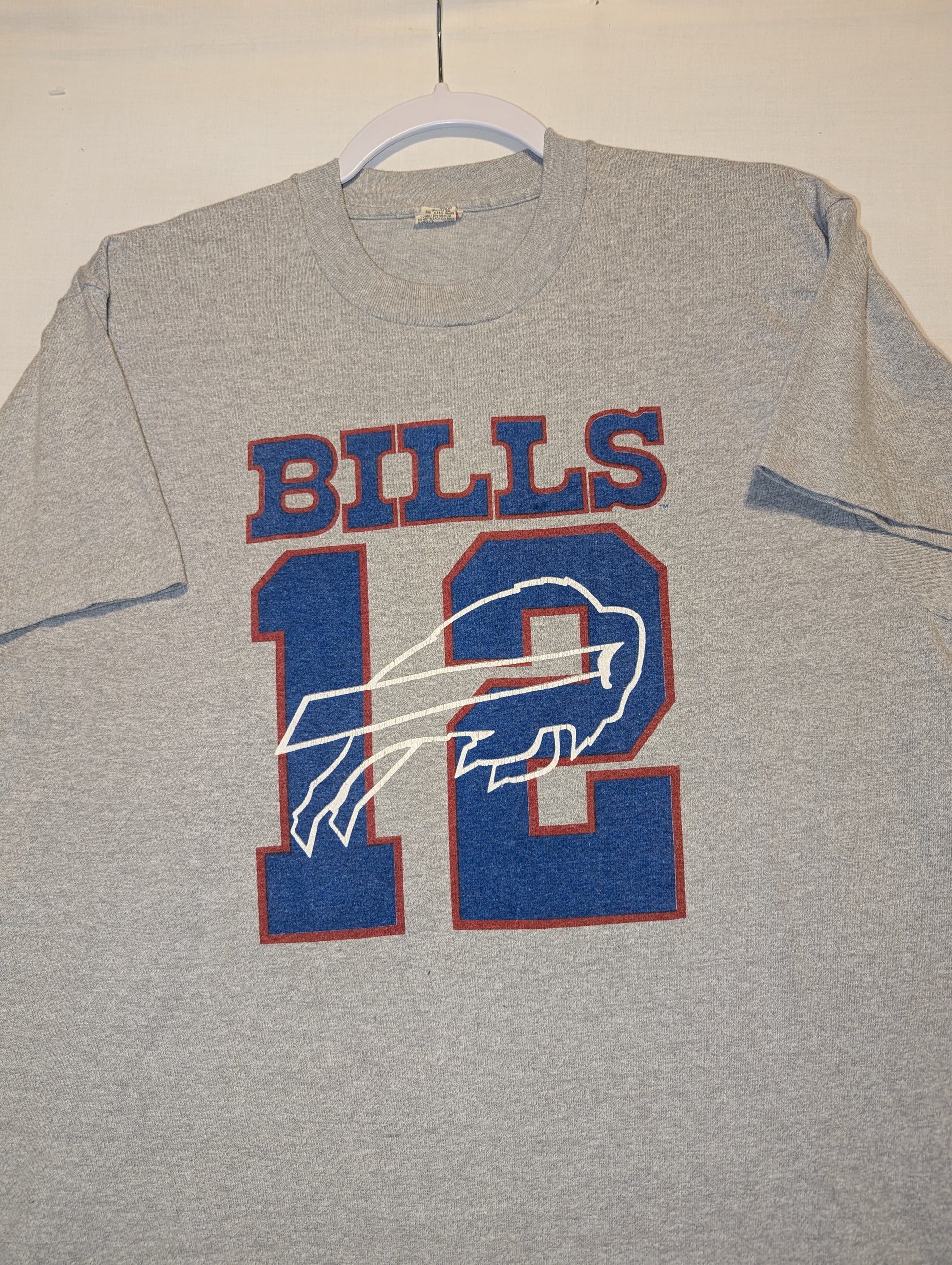 Description: Vintage 80s Buffalo Bills Joe Ferguson t shirt, front graphic only, not sure if its Joe Ferguson or Jim Kelly, NFL Football sports tee, Quarterback, player tee, gray red and white, New York