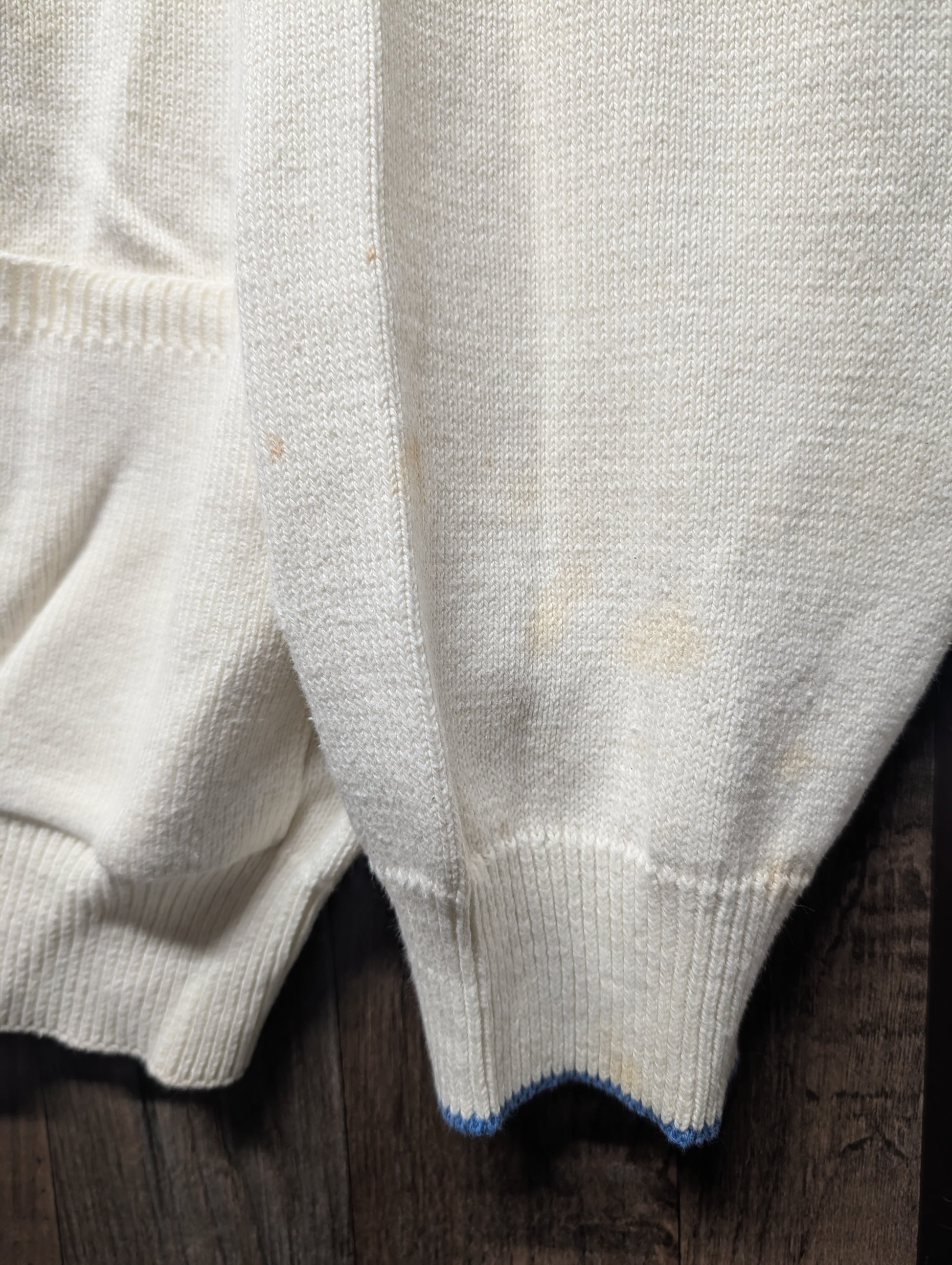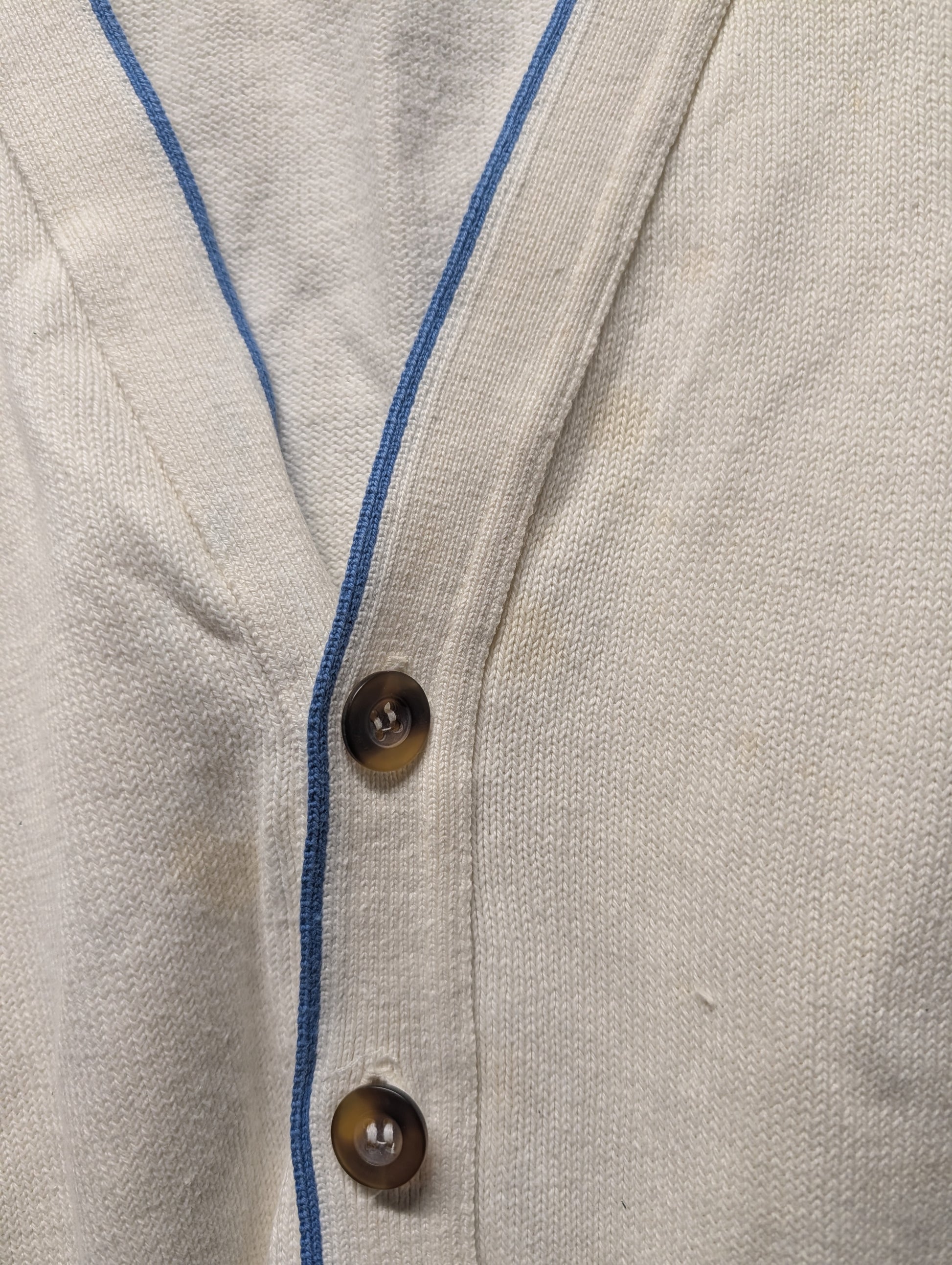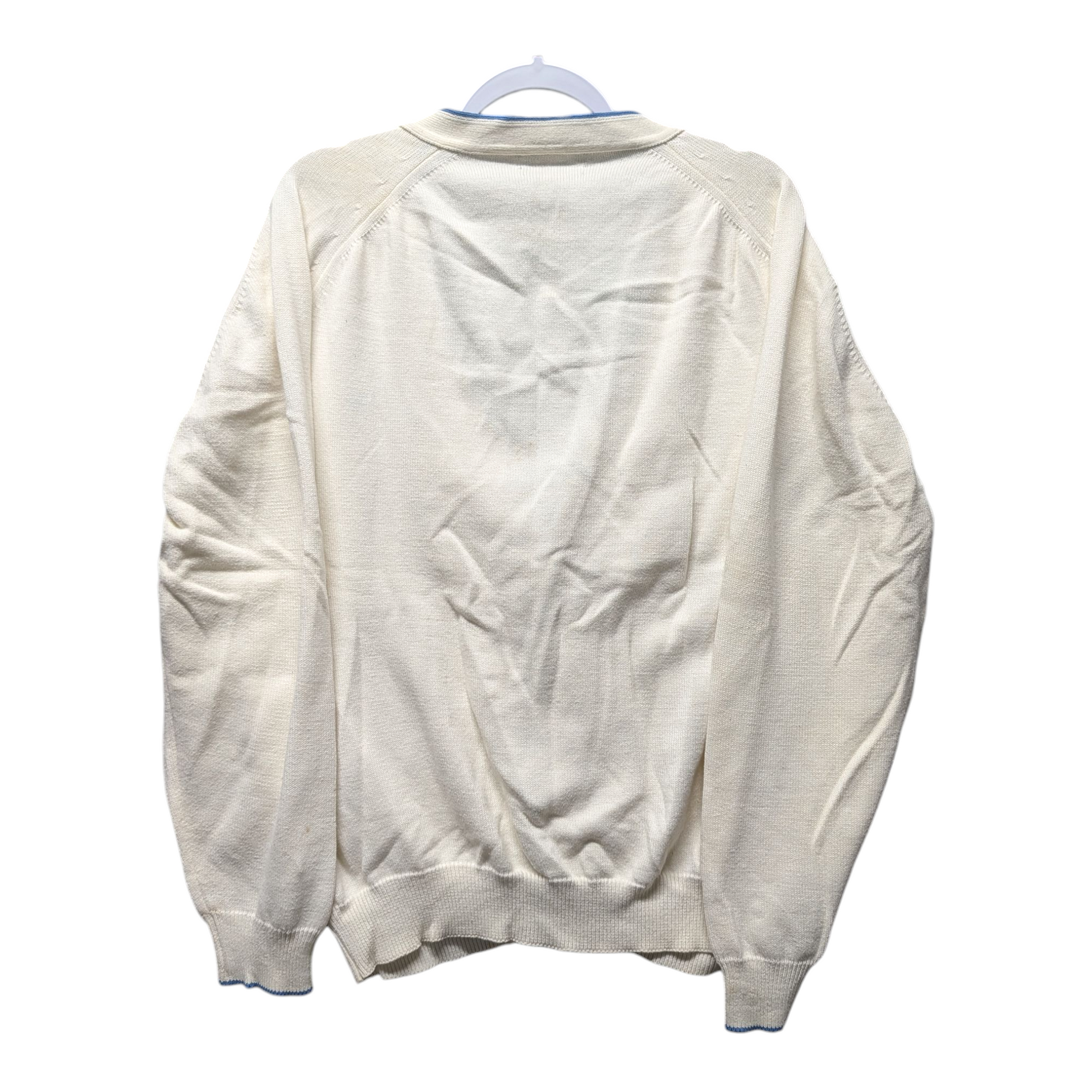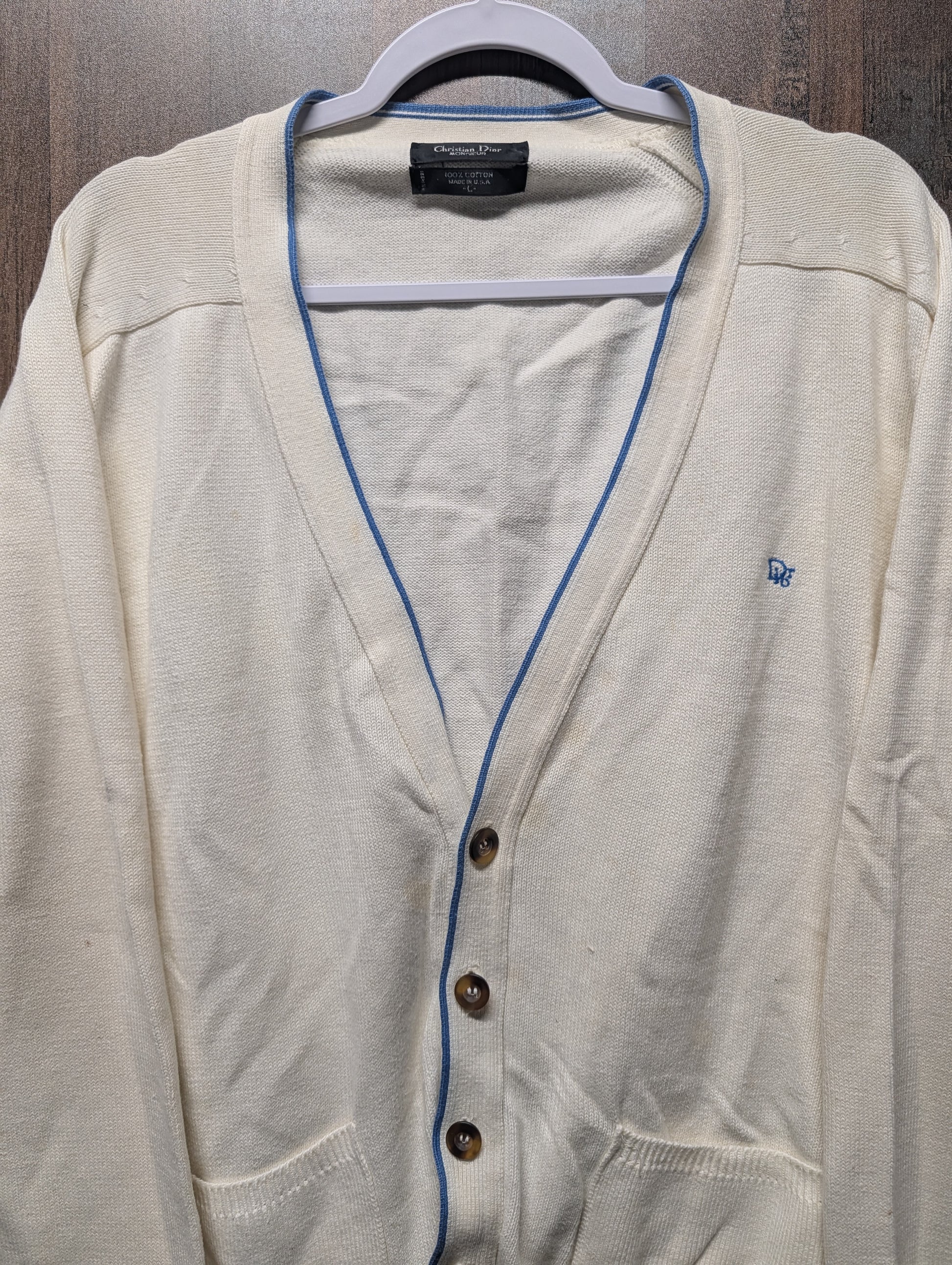Description: Vintage 80s Christian Dior Monsieur Cardigan Sweater, cream and light blue, two front pockets, button up, little Dior Embroidery on the front, designer, perfect for fall and winter months, grandpacore, grannycore, cottagecore