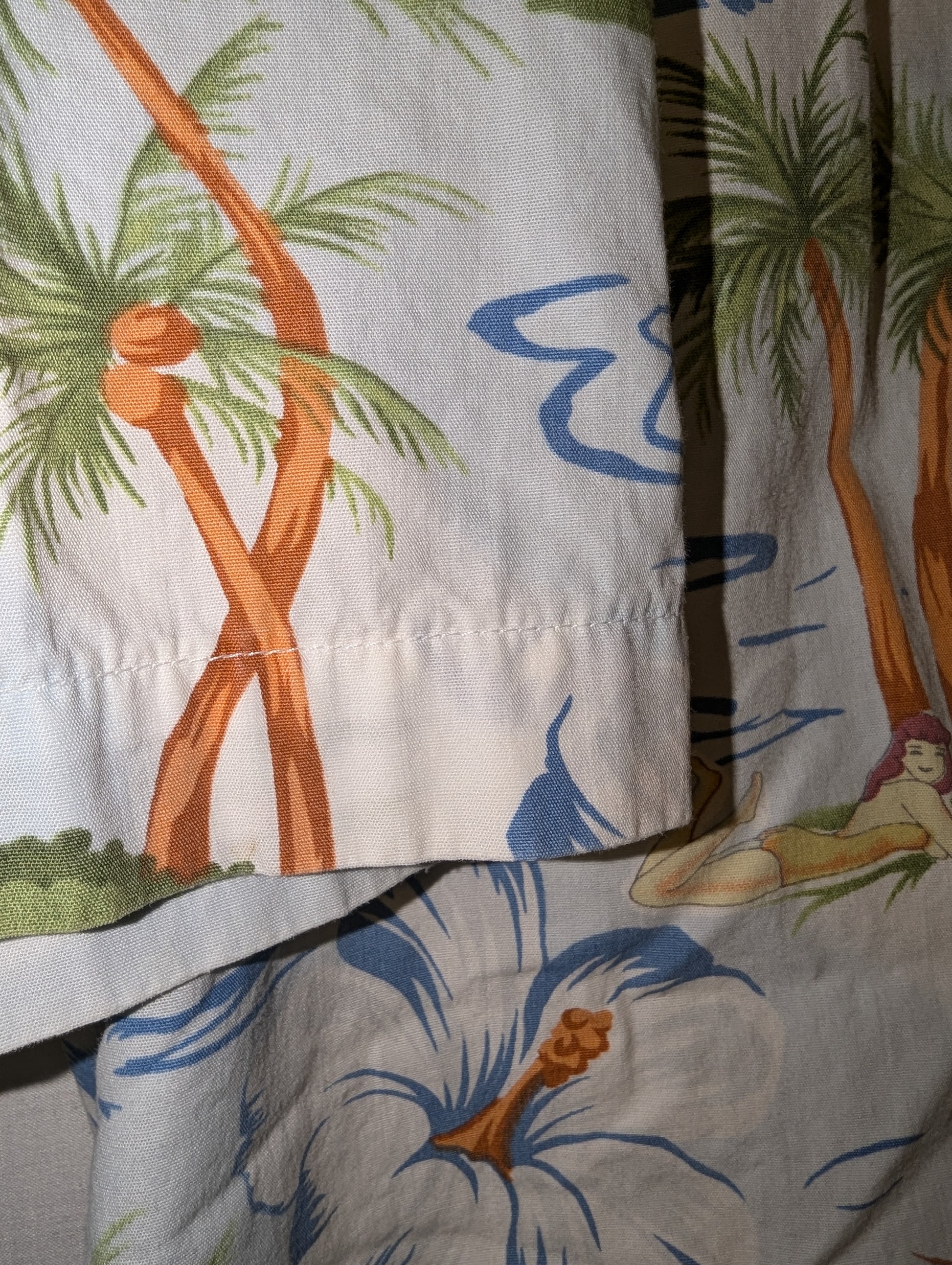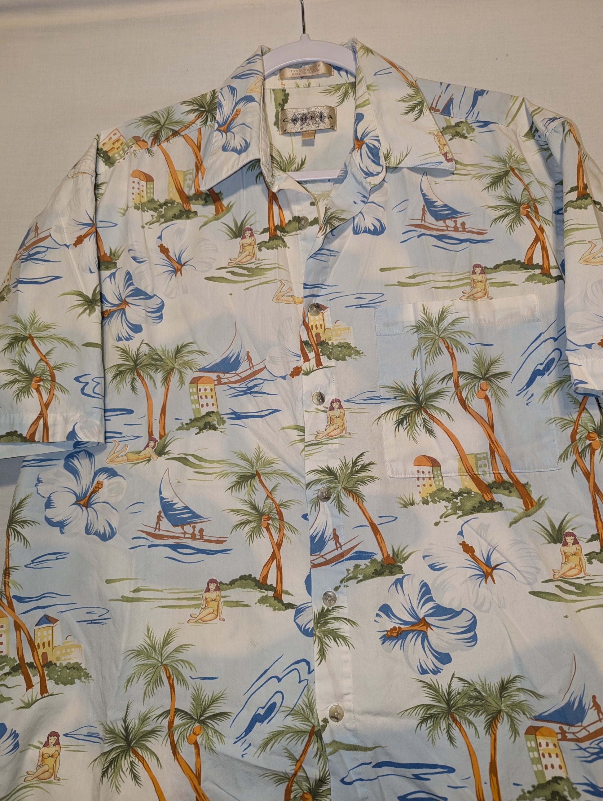 Description: Vintage 80s Hawaiian Palmtree Button Up shirt, AOP graphic, Girl in a bathing suit, white blue and green, front chest pocket,