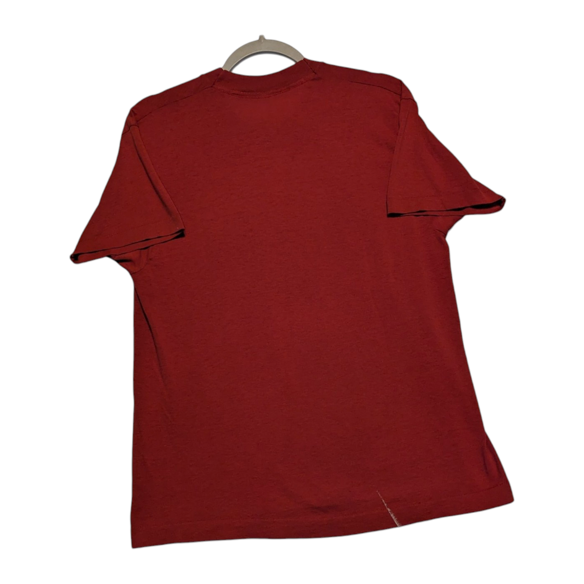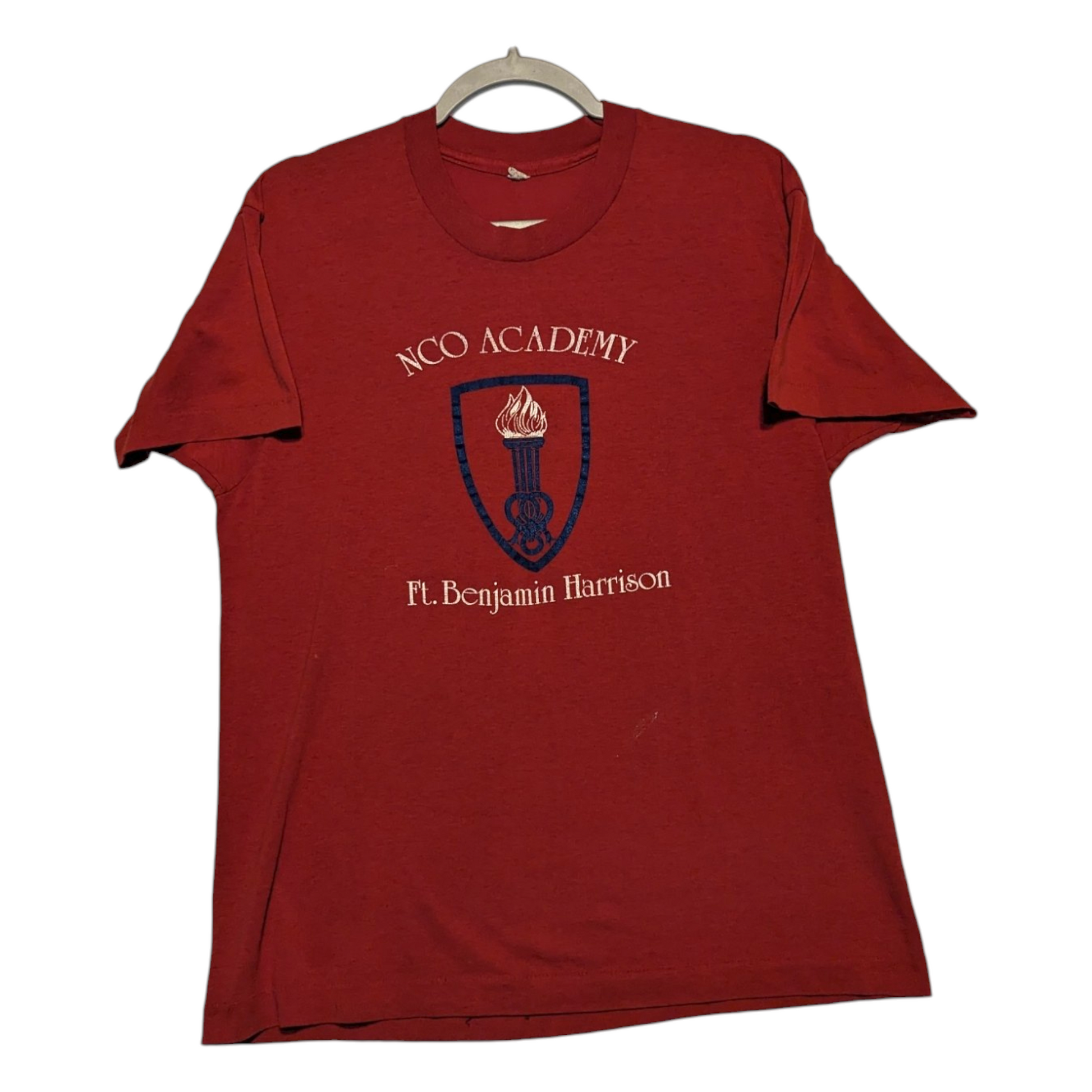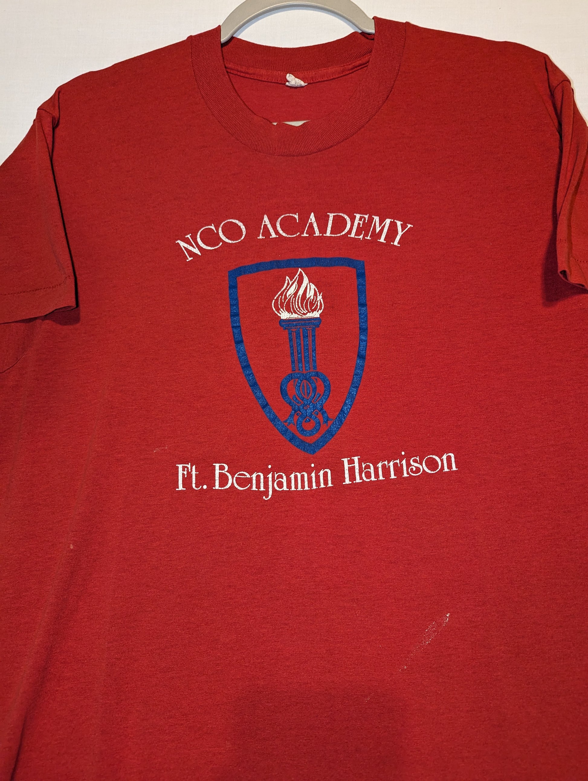 Description: 80s NCO Academy Ft Benjamin Harrison t shirt, Military top, red shirt, front graphic only