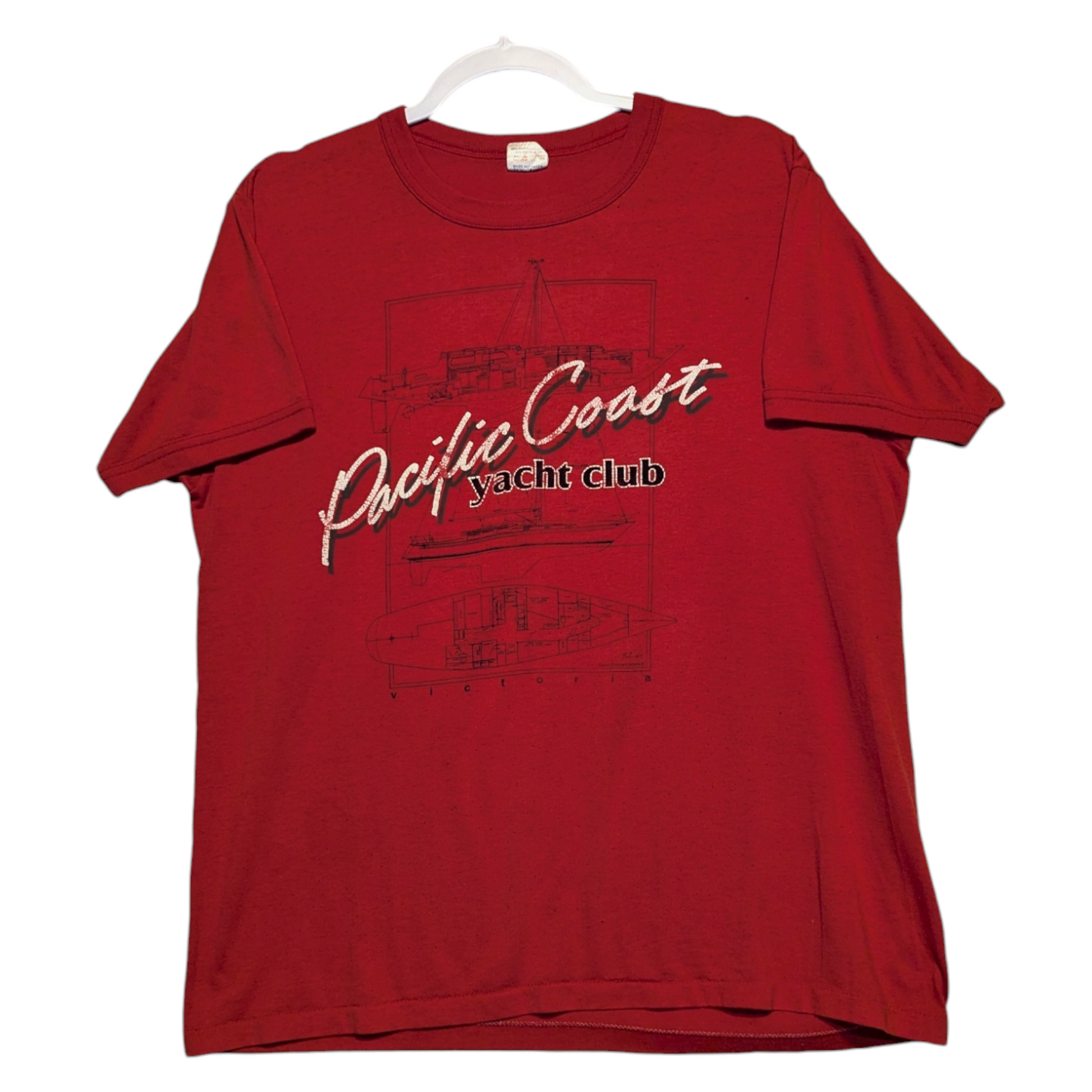 Description: Vintage 80s Pacific Coast Yacht Club t shirt, front graphic only, red navy and white, boating nautical graphic, blueprint design, Victoria