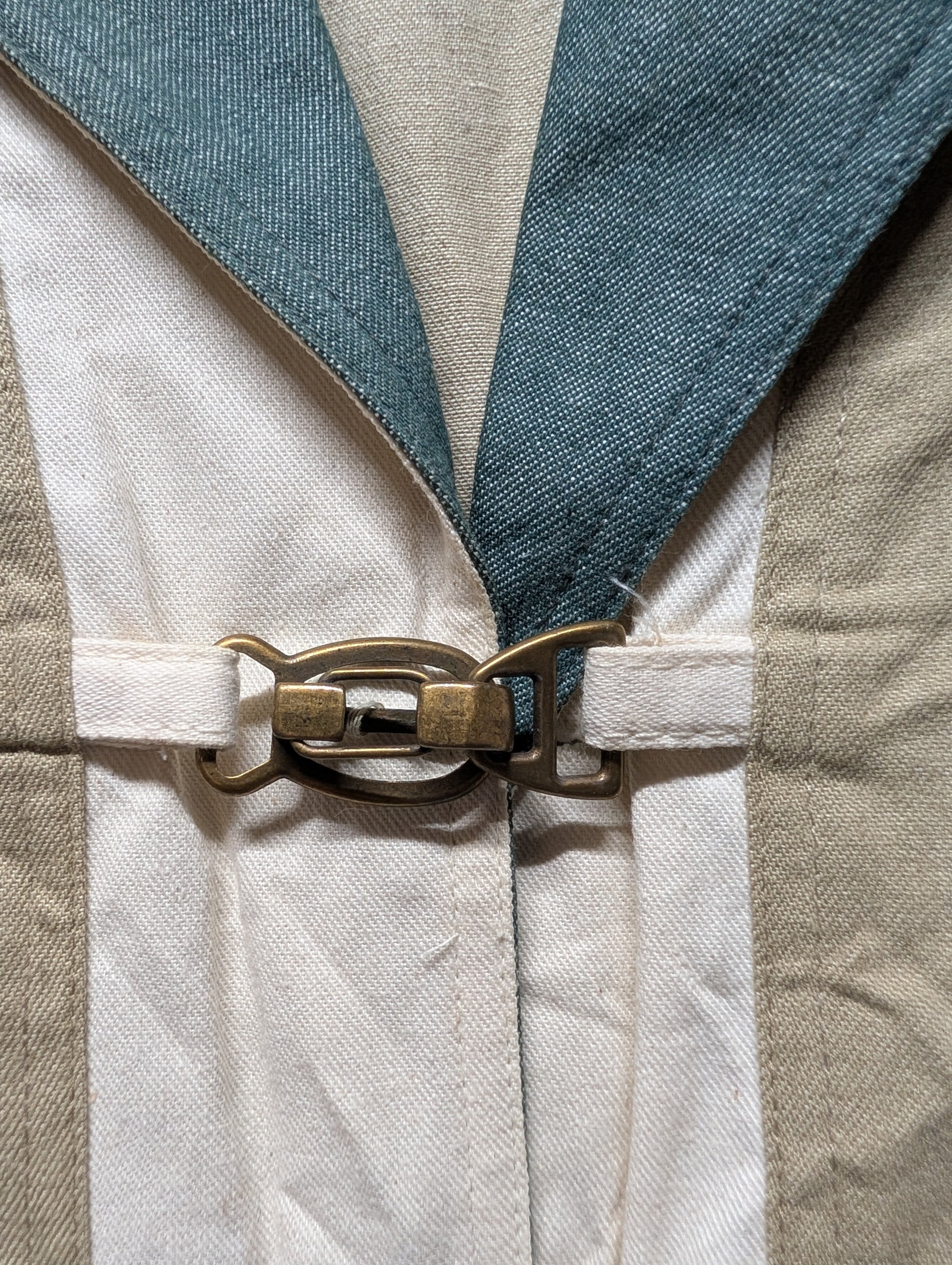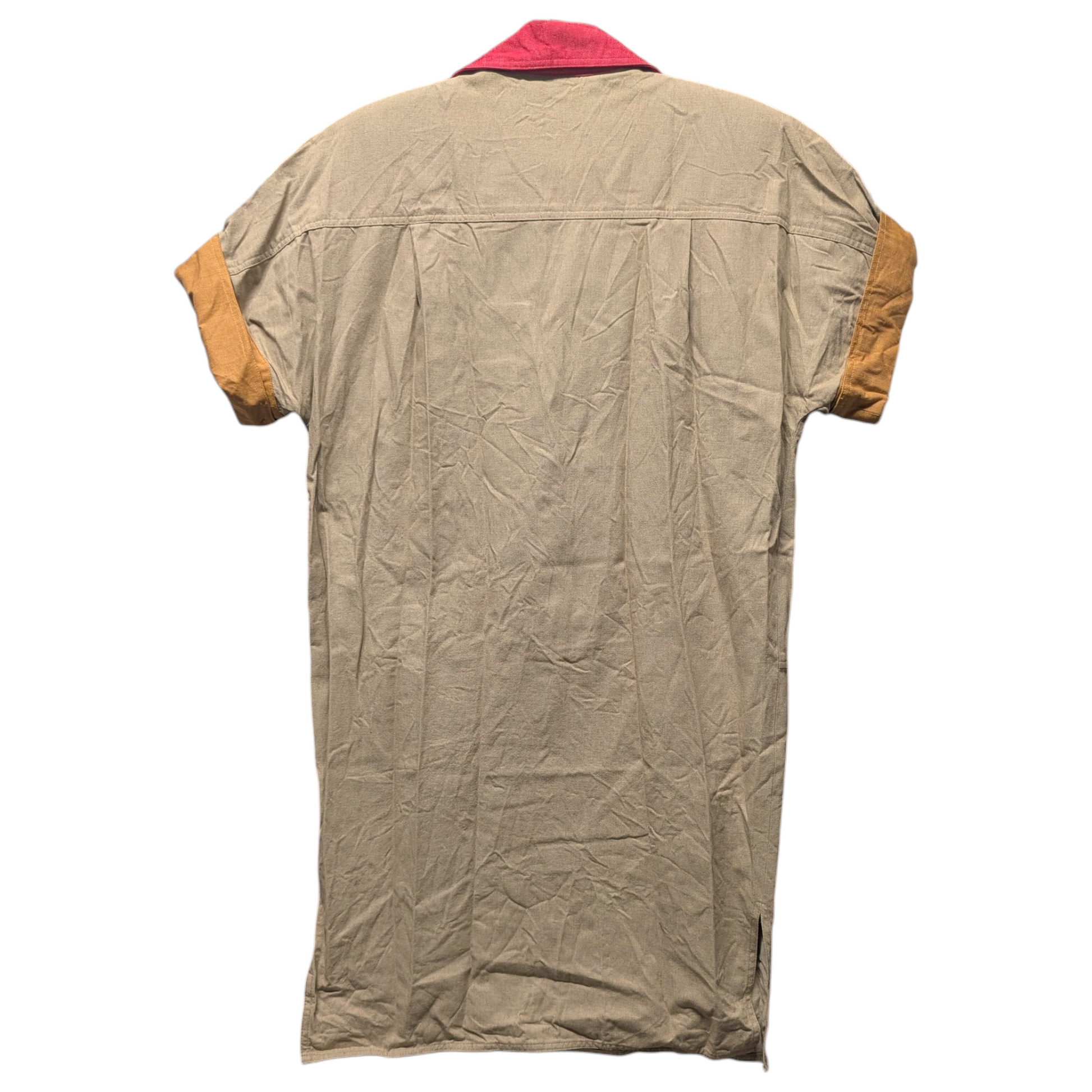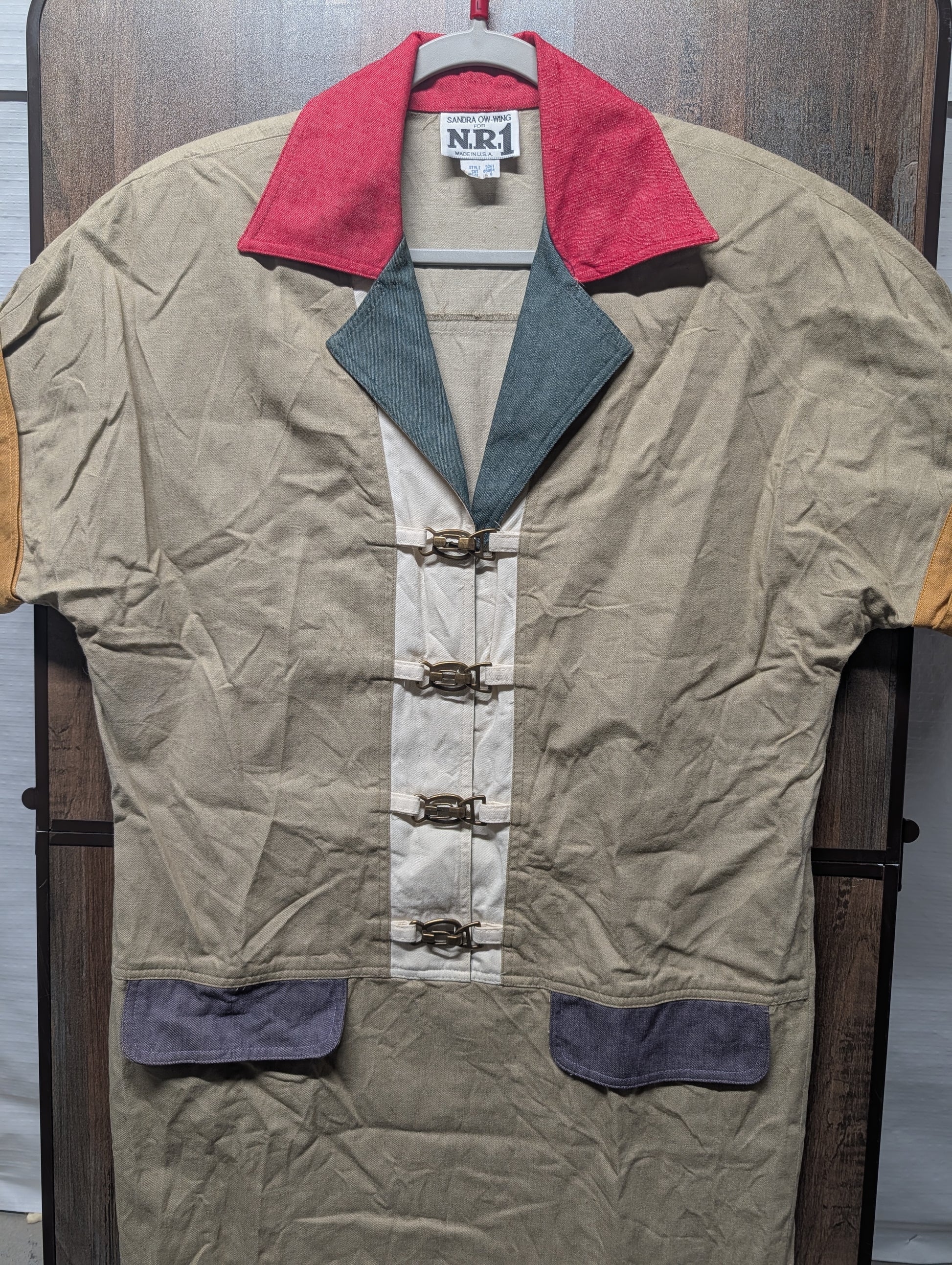 Description: Vintage 80s Sandra Ow-Wing For NR1 Dress, really unique color blocking, tactical metal hardware buckles on the front, green yellow and red, muted colorway, avant garde, Paded shoulders, great for fall, artsy, bright red collar