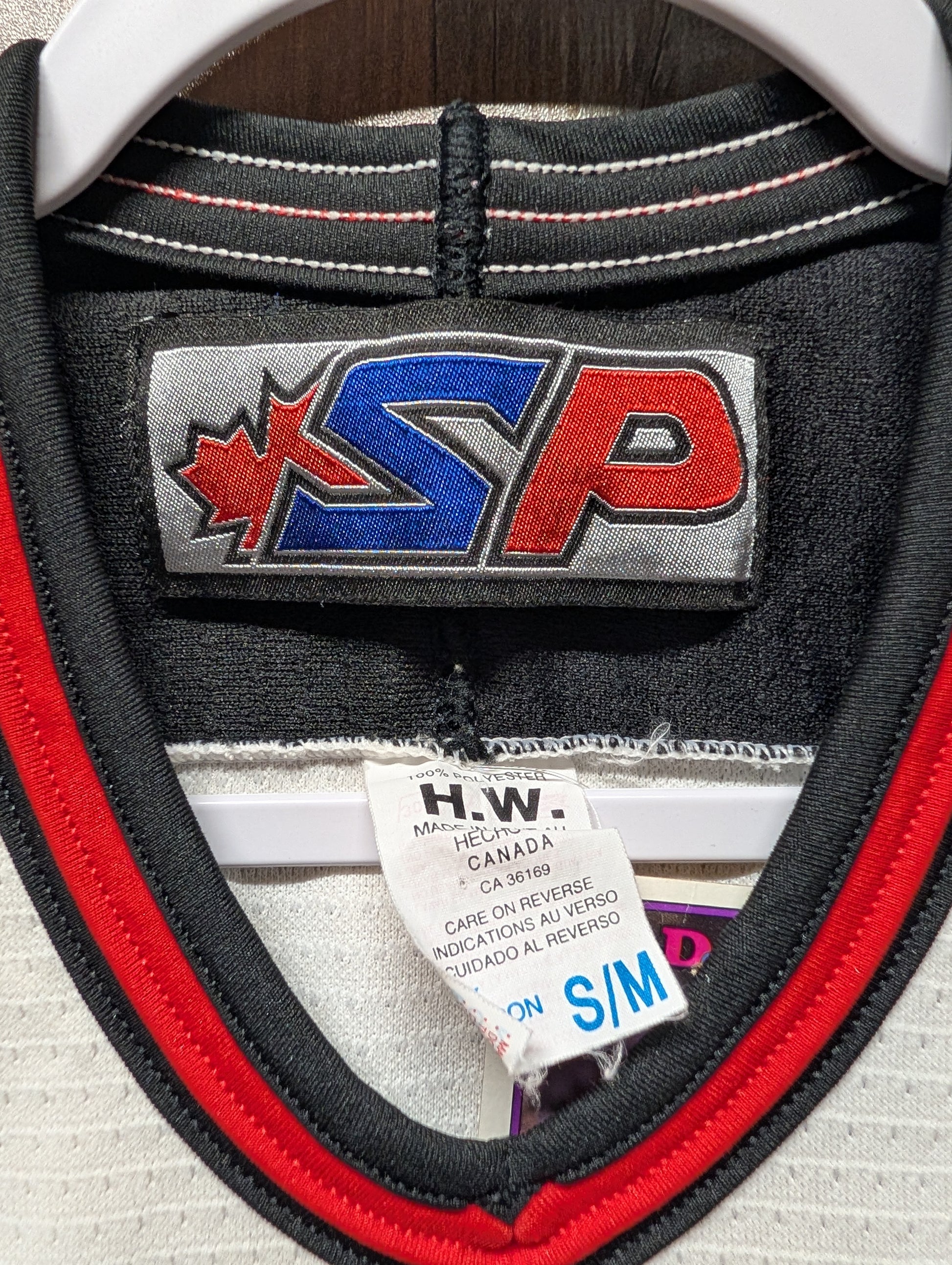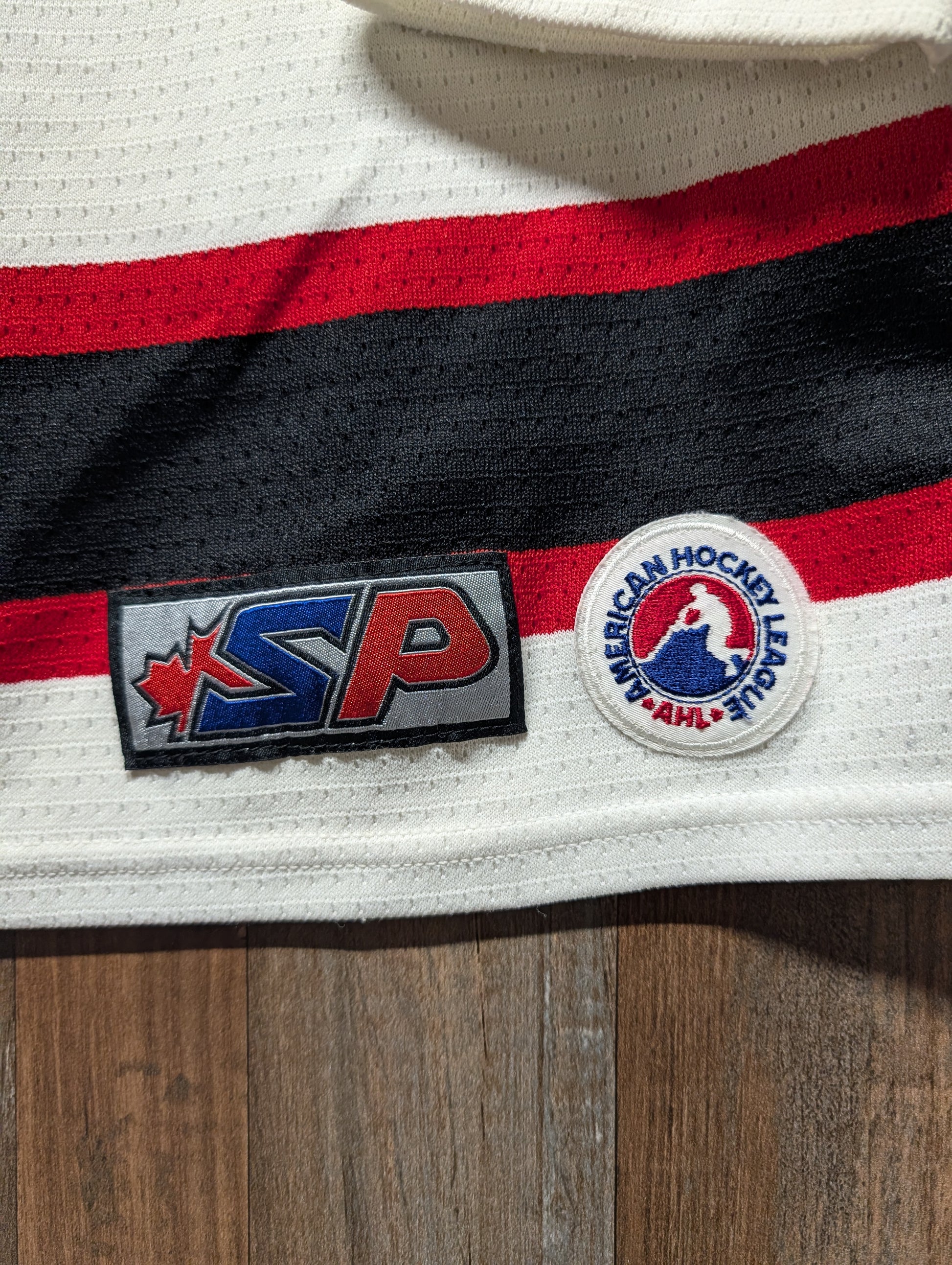 Description: Vintage 90s Albany River Rats AHL Hockey Jersey, Front and sleeve graphics, white red and black, Big patch on the front, Jersey Devils, Rowdy graphic, perfect for winter season, defunct local team