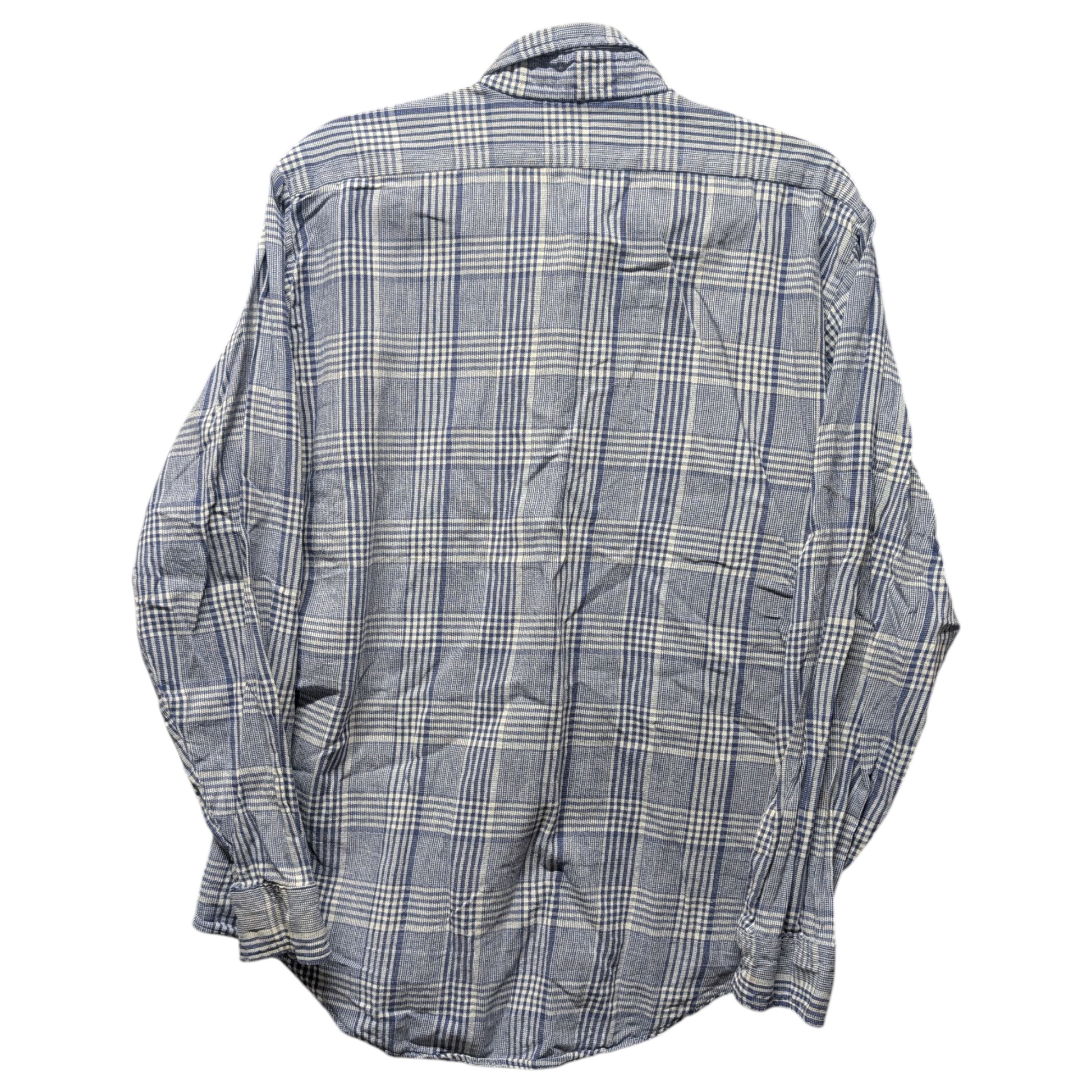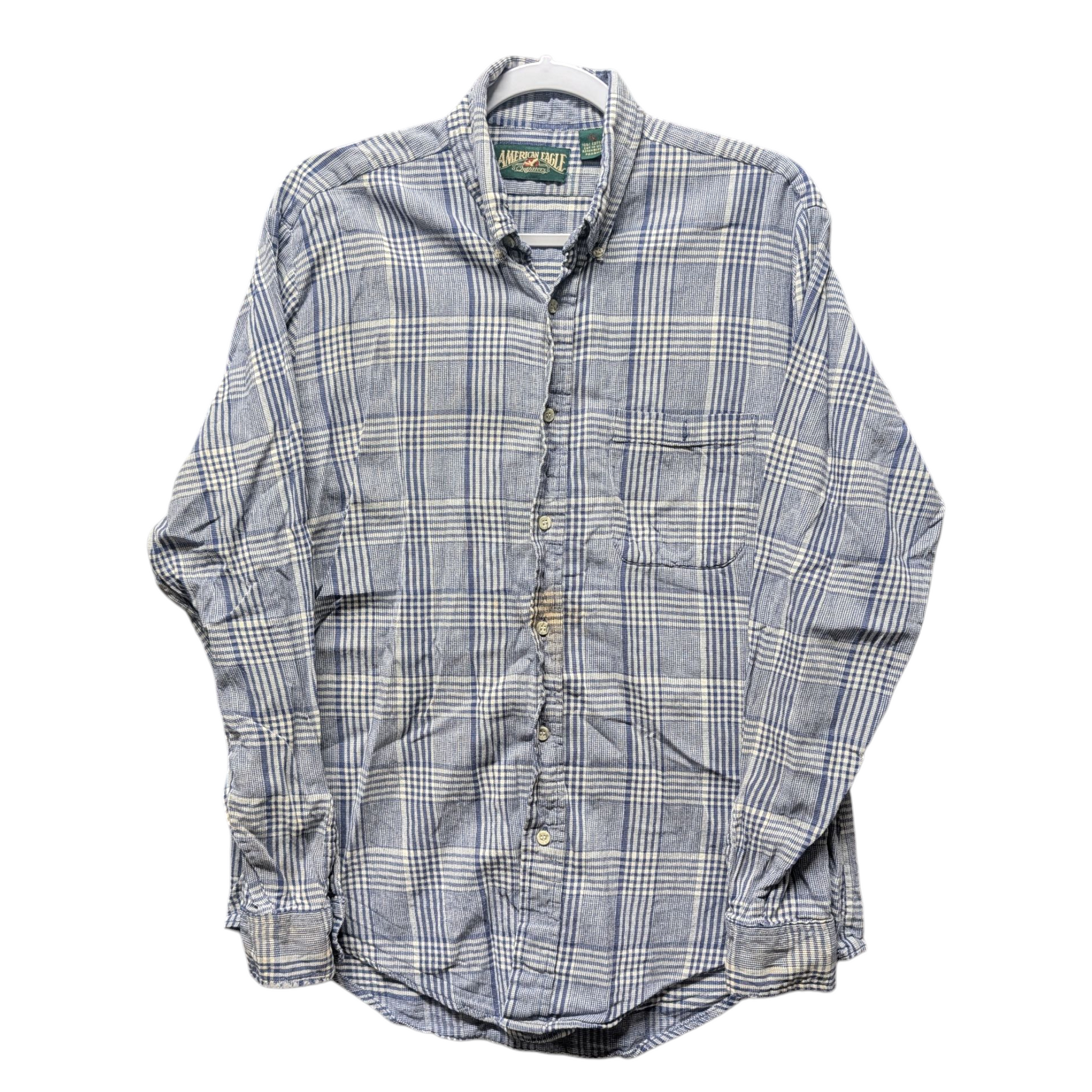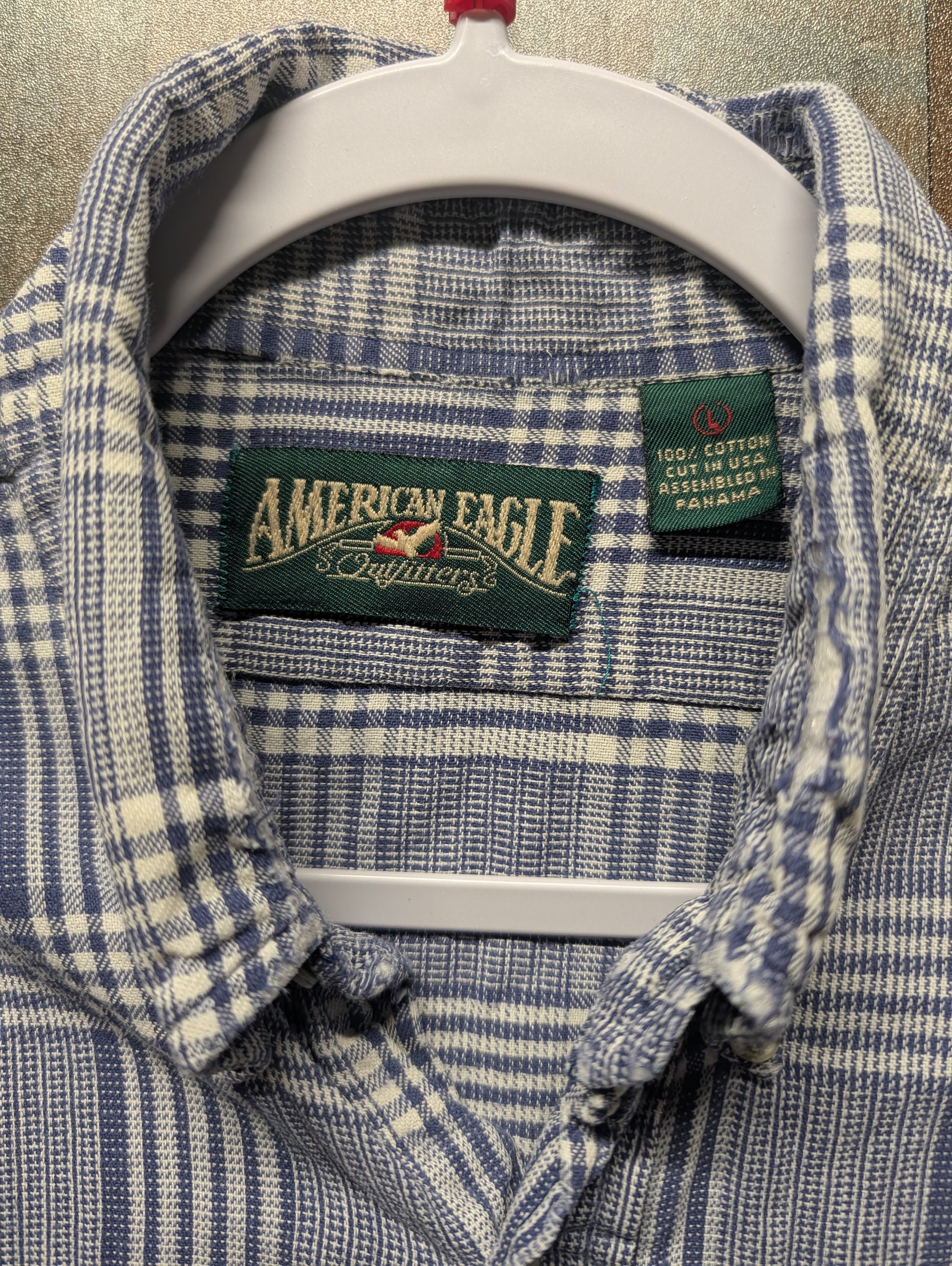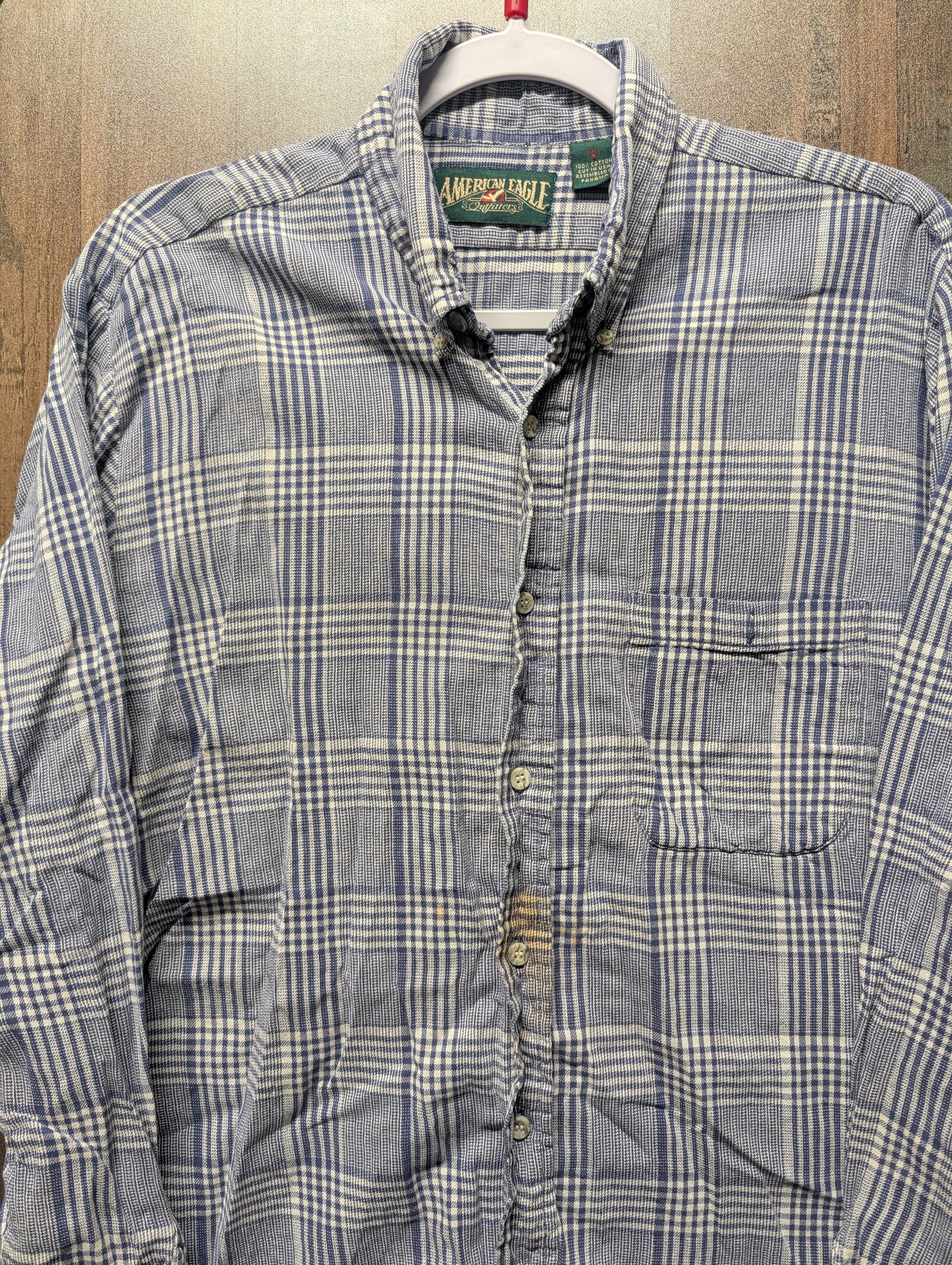 Description: Vintage 90s American Eagle Plaid Button Up Shirt, Blue and white, casual Fall top perfect for Fall and winter months, one chest pocket, great for layering, good grunge look