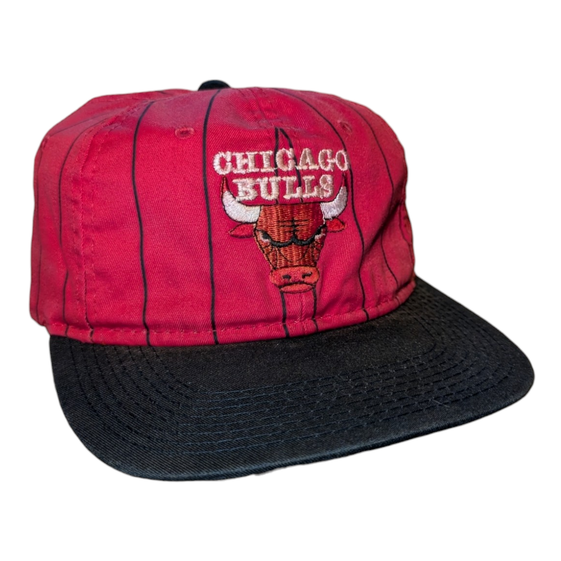 Description: Vintage 90s Chicago Bulls Pin Stripe snapback hat, red and black, bulls logo on the front, pin stripe all around, basketball NBA sports cap