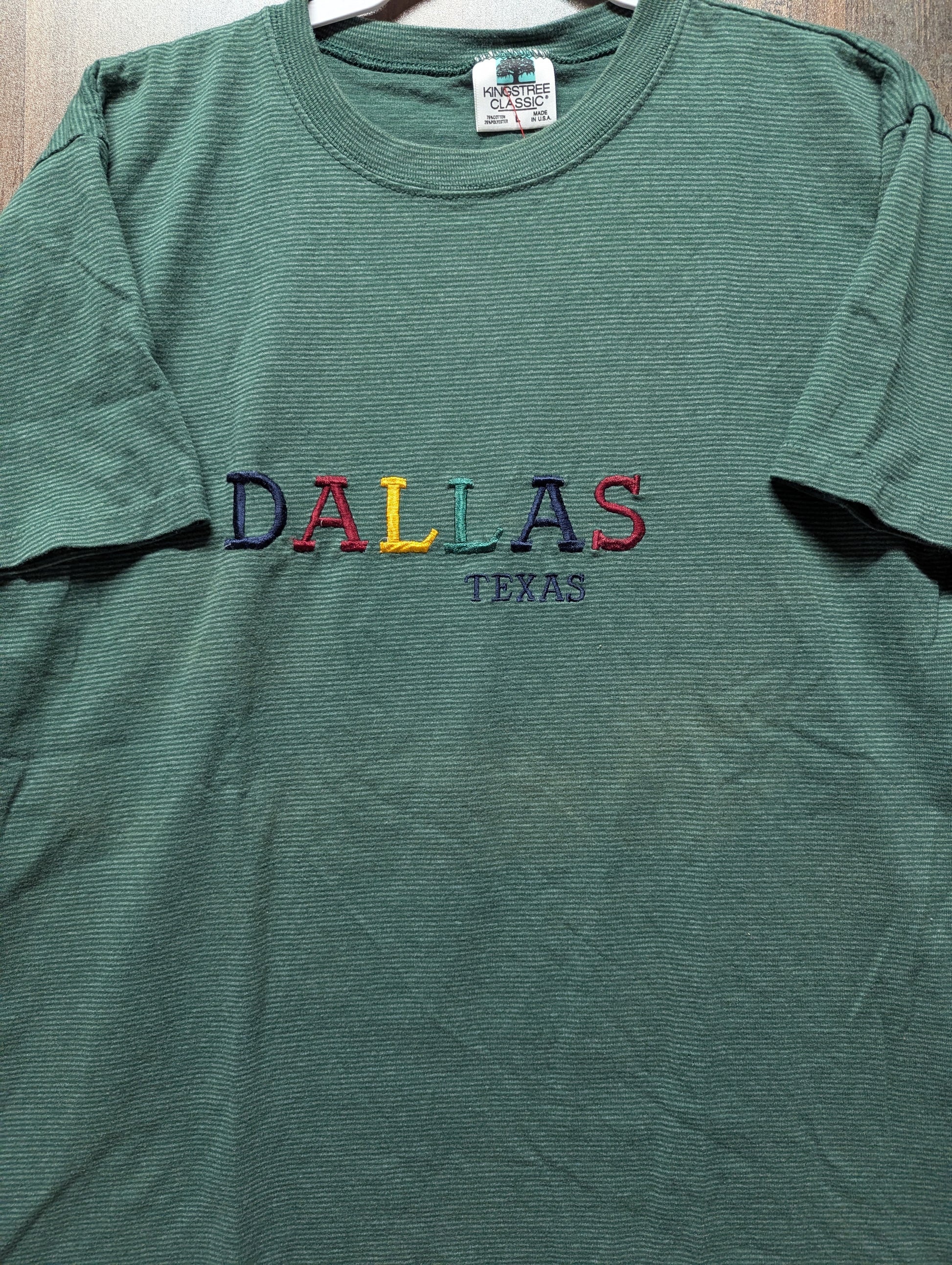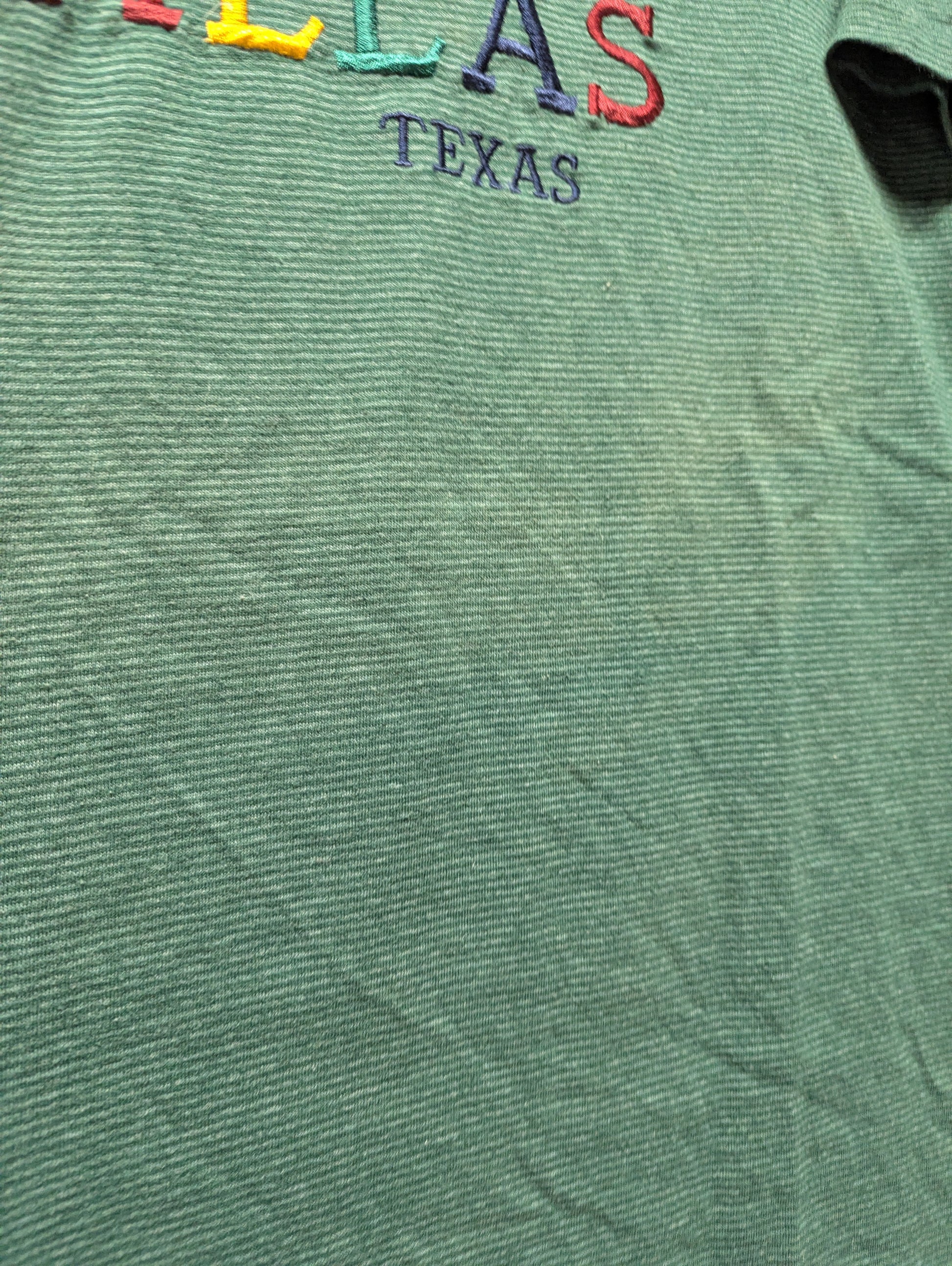 Description: Vintage 90s Dallas Texas Spell Out T shirt, pinstriped tee, rainbow letters, Location tee, front graphic only, dark green tee