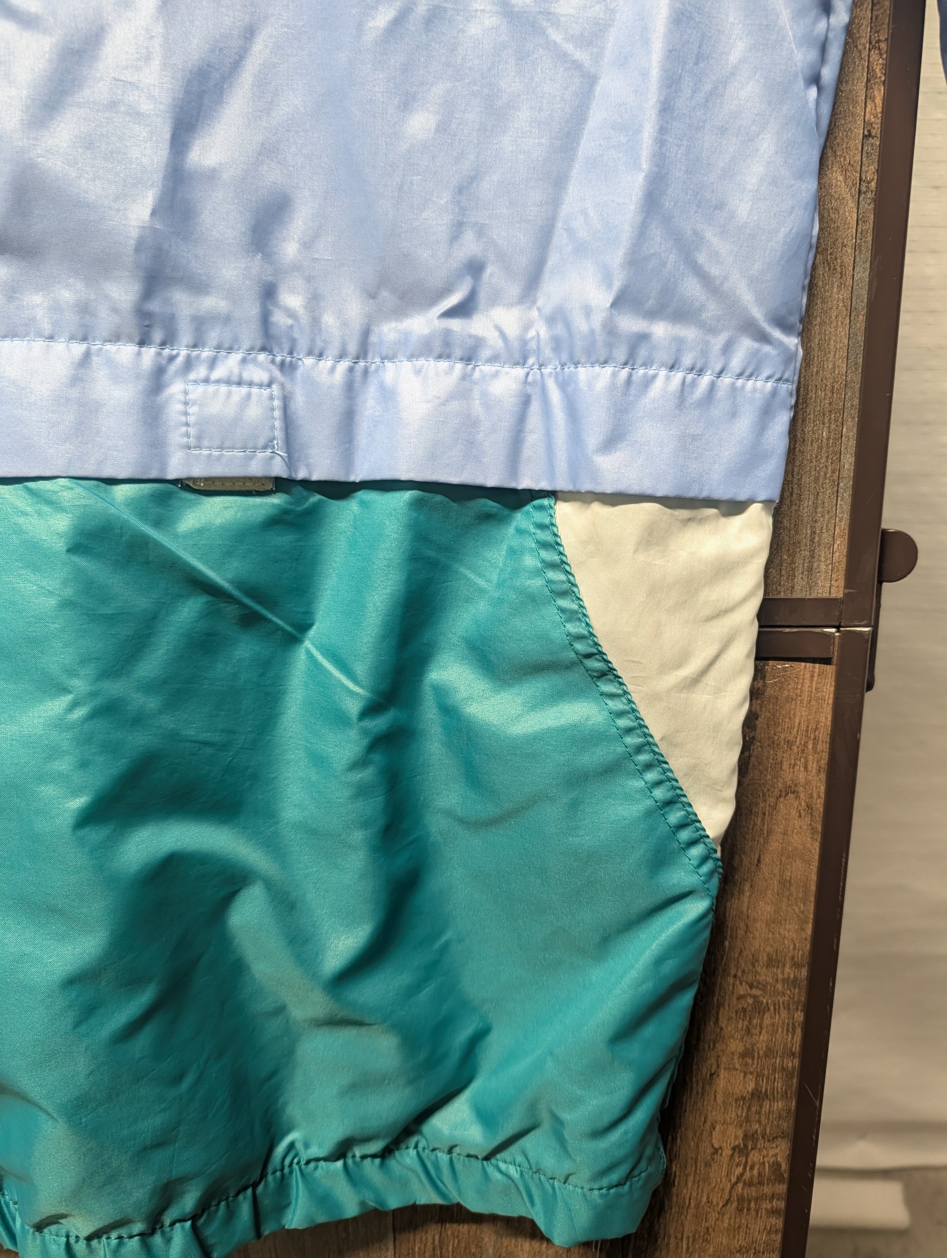Description: Vintage 90s Dunlop Windbreaker Jacket, Colorblock, purple and green, has a hood on the back, quarter zip, Big front pocket, perfect for Fall, great for hikes