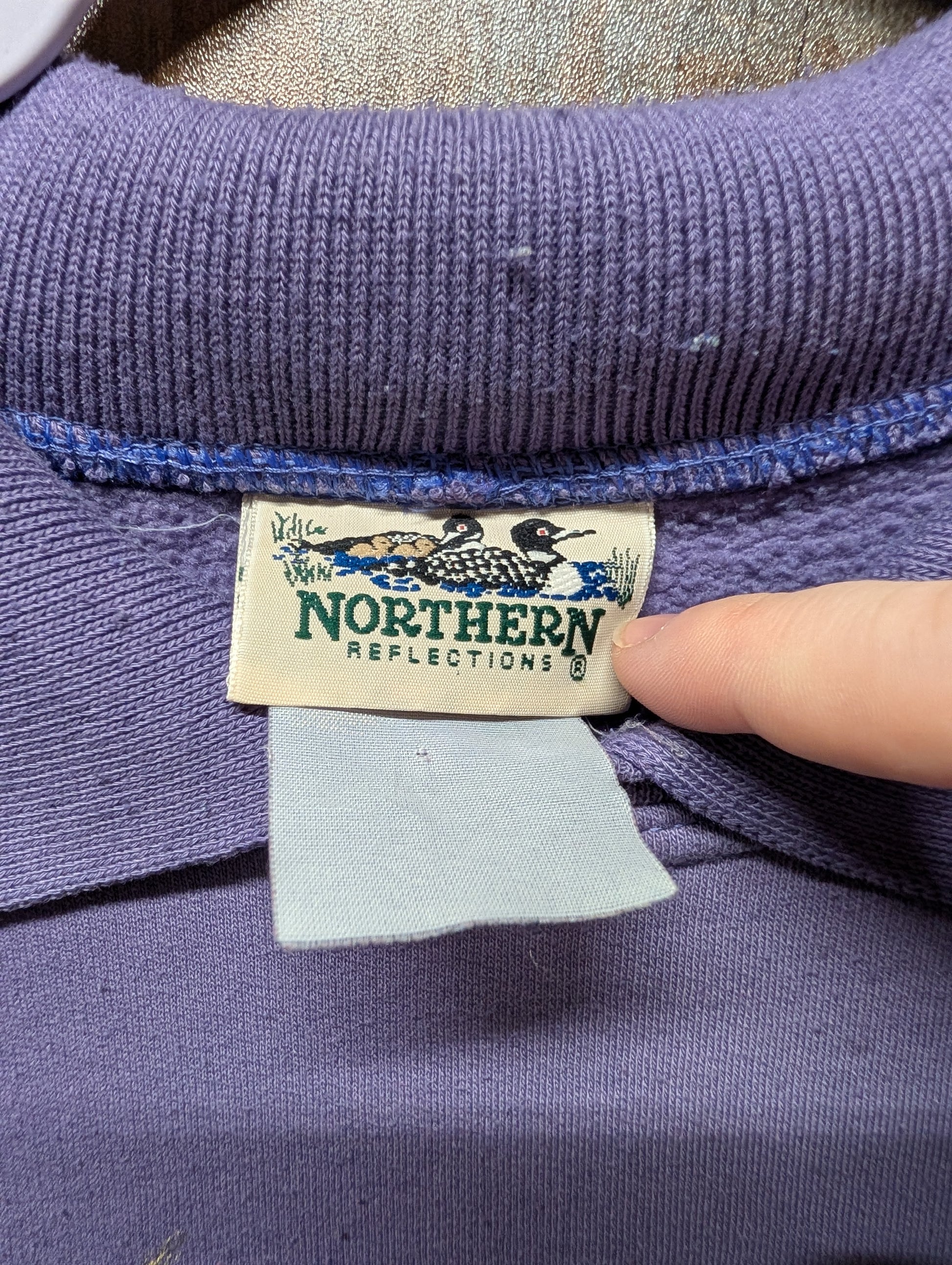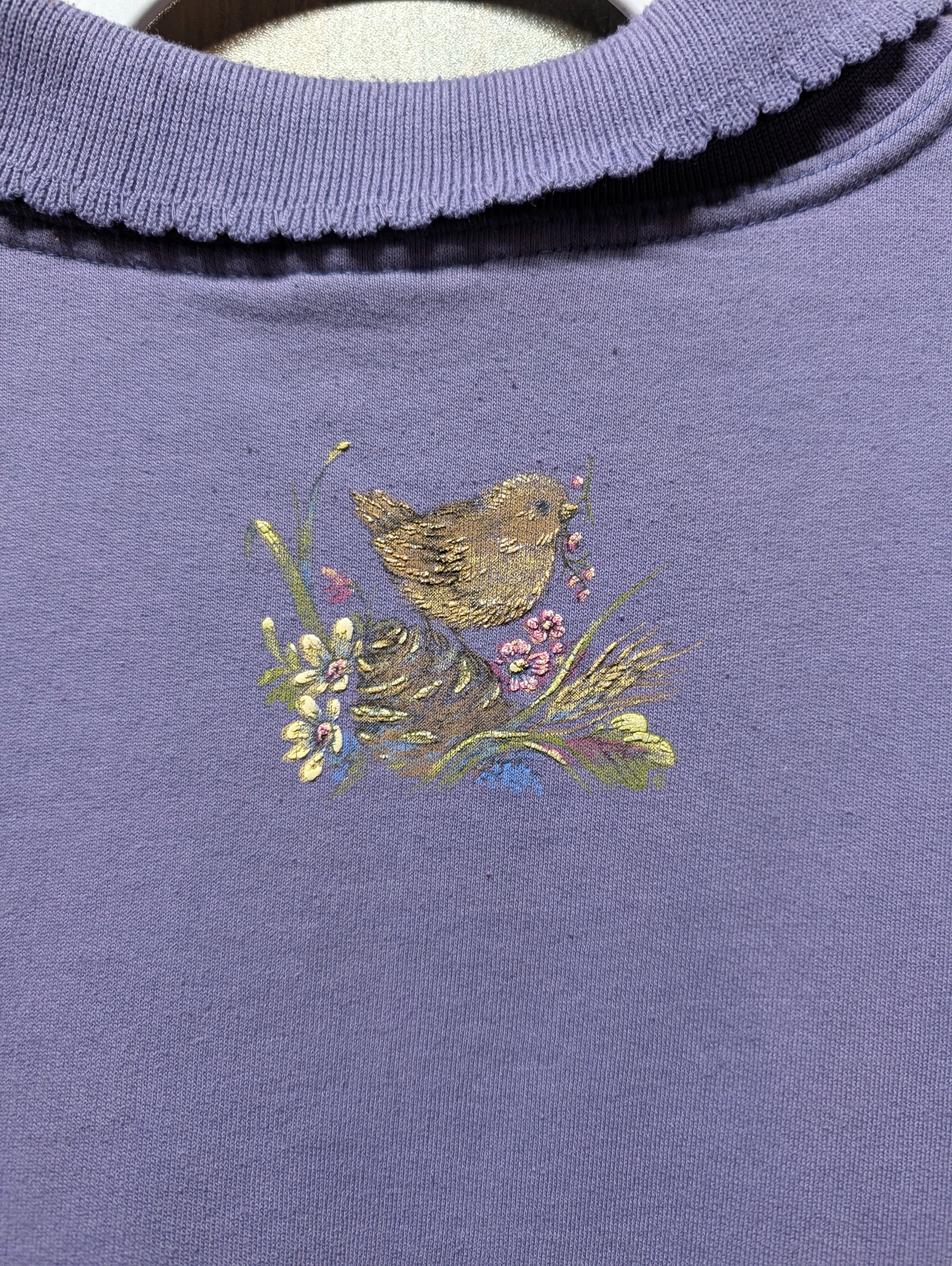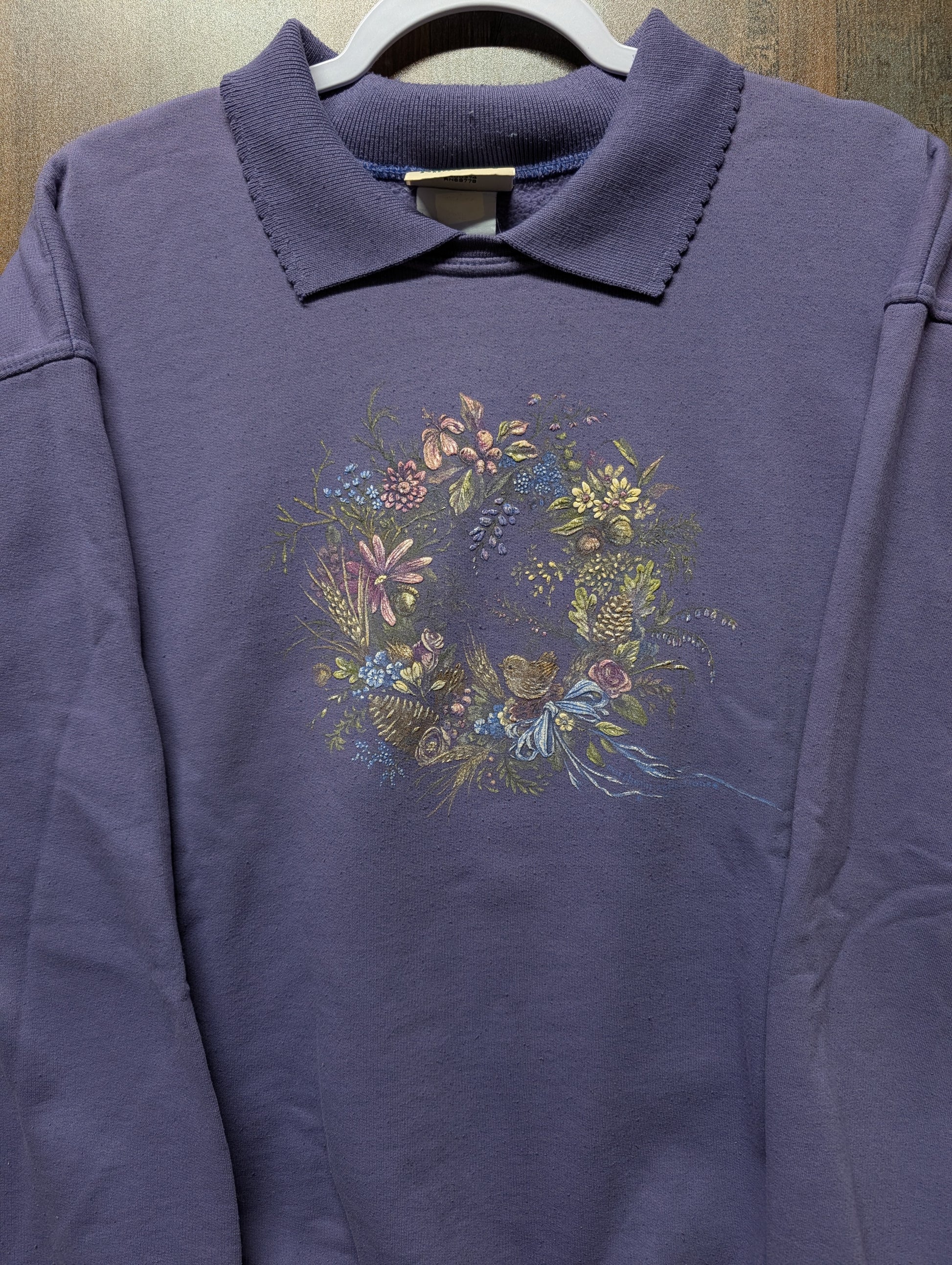 Description: Vintage 90s Floral Wreath and bird Granny Crewneck Sweatshirt, Collar on the neck, purple tan and pink, cute animal nature sweater, cottagecore, grannycore, perfect for Fall or Winter months, pinecones, wildlife, Northern Reflections