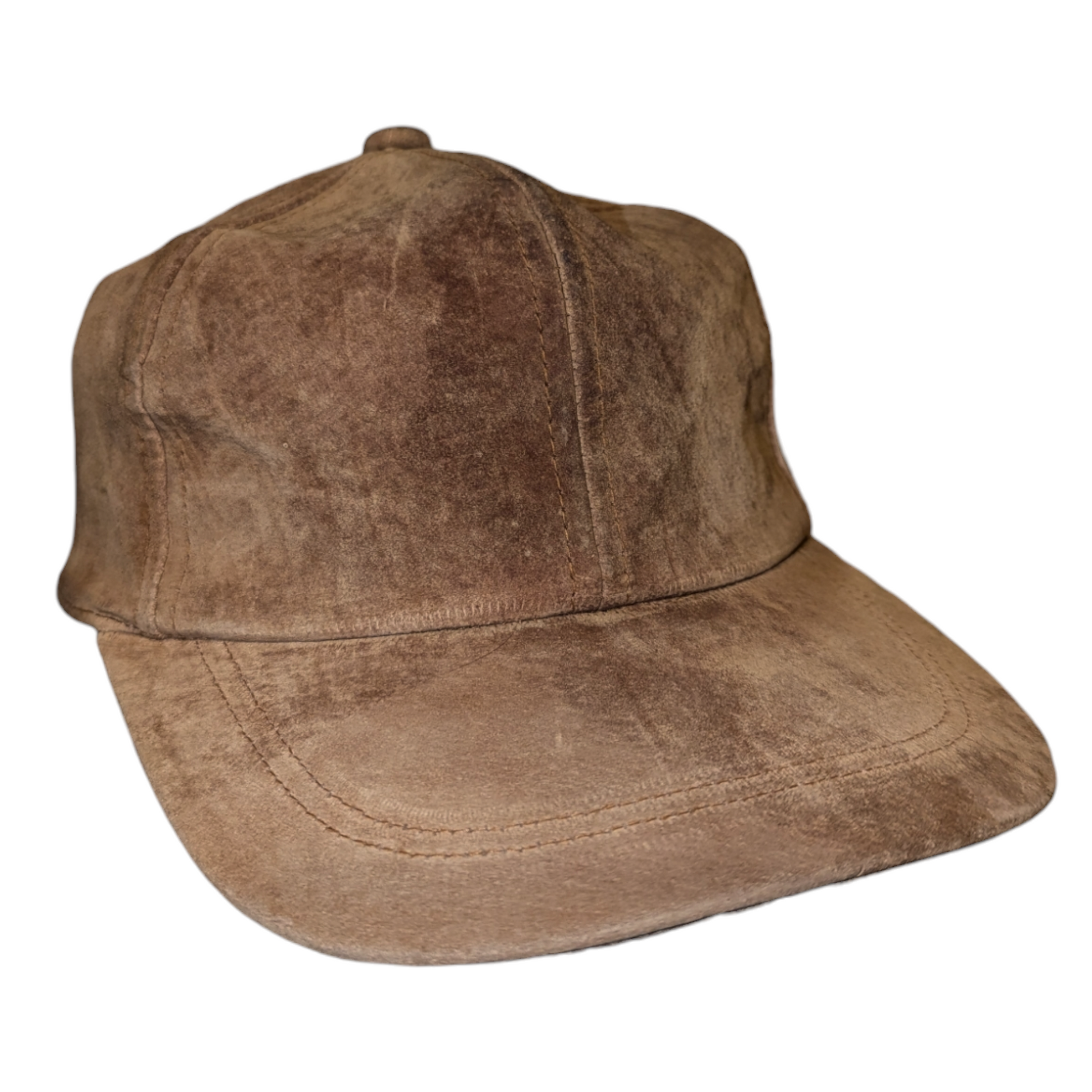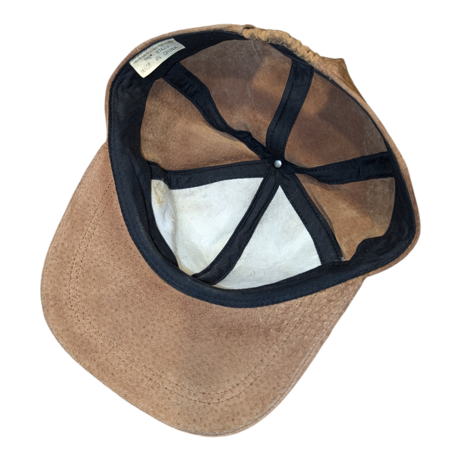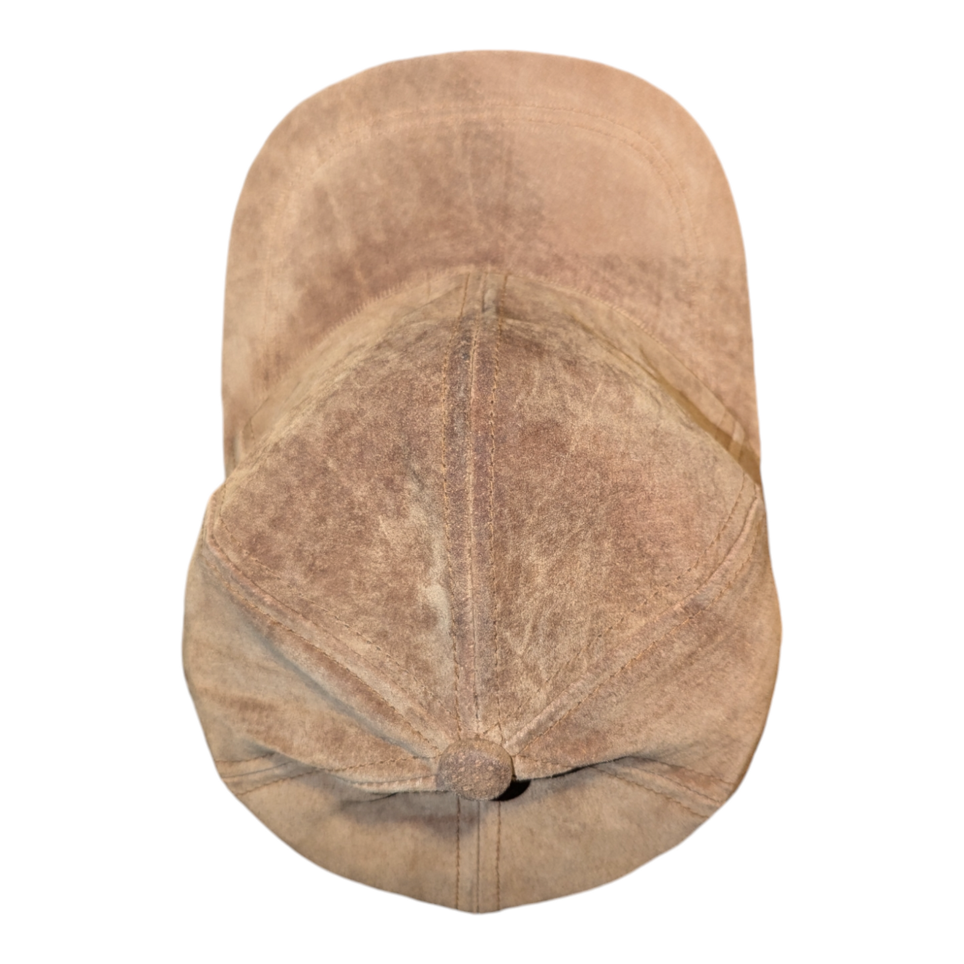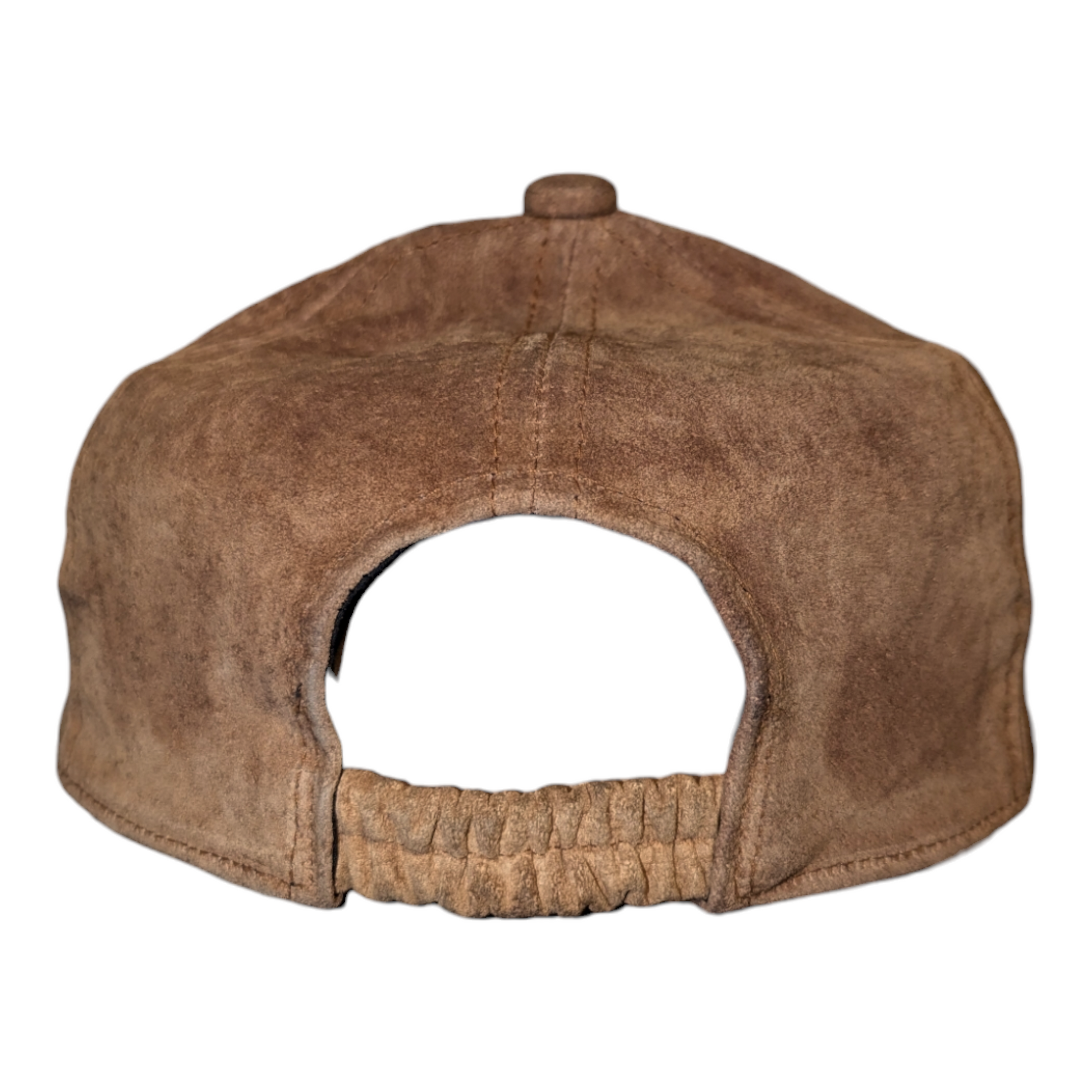 Description: Vintage 90s Genuine Leather baseball cap hat, standard 6 panel, with stretch elastic back, nice brown tan colorway, natural tones
