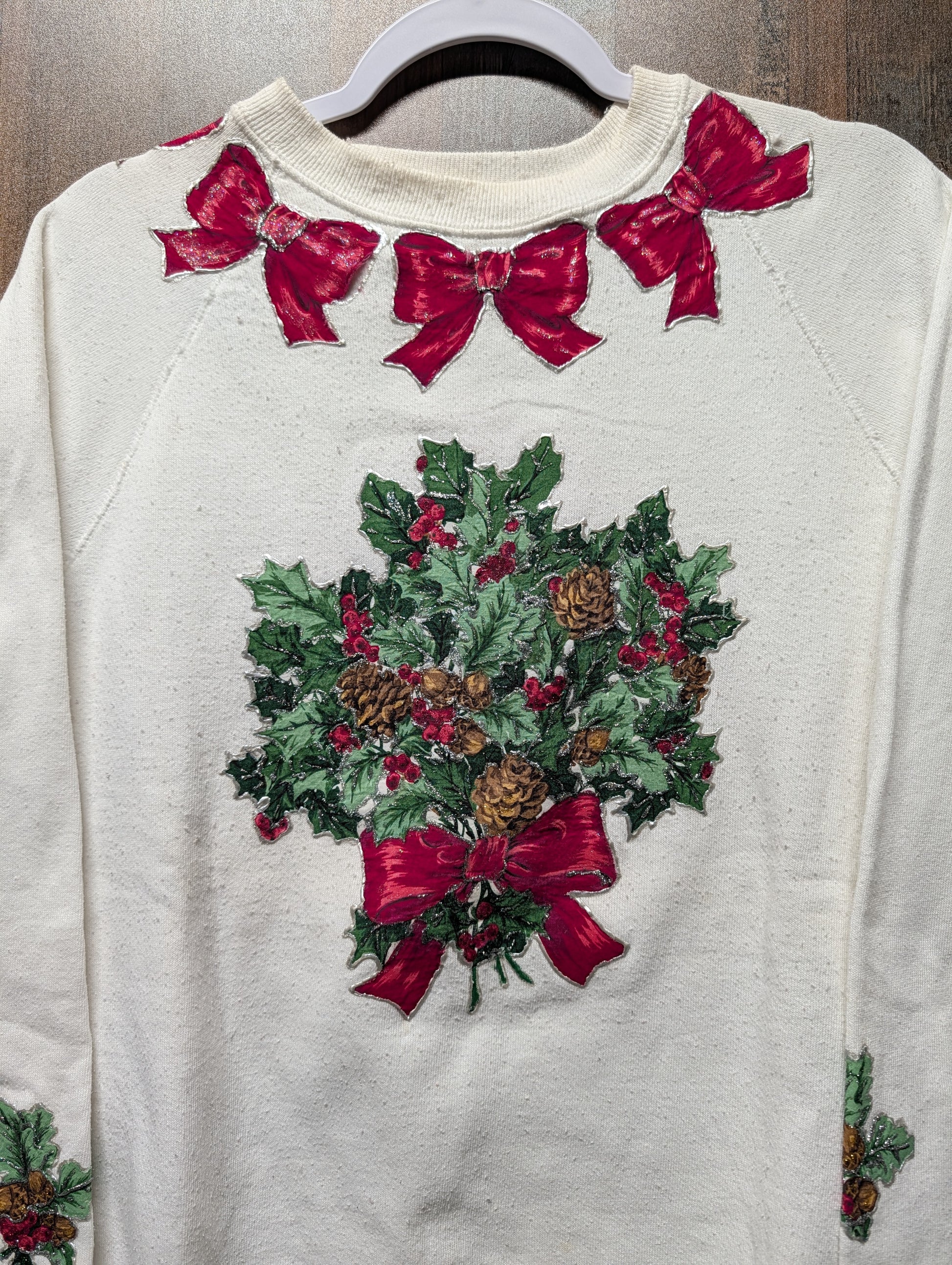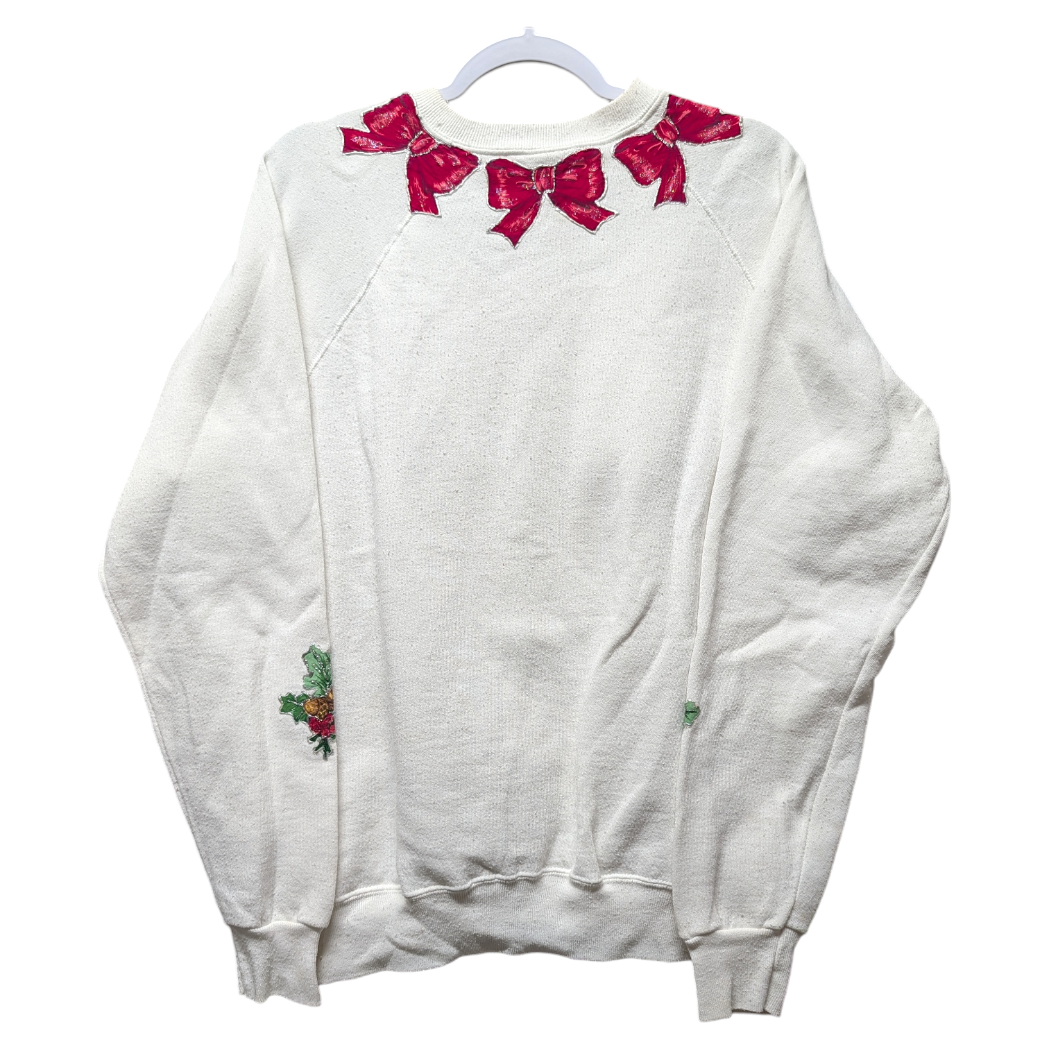 Description: Vintage 90s Handmade Christmas Crewneck Sweatshirt, Ribbon bow design, glitter glue, Christmas Wreath, front back and sleeve designs, white red and green, perfect for the holidays, cute design, winter sweater