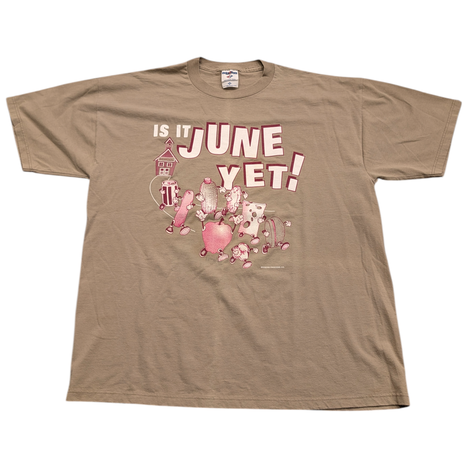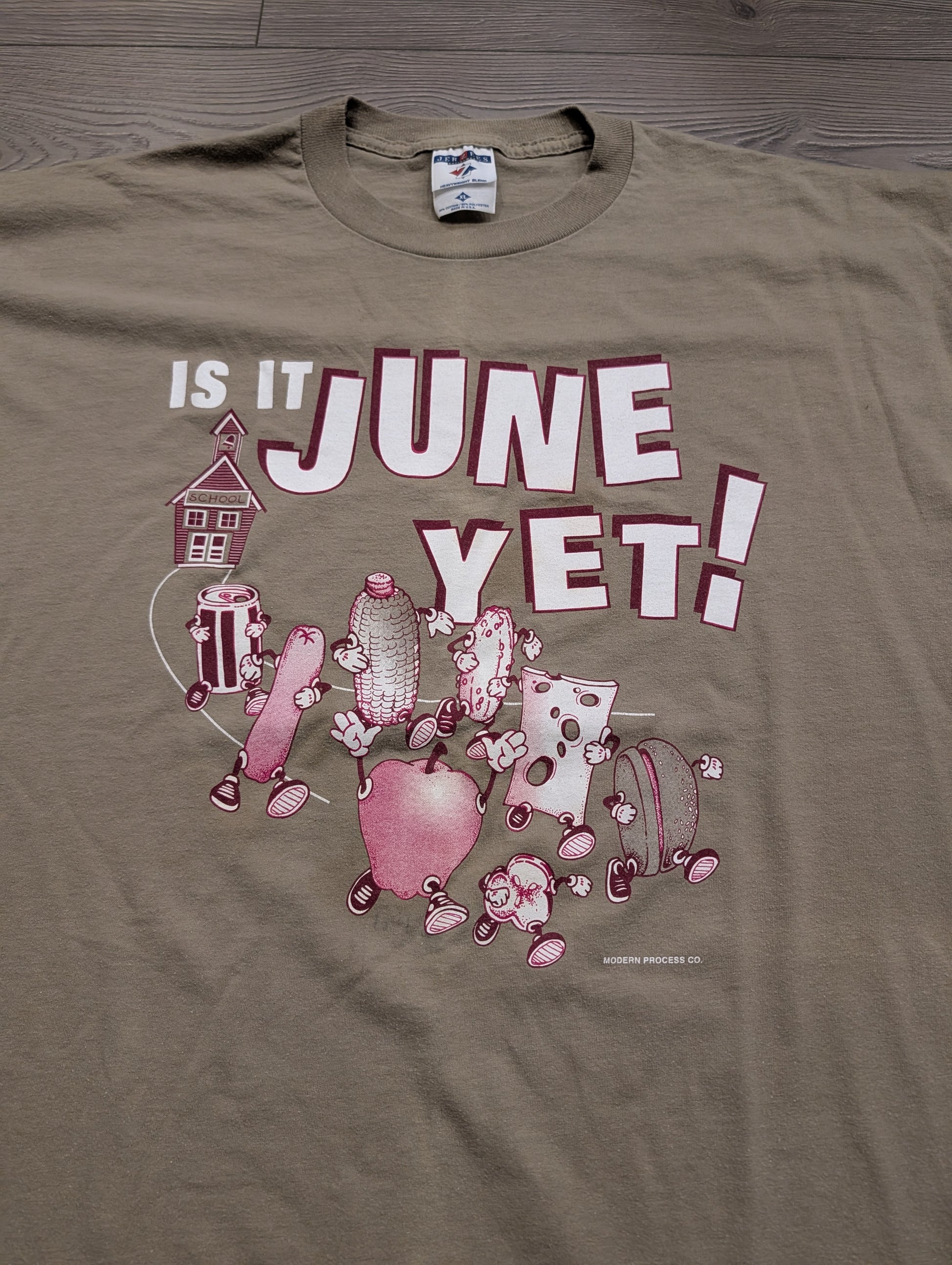 Description: Vintage 90's Is it June Yet T shirt, Tan brown khaki red, Teacher Humor, schools out, summer time, Picnic food, comedy, running food, hot dog, apple, pickle, soda, cheese, corn, animated food, modern process co.