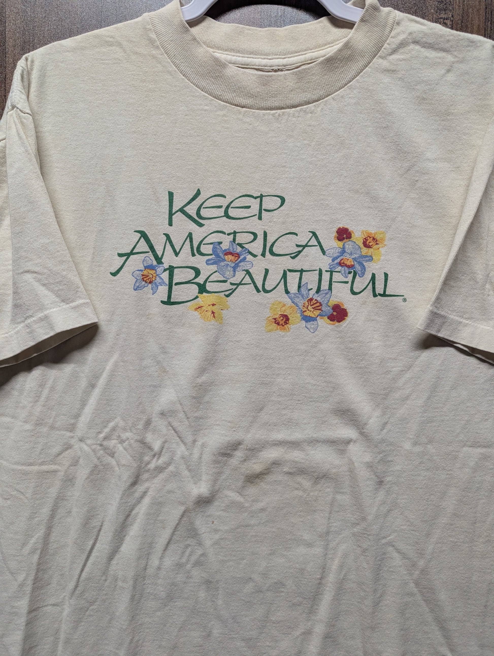 Description: Vintage 90s Keep America Beautiful Flower T Shirt, white and green, front graphic only, quote tee, Nature, cute floral design