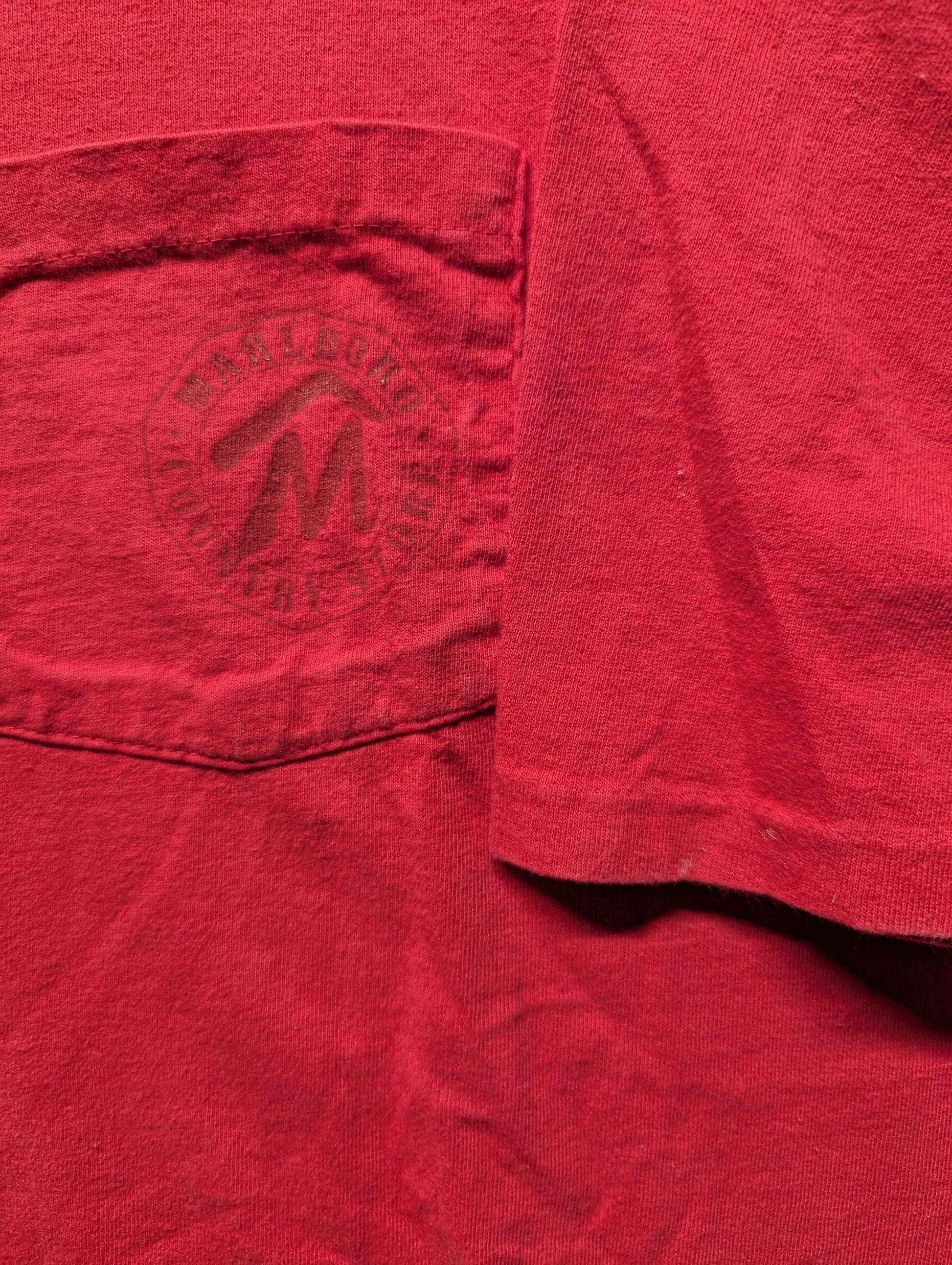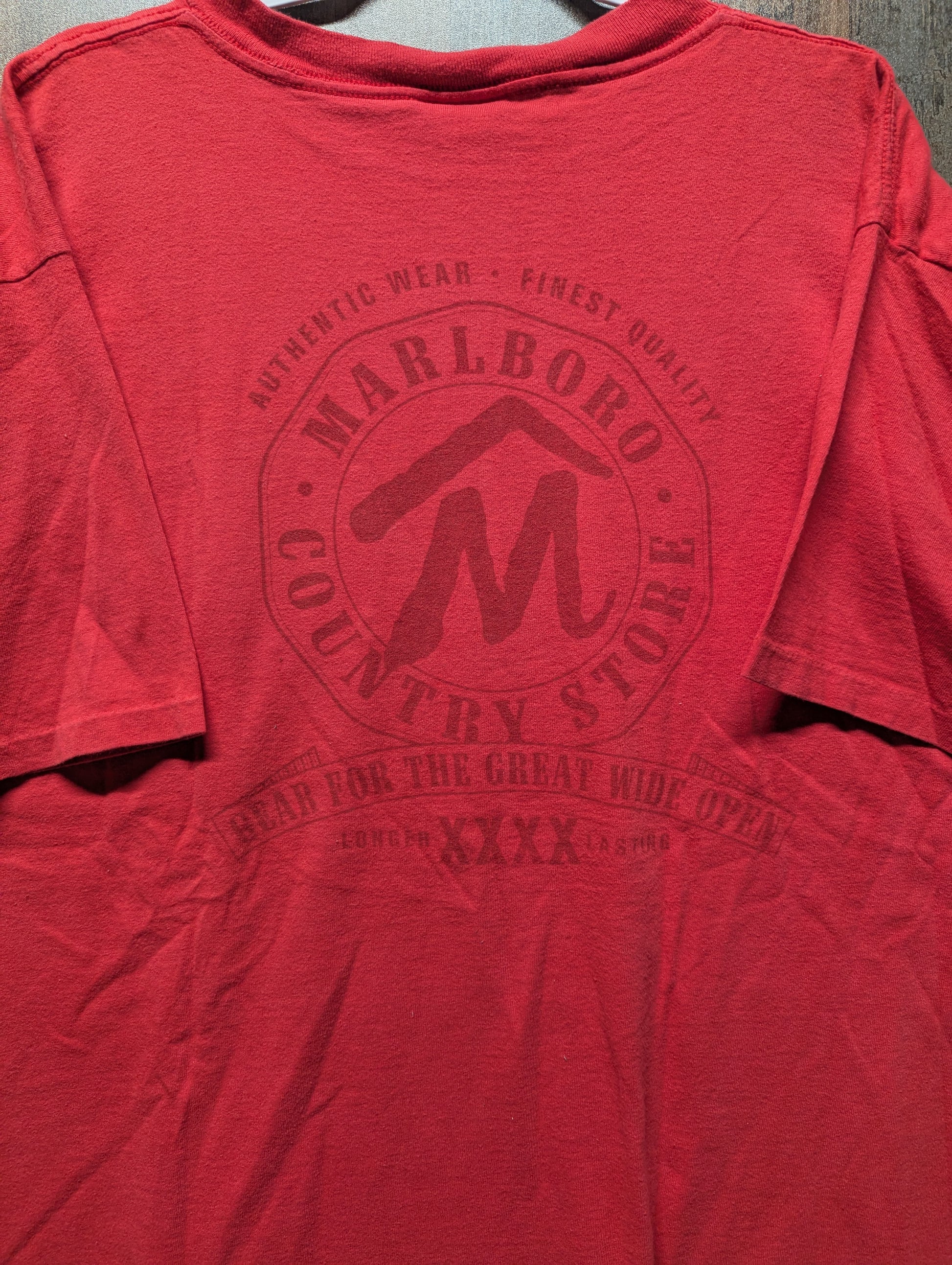 Description: Vintage 90s Marlboro Country Store Pocket T shirt, front and back graphic, cigarette promo, classic western feel, all red, promotional shirt, tobacco, outdoor gear