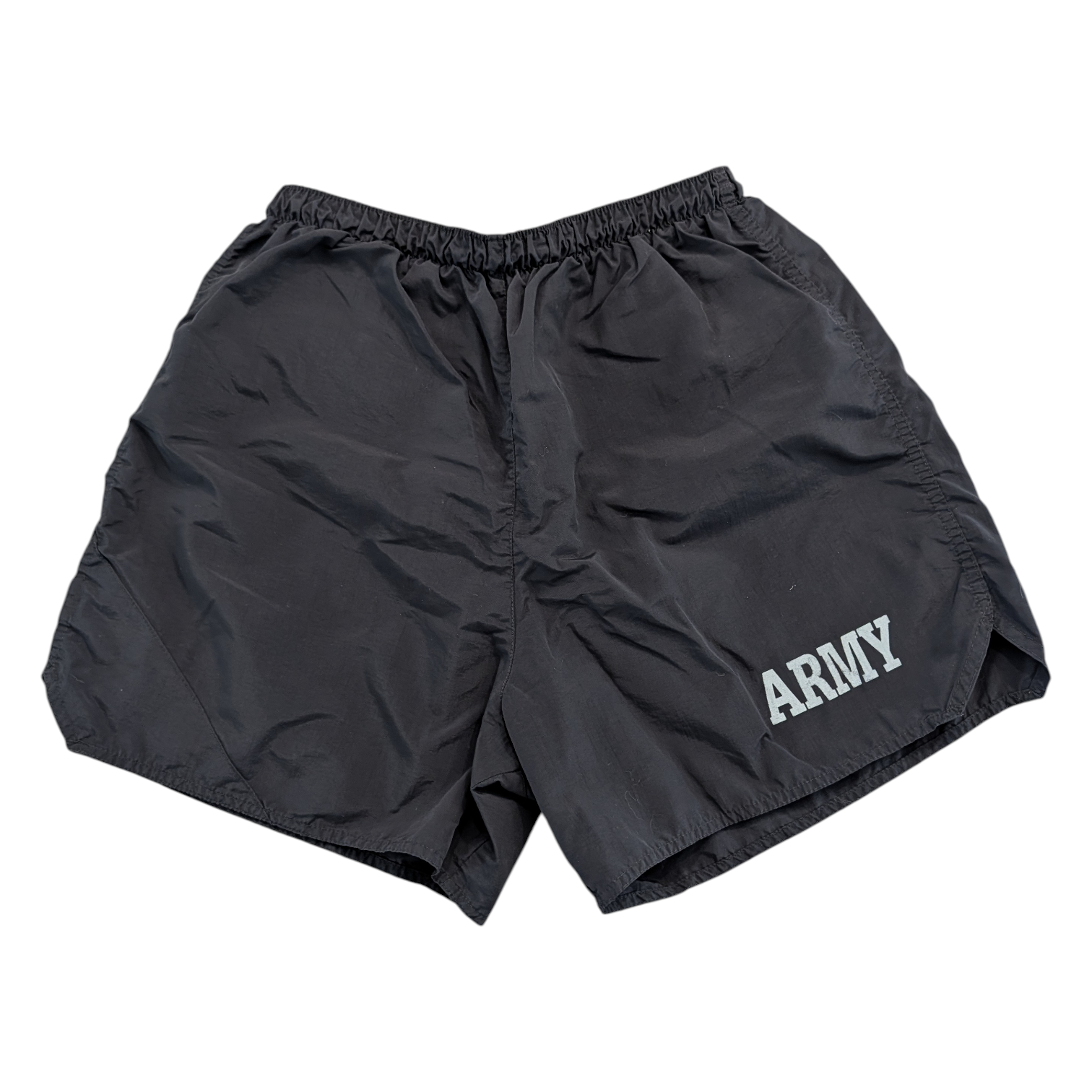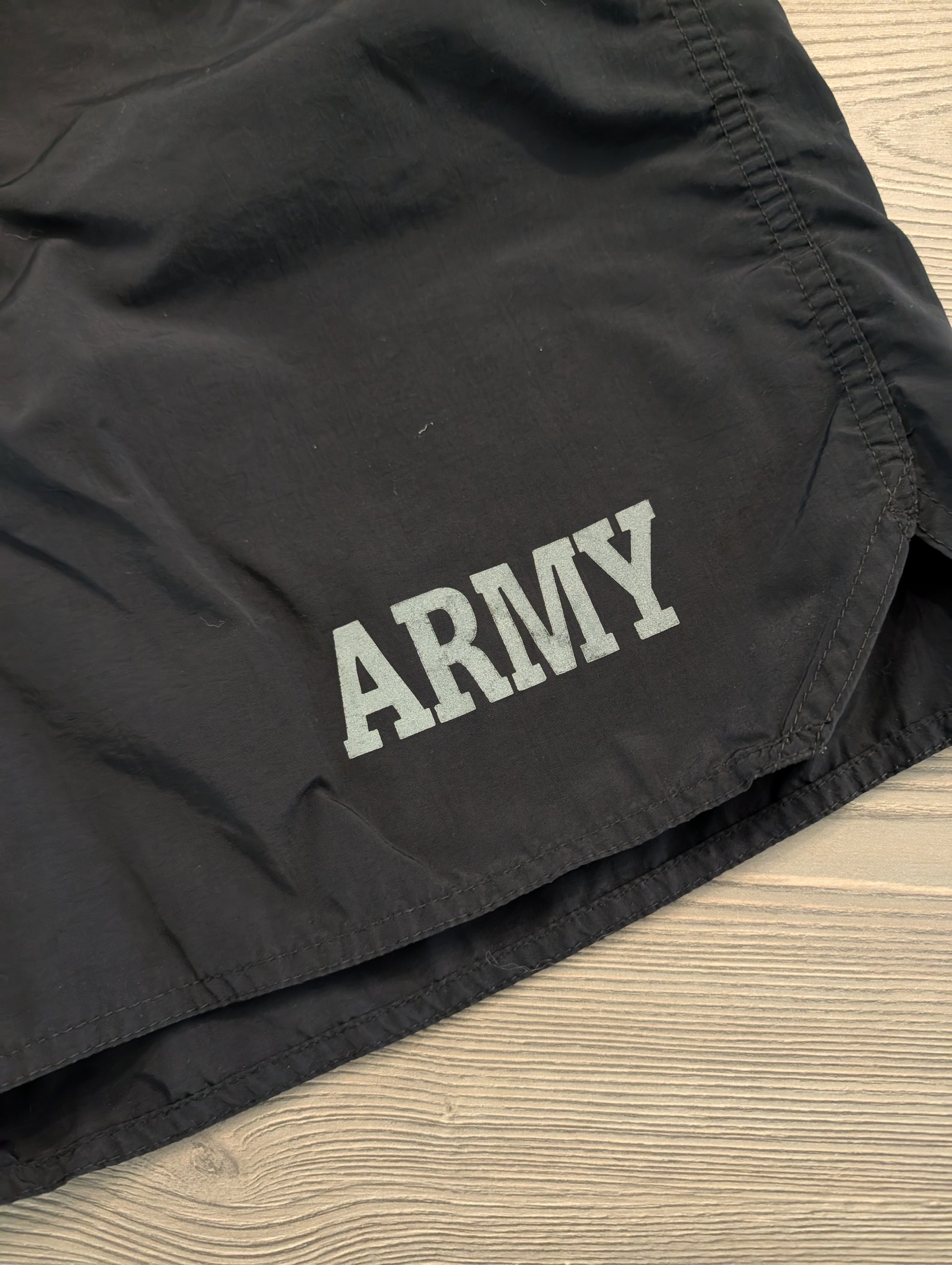 Description: Vintage 90's Nylon Army shorts, lined, Black with Reflective lettering, Elastic Stretch Cinch waist, Athletic Shorts, Military Training, Small key pocket on outside and inside