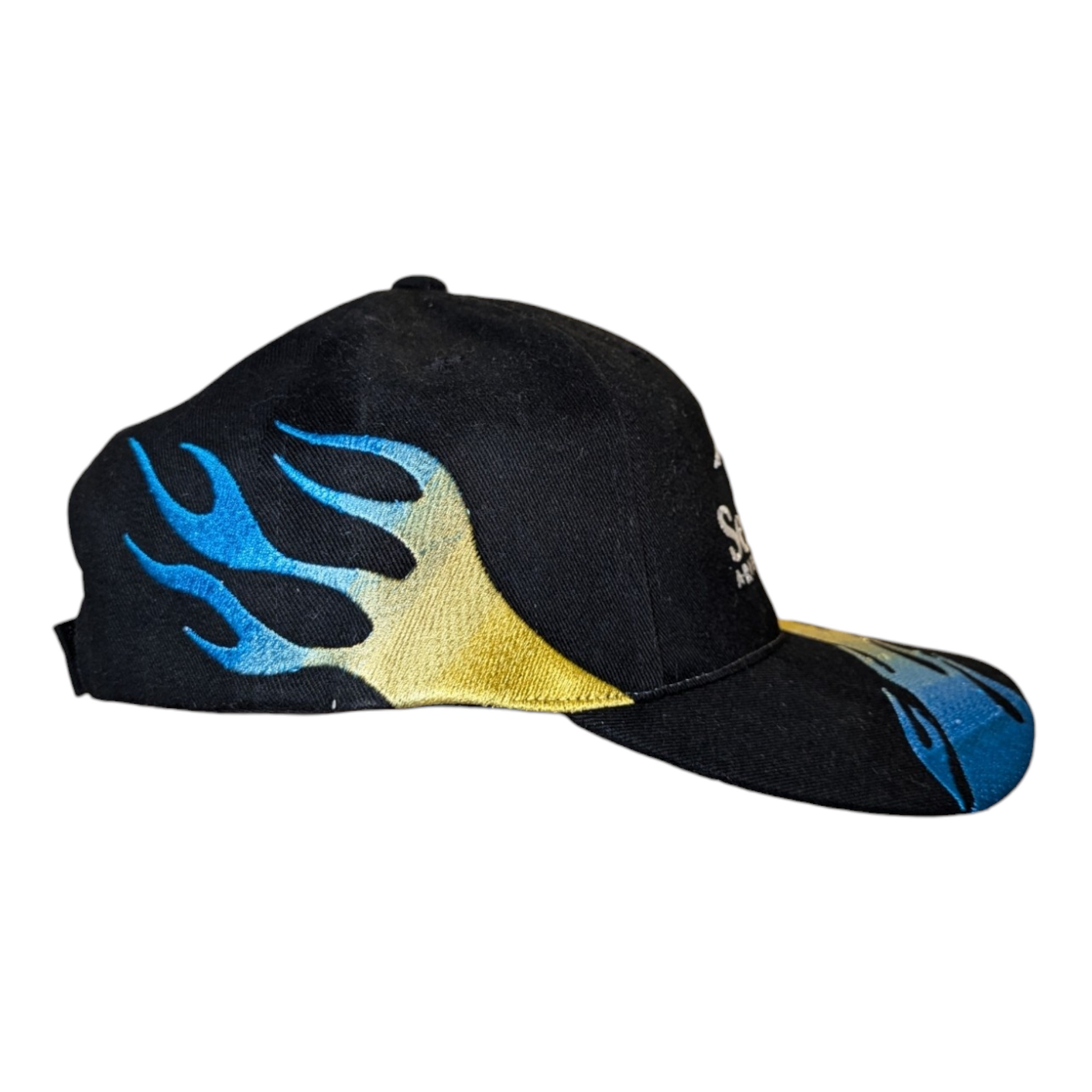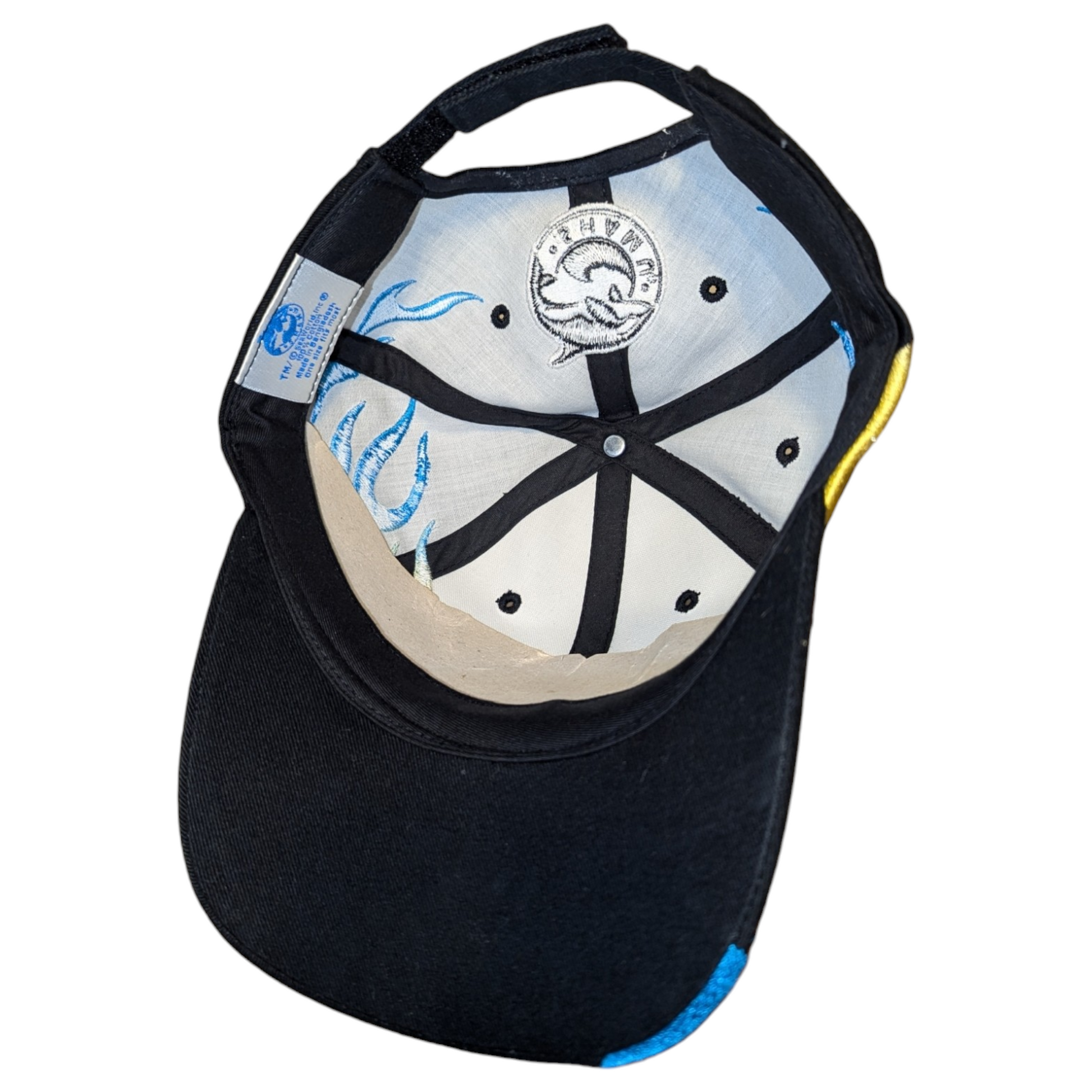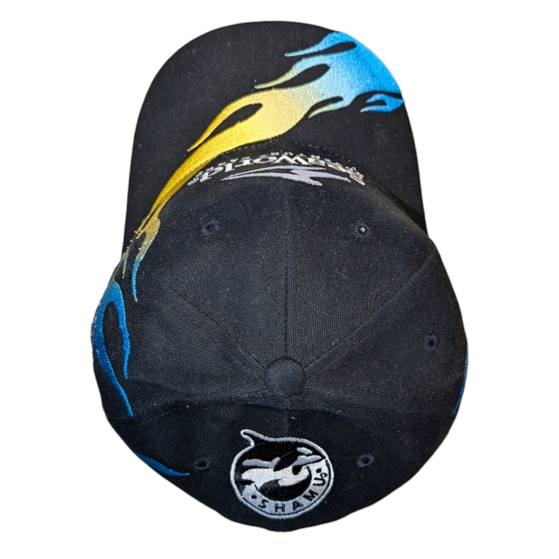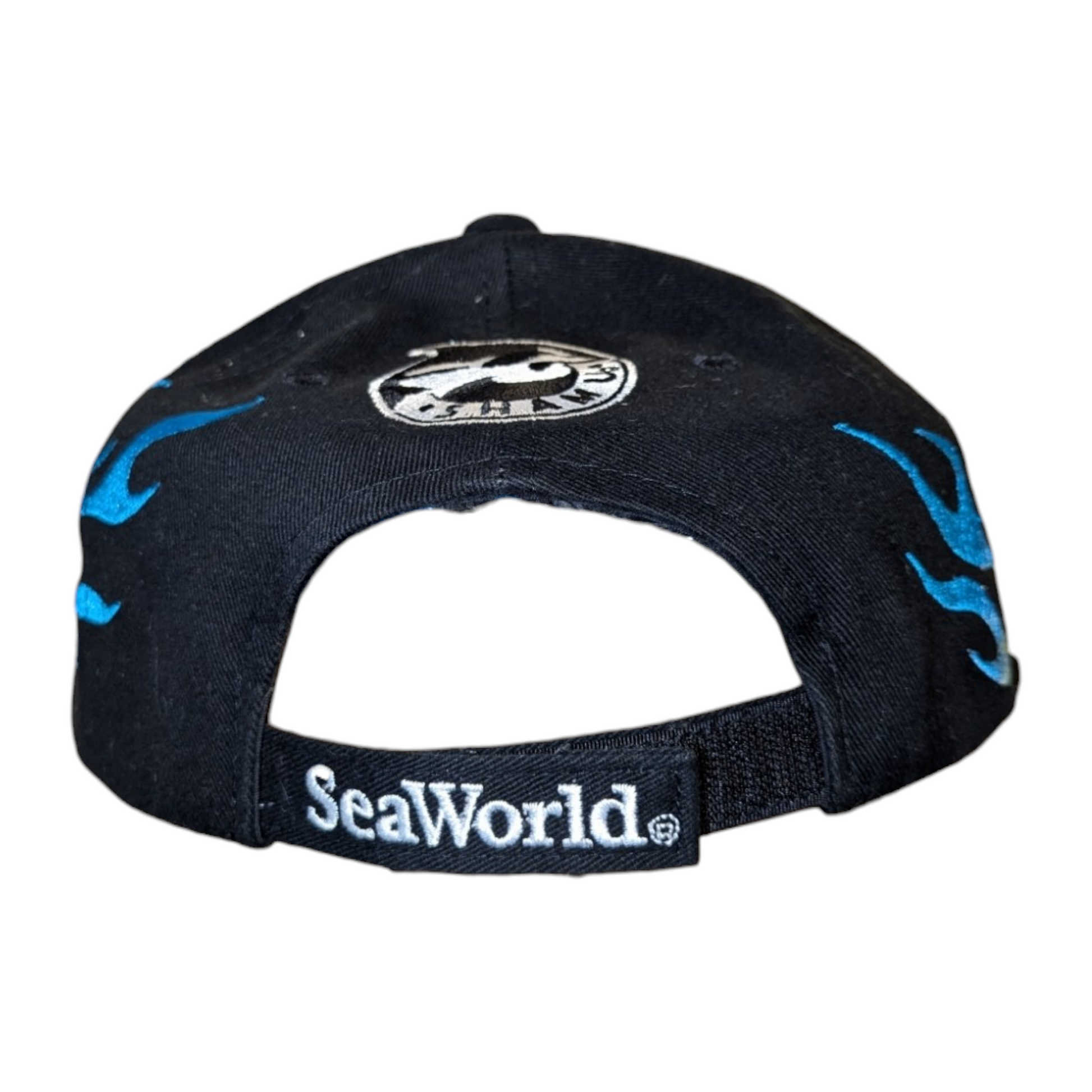 Description: Vintage 90s Sea World Flame hat, Embroidered graphic, aop, black white blue and yellow, sea world adventure parks, Shamu whale, nature animal cap, Velcro Back