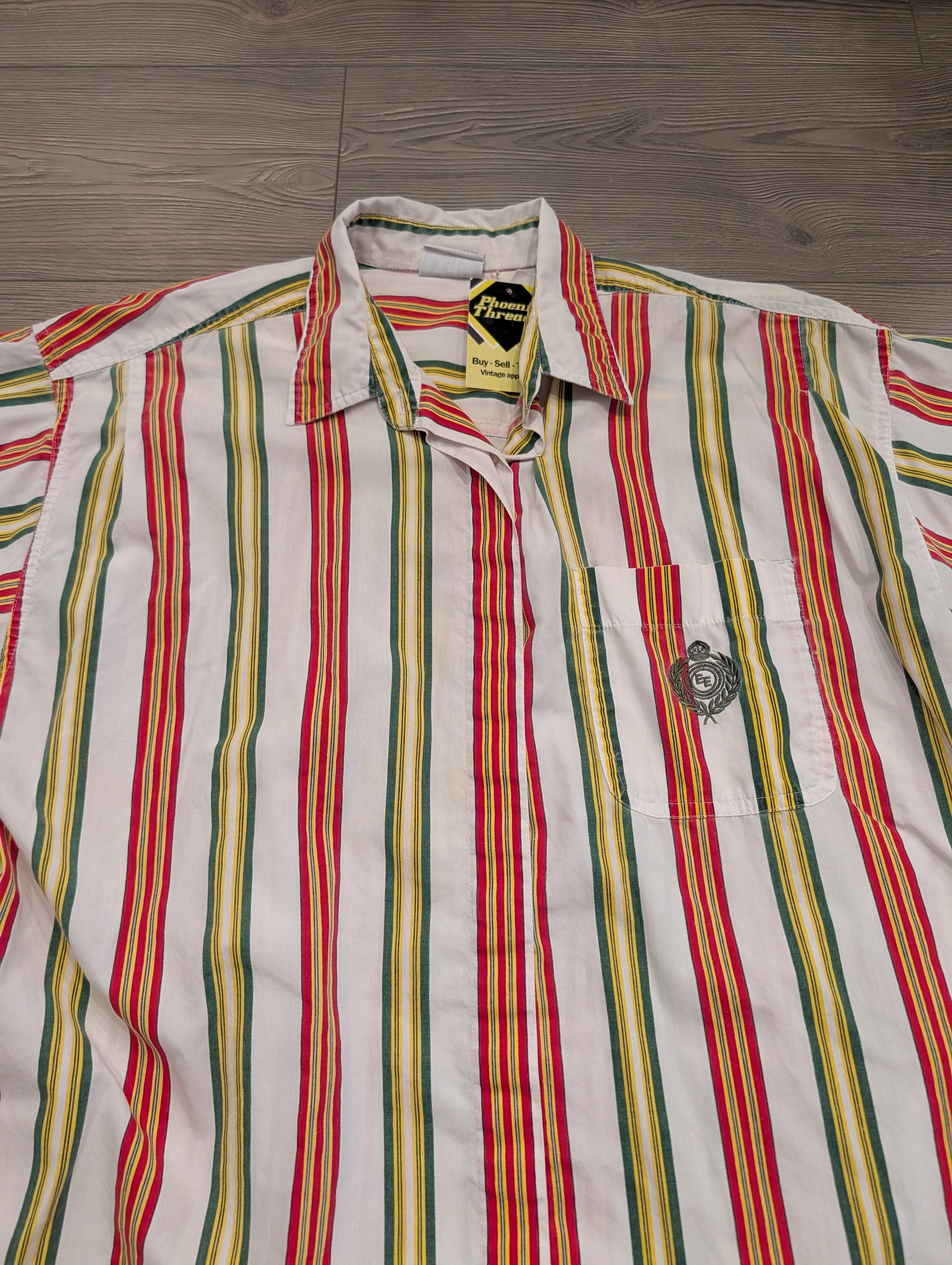 Description: Vintage 90's Vertical Striped Button Up Short Sleeve Shirt, White red green yellow, Embroidered logo on pocket, Extra Elements, EE, Soft, covered button, Hipster,
