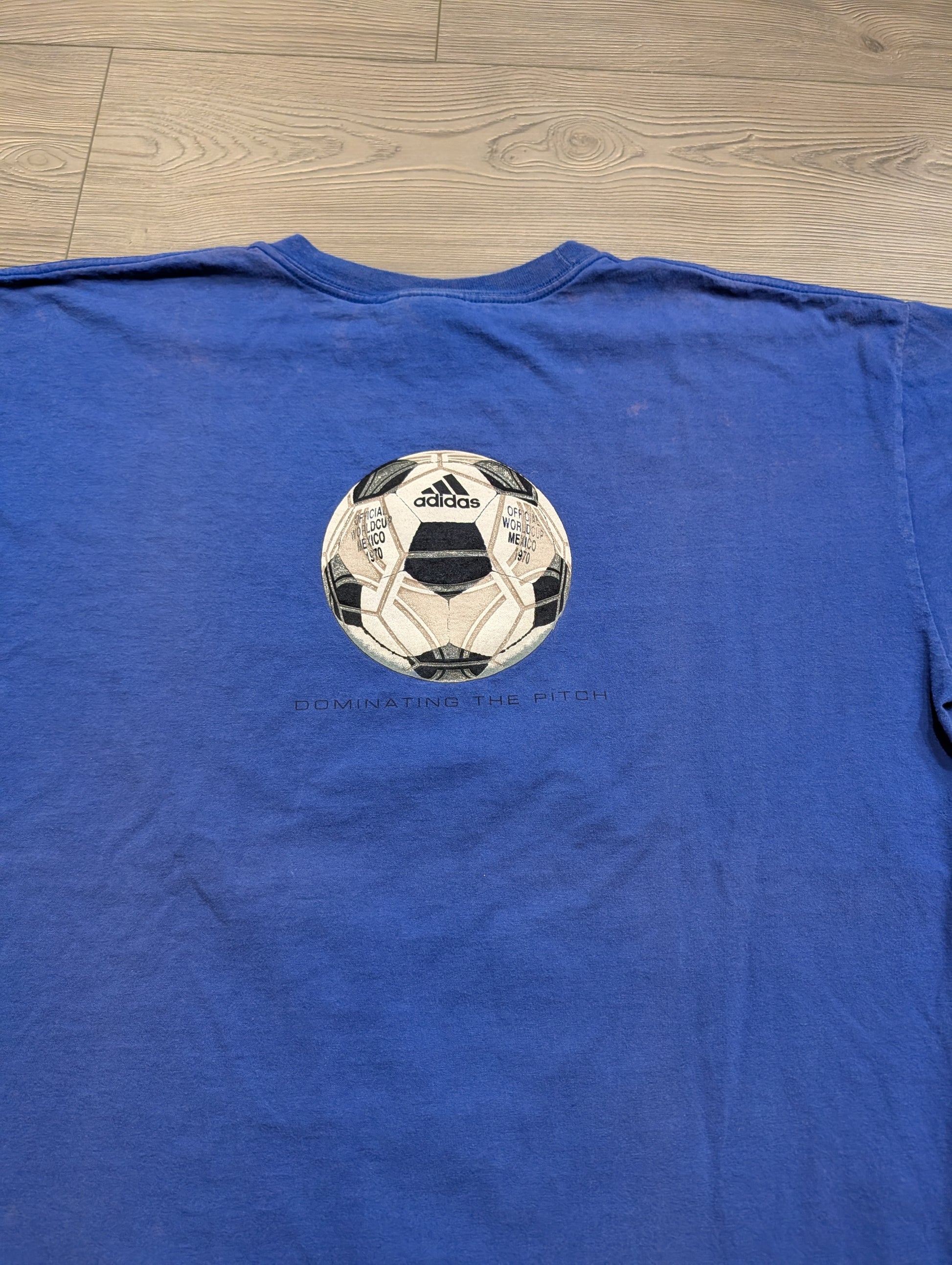 Description: Vintage '90s/Y2K Adidas World Cup Mexico 1970 Dominating the Pitch Graphic T shirt , Blue white black, Soccer, World Sports, Athletic, football, futbol, footie