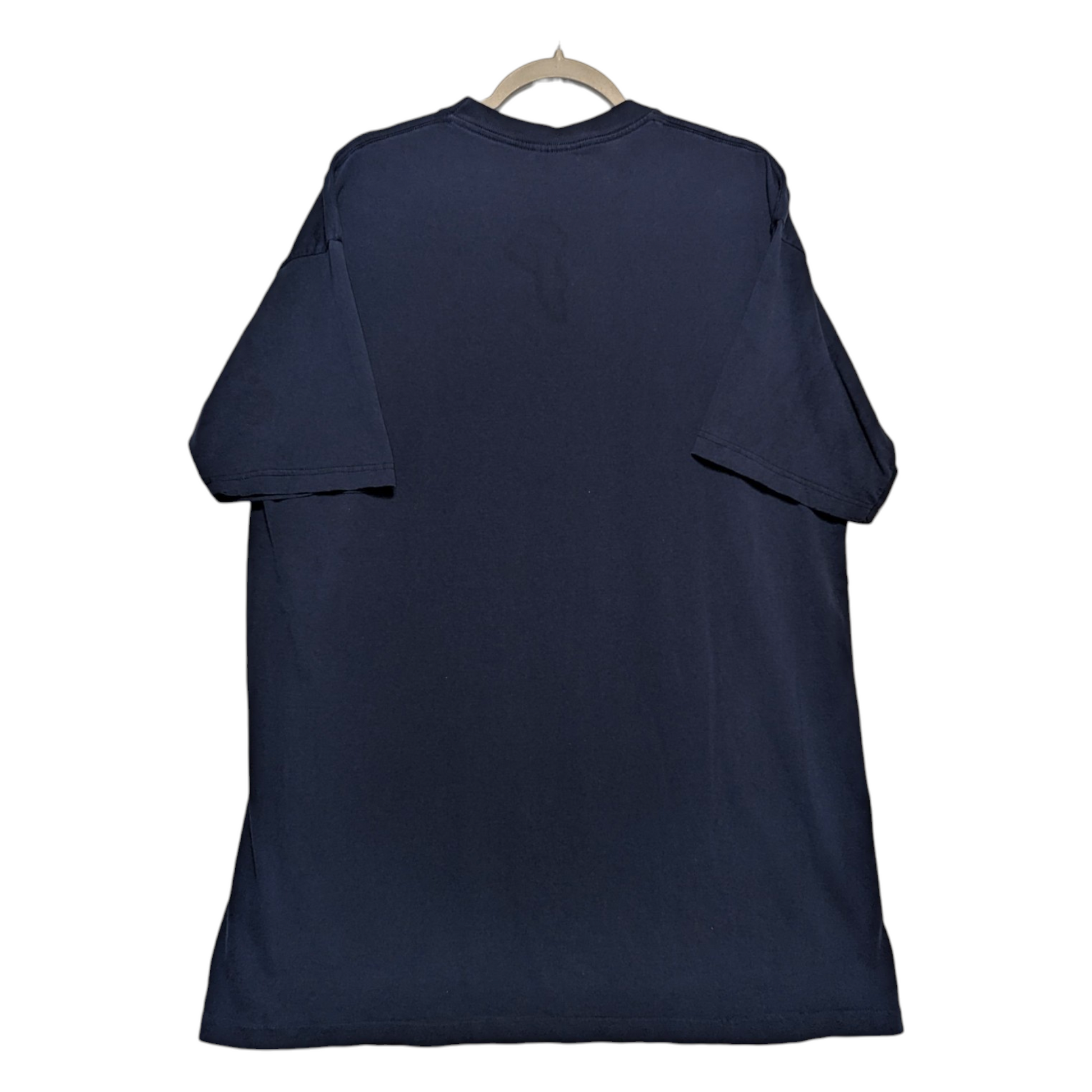 Description: Vintage 90s / Y2K NYC Graffiti character t shirt, JNCO Skate tee vibes, Cybercore, urban streetwear, city graphic, front graphic only, blue gray and yellow