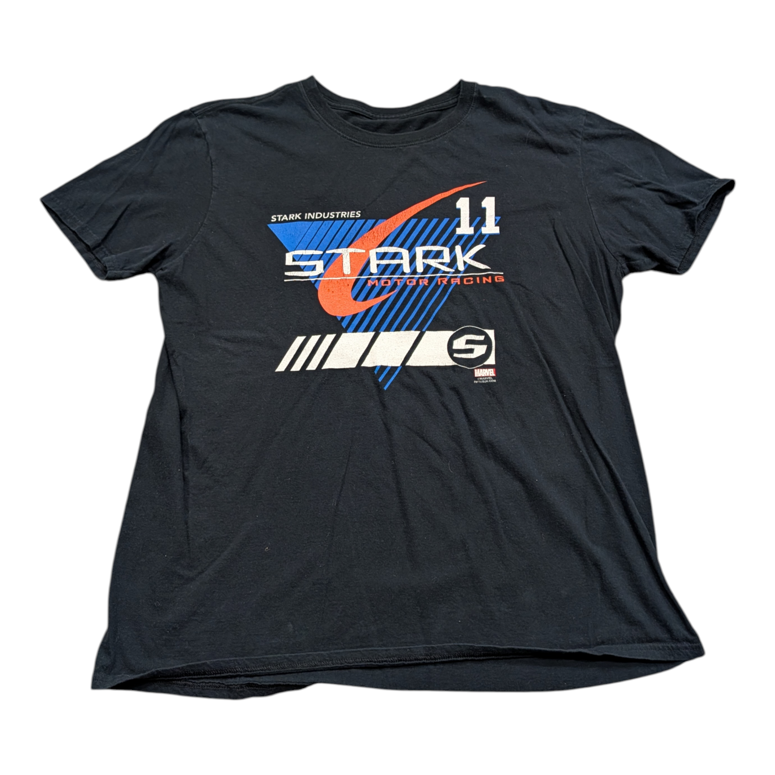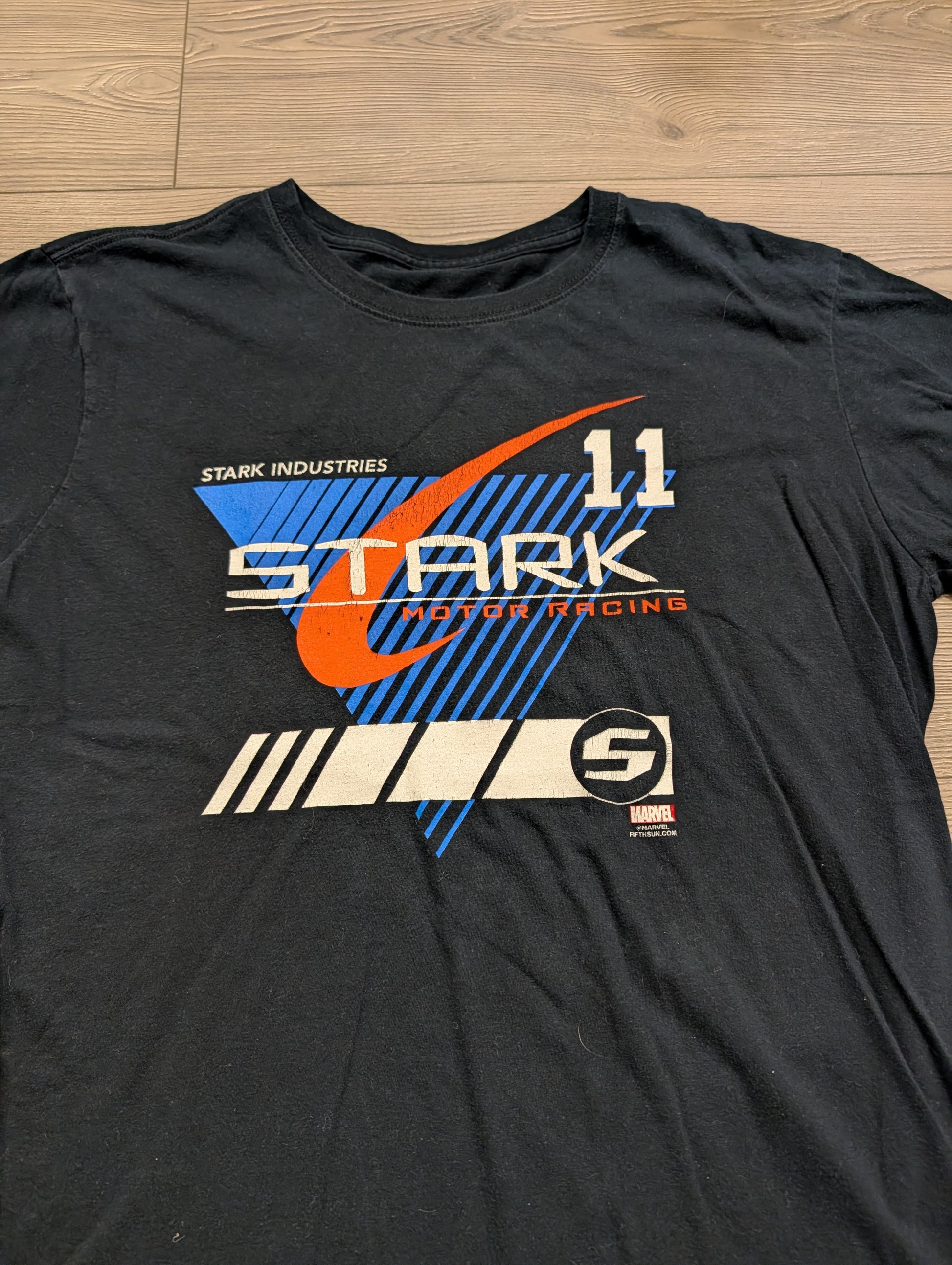Description: Modern Stark Industries Motor Racing T shirt, Black blue orange white, Marvel, Tony Stark, 11, Fifthsun.com, Movie, Super Hero, IronMan