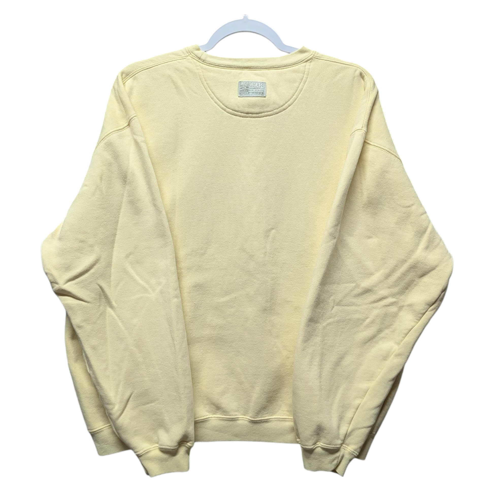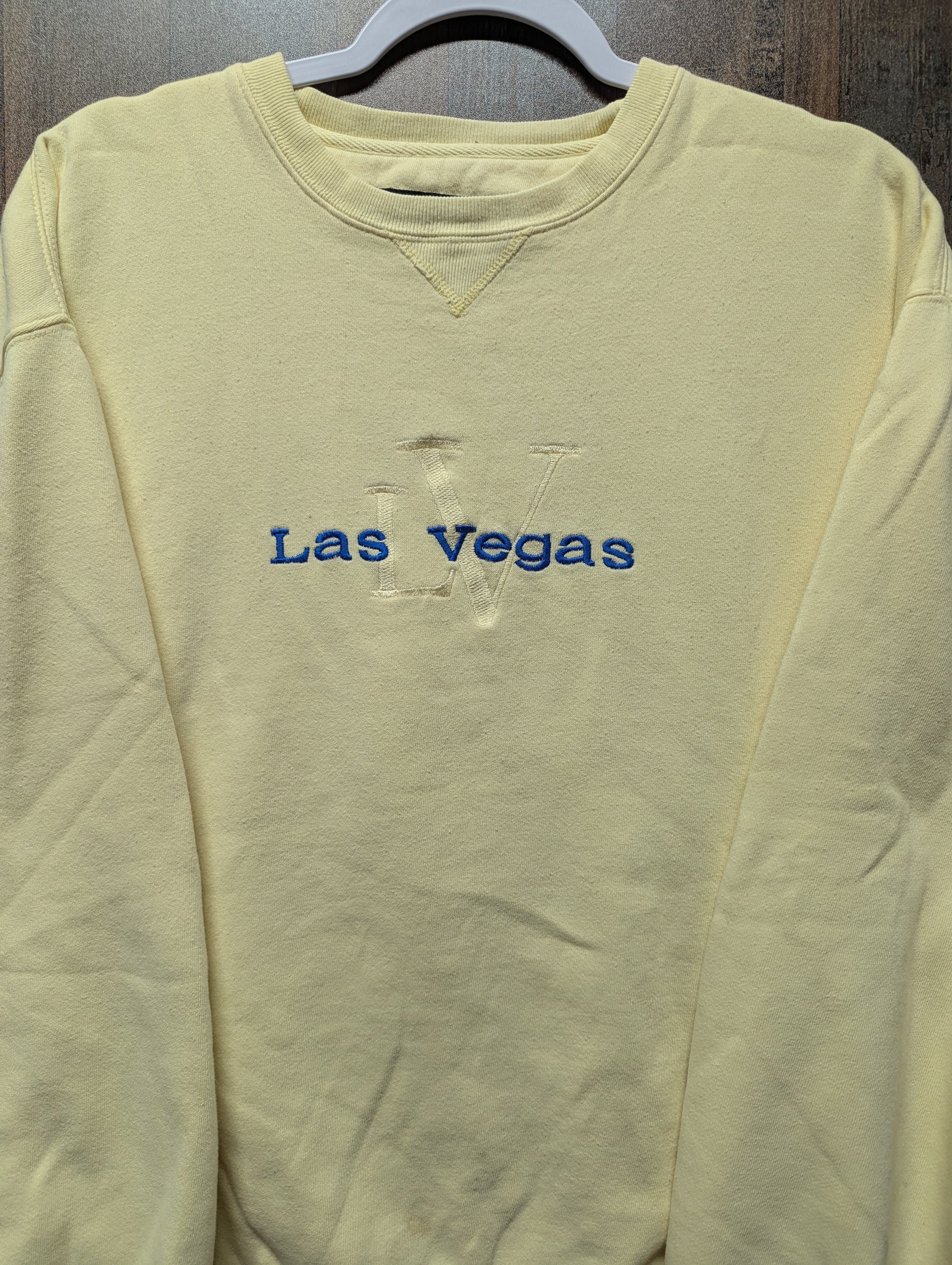 Description: Vintage Y2K Las Vegas Nevada Location Crewneck Sweatshirt, Yellow and blue, embroidered graphic on the front only, Small Leather Gear for sports patch on the back, perfect for fall and winter months, LV design