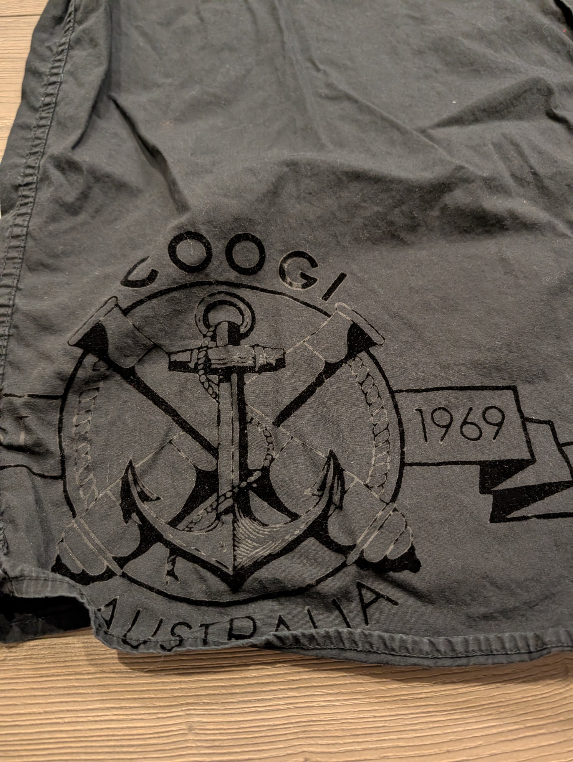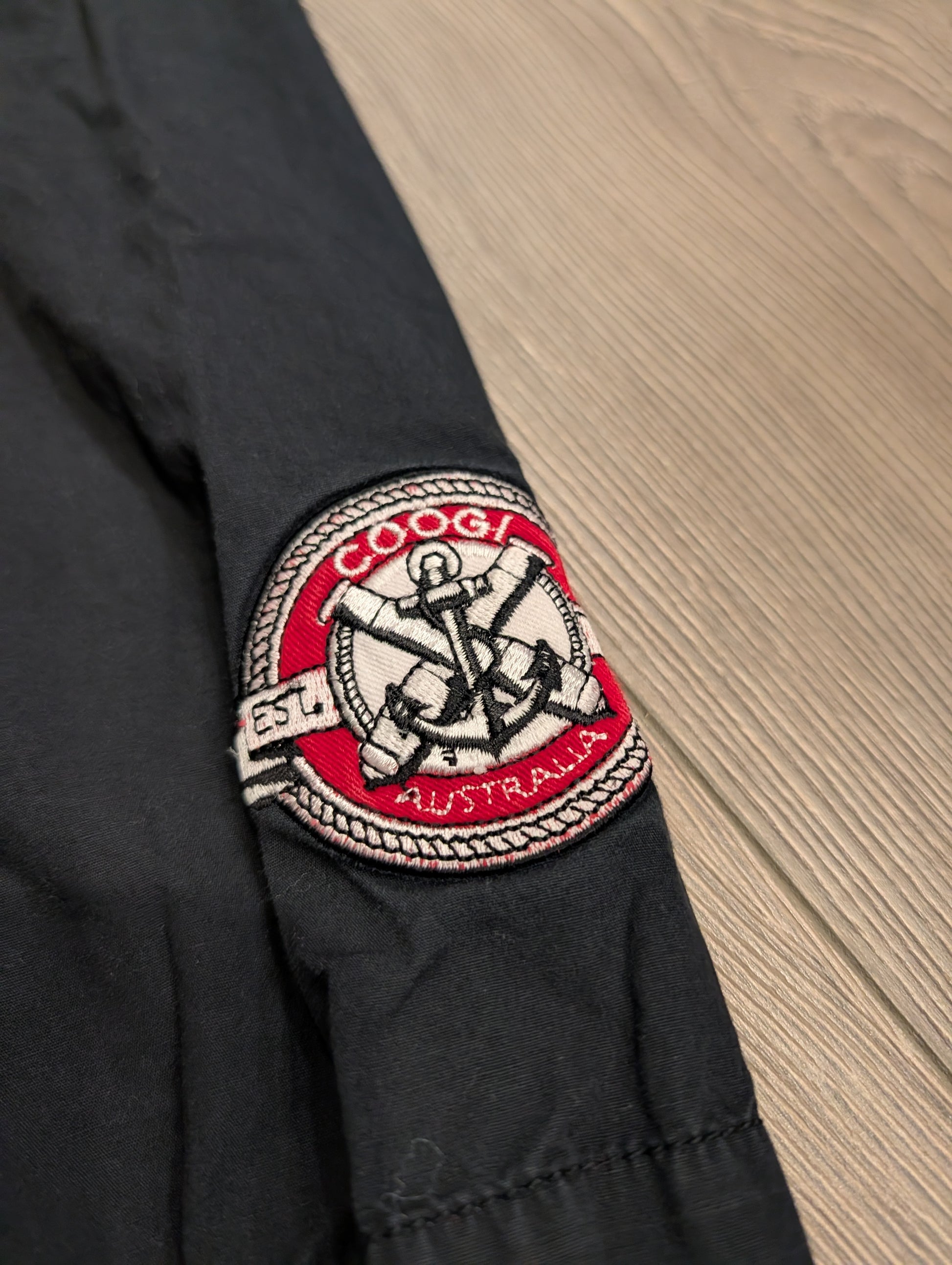 Description: Y2K/Modern Coogi Casual Short Sleeve Button-Up Shirt, Black with red and white stripes, Embroidered badges on sleeves and front pockets and back, Large Velvet anchor Australia graphic on the front bottom of the shirt